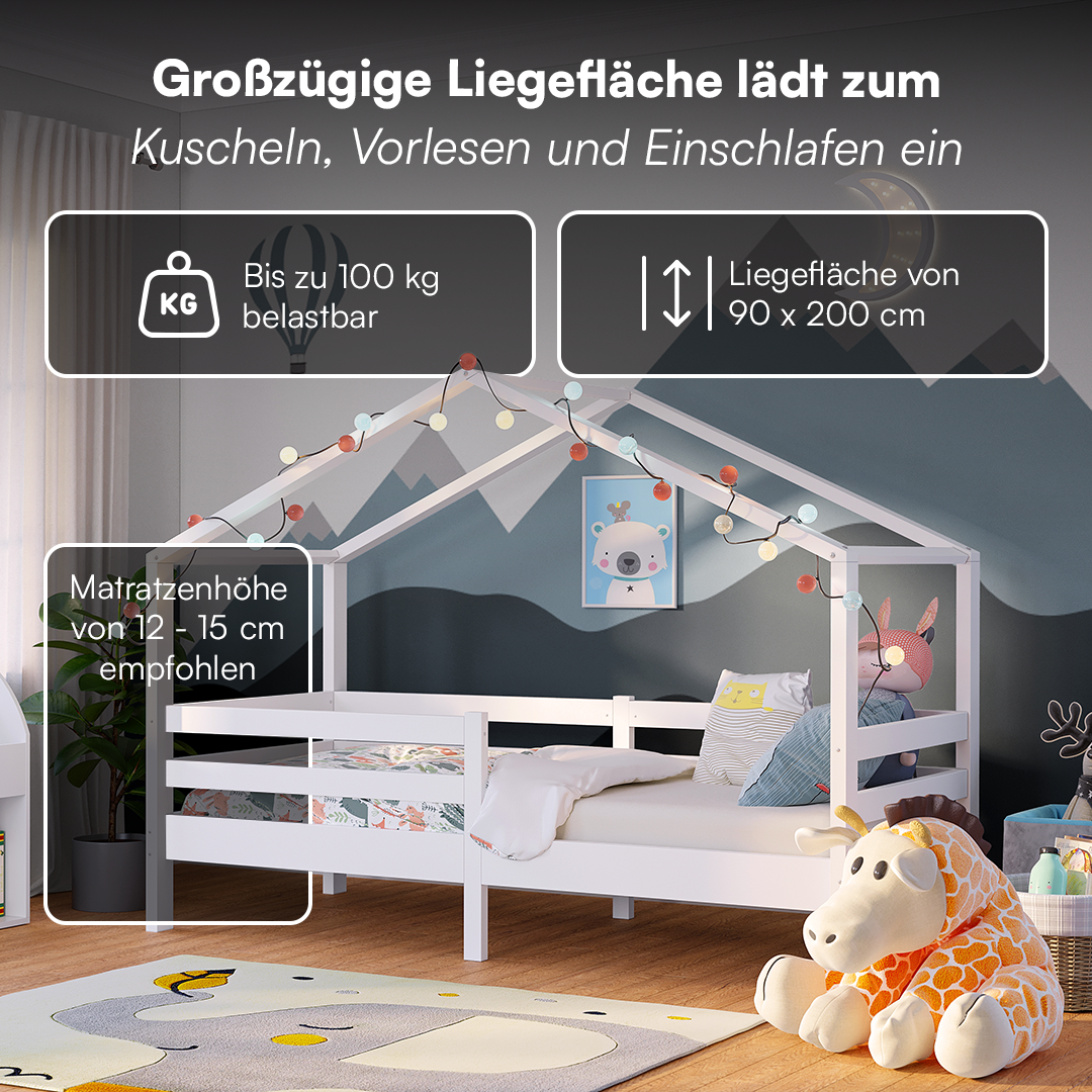 Abia Hausbett 90x200 cm mit Matratze, weiß, Kiefer Massivholz, Montessori Kinderbett mit Rausfallschutz und Lattenrost