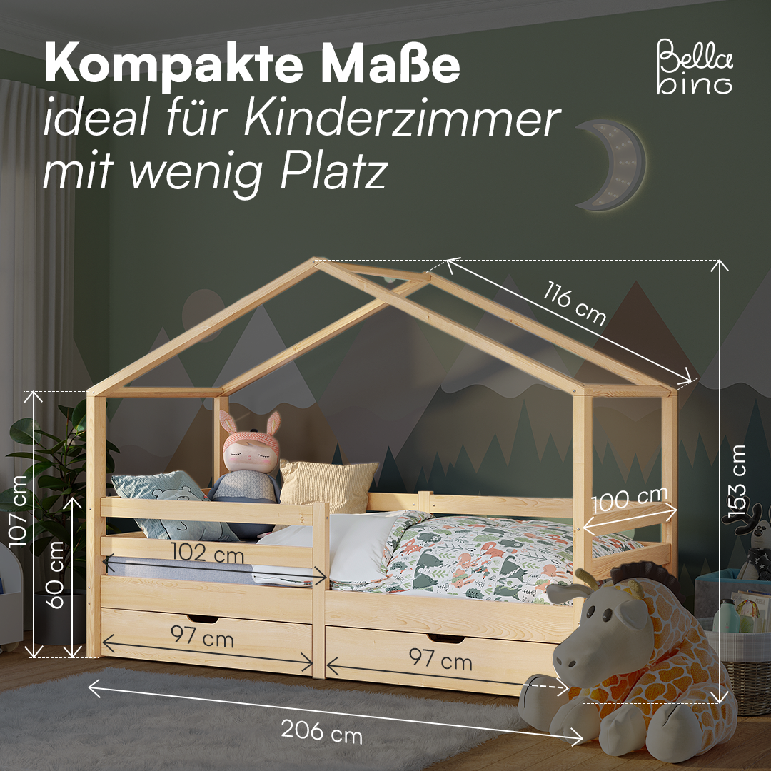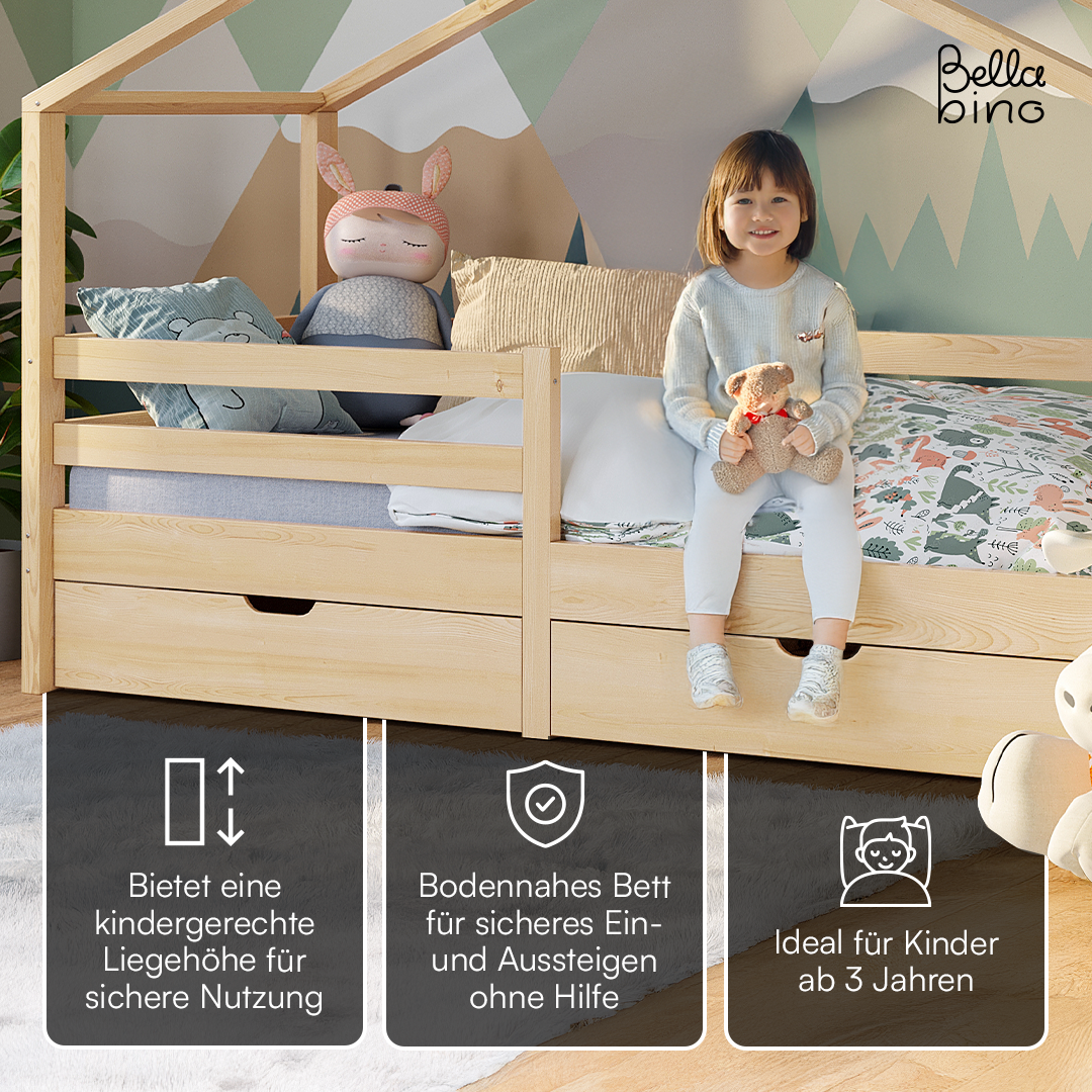 Das Hausbett Abia ist ideal für Kinder, die selbstständig schlafen lernen. Die bodentiefe Konstruktion ermöglicht ein sicheres Ein- und Aussteigen ohne Hilfe. Mit seiner liebevoll gestalteten Hausform wird das Bett schnell zum Lieblingsort im Kinderzimmer und regt die Fantasie beim Spielen an. Die großzügige Liegefläche von 90x200 cm mit umlaufendem Rausfallschutz bietet Sicherheit und Komfort – ein passender Lattenrost ist bereits enthalten. Zwei integrierte Schubladen schaffen zusätzlichen Stauraum für Spielzeug oder Kleidung und sorgen für Ordnung, auch in kleineren Räumen. Gefertigt aus massivem Kiefernholz, ist das Bett stabil, langlebig und bis 100 kg belastbar – perfekt für den Alltag mit Kindern.