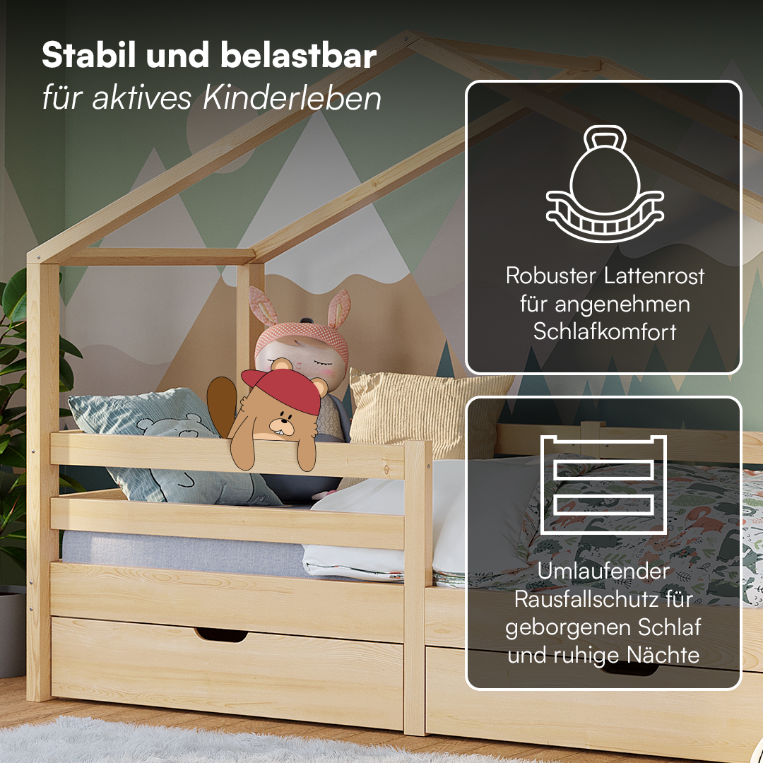 - Lieferumfang: Hausbett mit 2 Schubladen inkl. Rausfallschutz und Lattenrost
