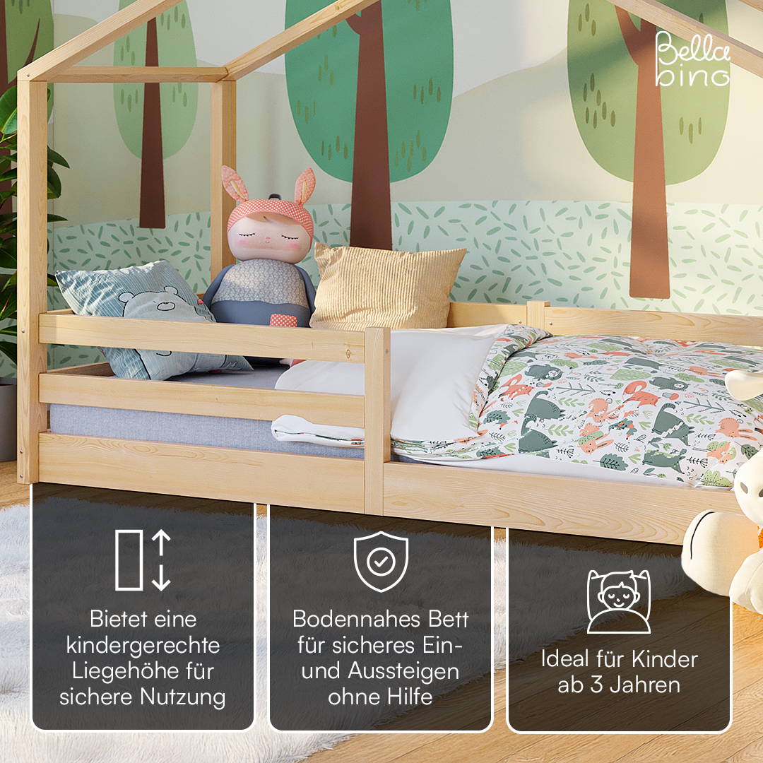 Das Hausbett Abia bietet Kindern ab etwa 1,5 Jahren einen sicheren und selbstständigen Einstieg ins eigene Bett. Die bodennahe Konstruktion ermöglicht ein gefahrloses Ein- und Aussteigen ganz ohne Hilfe.
