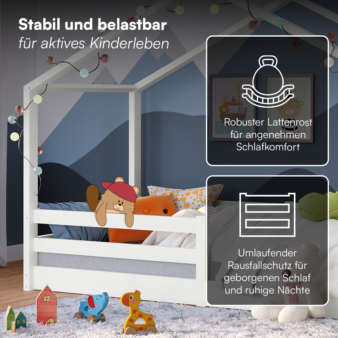 Gefertigt aus robustem Kiefernholz und MDF in Weiß, überzeugt das Bett durch Stabilität und Langlebigkeit. Es hält bis zu 100 kg aus und ist ideal für Schlafen und Spielen geeignet.