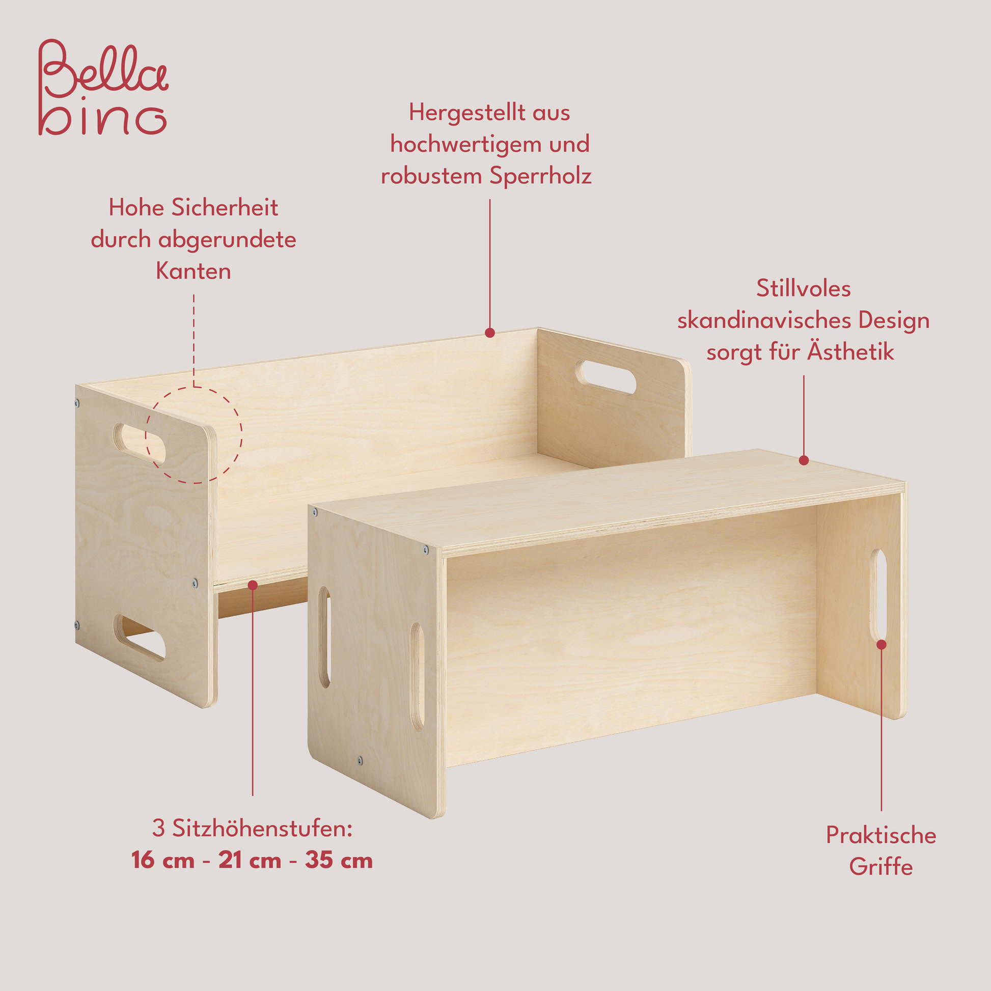 Die 'Aki' 2in1-Wendebank von Bellabino ist ein vielseitiges Sitzelement für das Kinderzimmer, das zum Spielen und Entspannen einlädt. Mit dieser Bank gestalten Sie den Raum Ihres Kindes spielerisch und bieten gleichzeitig Komfort und Funktionalität.