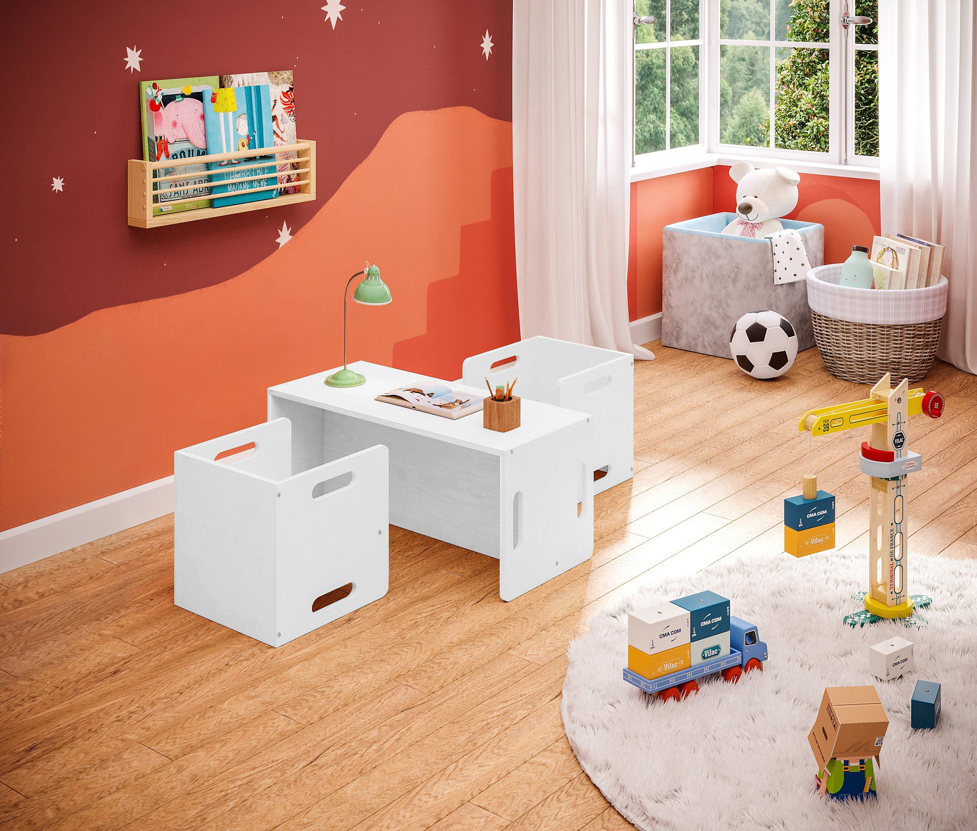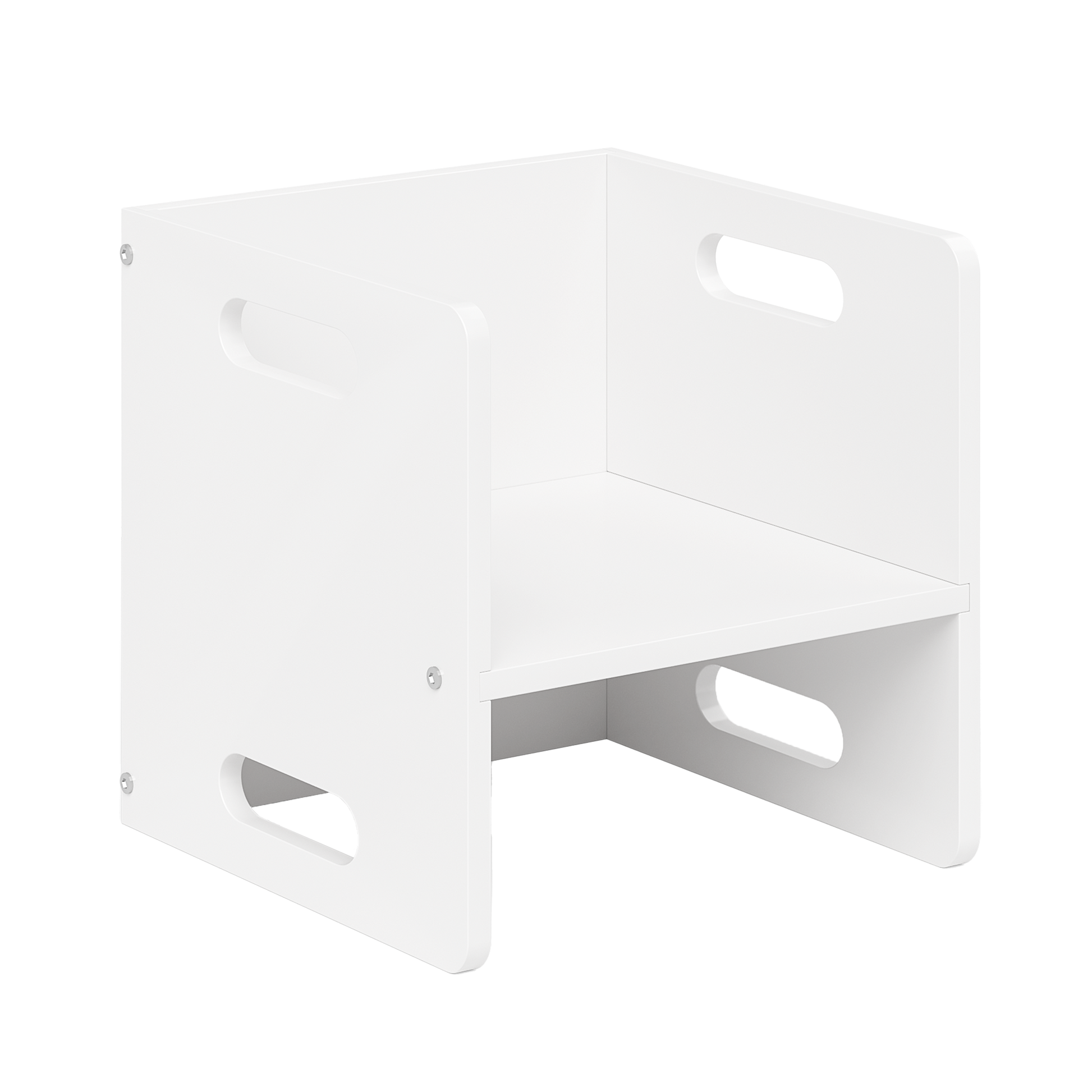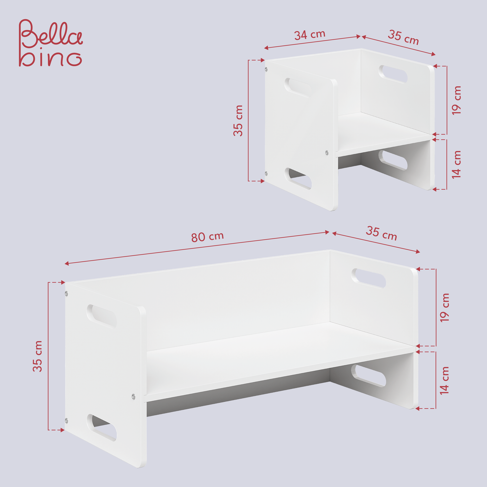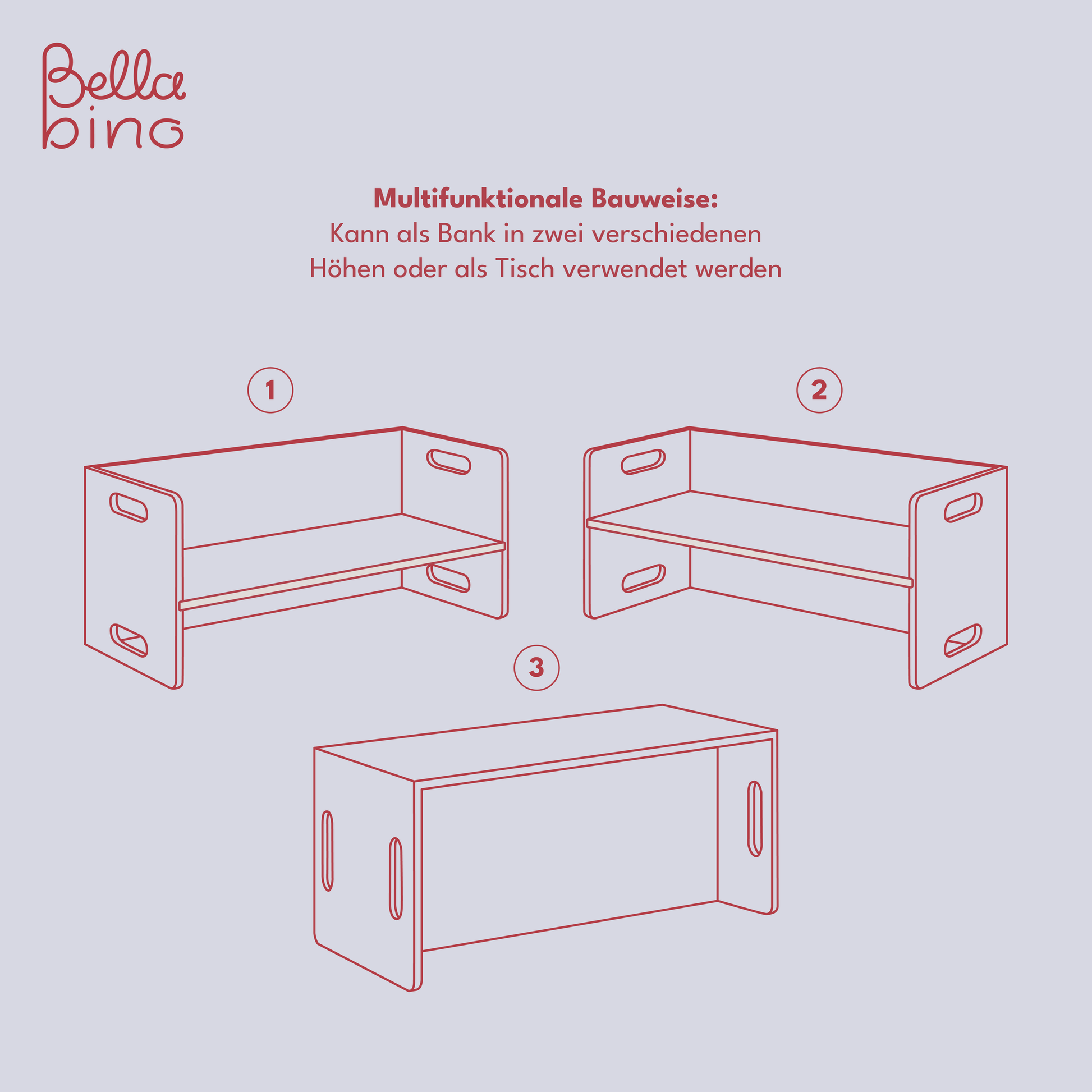 Bestehend aus zwei Stühlen (34 x 35 x 35 cm) und einer Bank (80 x 35 x 35 cm), sind alle Elemente mit einer ergonomisch geformten Sitzfläche ausgestattet. Die 180-Grad-Drehfunktion ermöglicht drei verschiedene Sitzhöhen und flexible Anpassung an verschiedene Körpergrößen. Die vielseitige Nutzung als Sitzgelegenheit oder Tisch bietet Flexibilität für Spiele und kreative Aktivitäten.