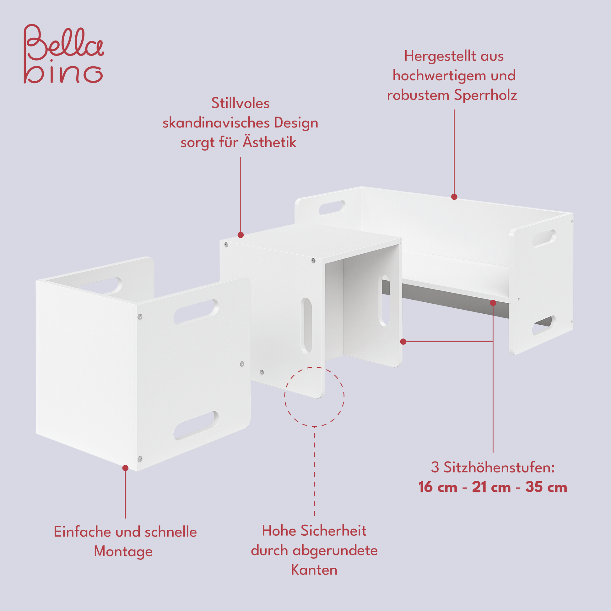 - 3 Sitzhöhenstufen: 14 cm, 16 cm, 35 cm