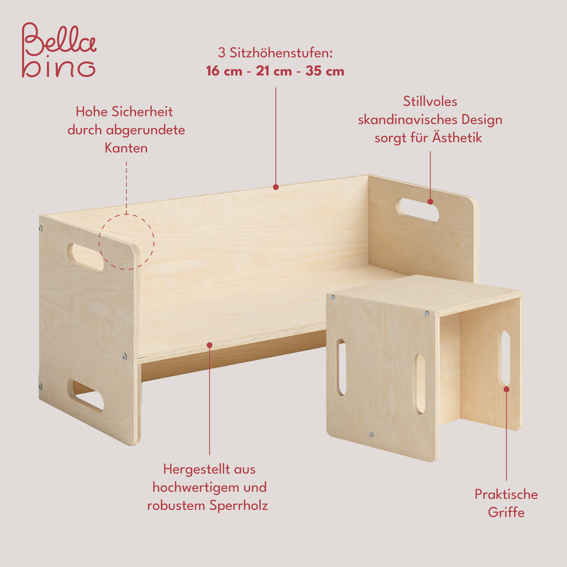 Die Sitzgarnitur 'Aki' umfasst einen Stuhl mit den Maßen B 34 x T 35 x H 35 cm und eine Bank mit den Maßen B 80 x T 35 x H 35 cm, beide mit ergonomisch geformten Sitzflächen, die Ihrem Kind eine bequeme und sichere Sitzposition garantieren. Diese Sitzelemente können um 180 Grad gedreht werden, wodurch die Sitzhöhe flexibel an verschiedene Körpergrößen angepasst werden kann. Diese Drehfunktion ermöglicht es, den Stuhl und die Bank nicht nur als Sitzgelegenheit, sondern auch als Tisch zu verwenden.