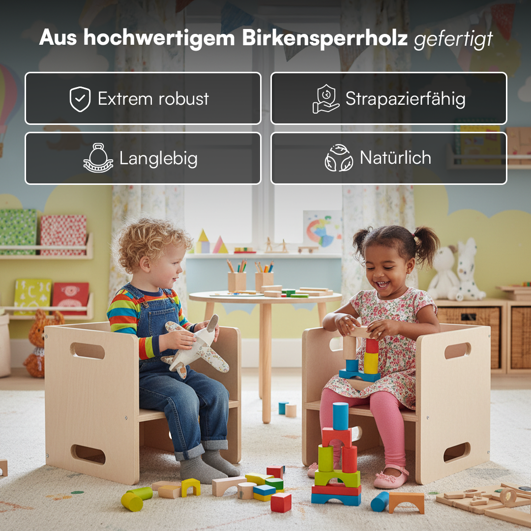 'Aki' gewährleistet eine natürliche und sichere Umgebung für Ihre Kinder, dank der hochwertigen Materialien und der stabilen Bauweise. Das unbehandelte Birken-Sperrholz ist robust und langlebig, während die ergonomisch geformte Sitzfläche eine bequeme und angenehme Sitzposition bietet. Das kindgerechte Design und die warme Holzoptik harmonieren perfekt mit verschiedenen Einrichtungsstilen und schaffen im Kinderzimmer eine gemütliche Atmosphäre.