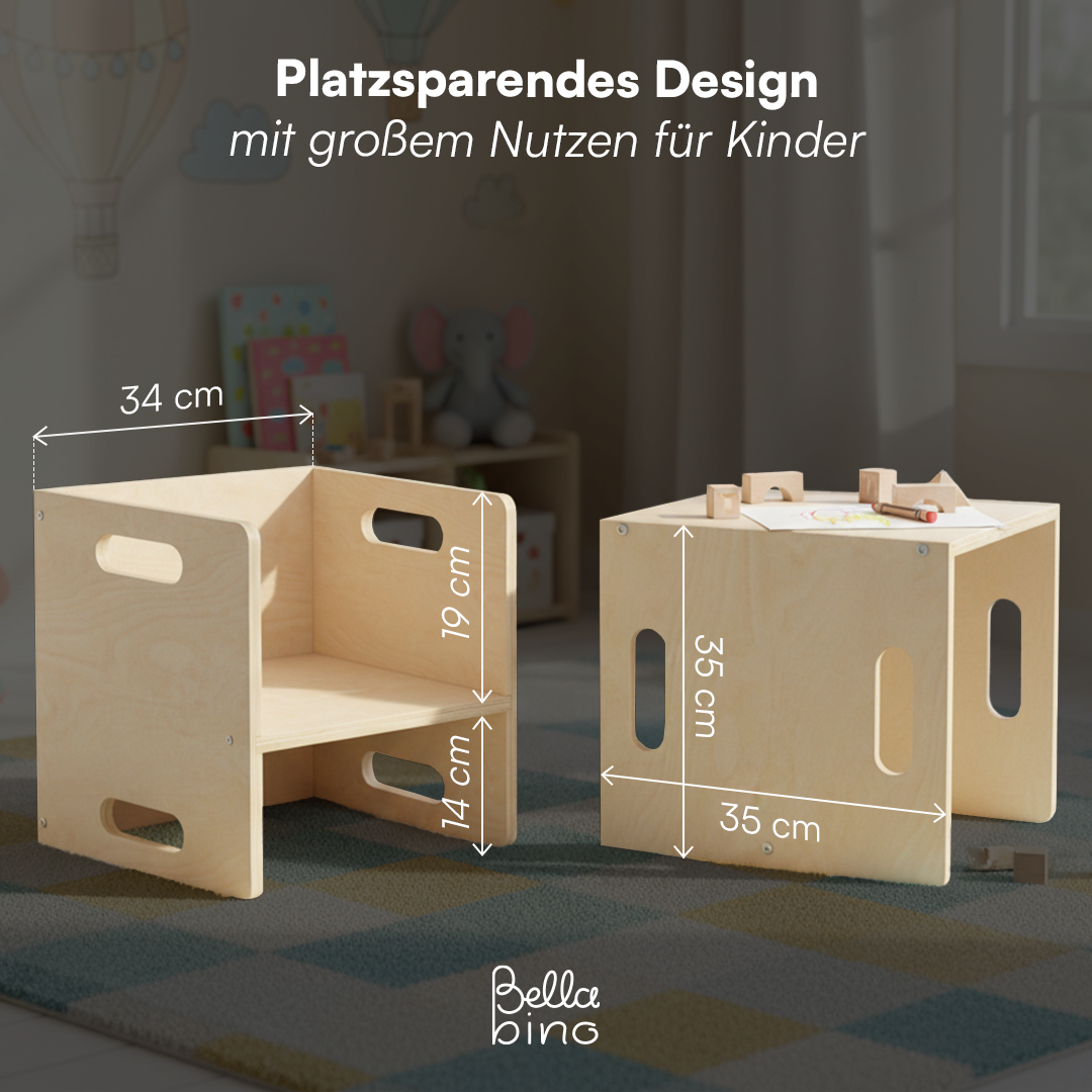 Mit Funktionalität und höchstem Sitzkomfort ausgestattet, überzeugt die 'Aki' Sitzgarnitur von Bellabino als eine vielseitige und bequeme Sitzlösung für das Kinderzimmer, die zum Spielen und Entspannen einlädt. Hergestellt aus hochwertigem, unbehandeltem Birken-Sperrholz, besteht 'Aki' aus zwei Stühlen, die jeweils die Maße B 34 x T 35 x H 35 cm aufweisen. Beide Sitzelemente sind um 180 Grad drehbar, um die Sitzhöhe je nach den Bedürfnissen und dem Wachstum Ihres Kindes anzupassen. Dank der Wendefunktion können die Stühle auch als praktische Beistelltische verwendet werden.