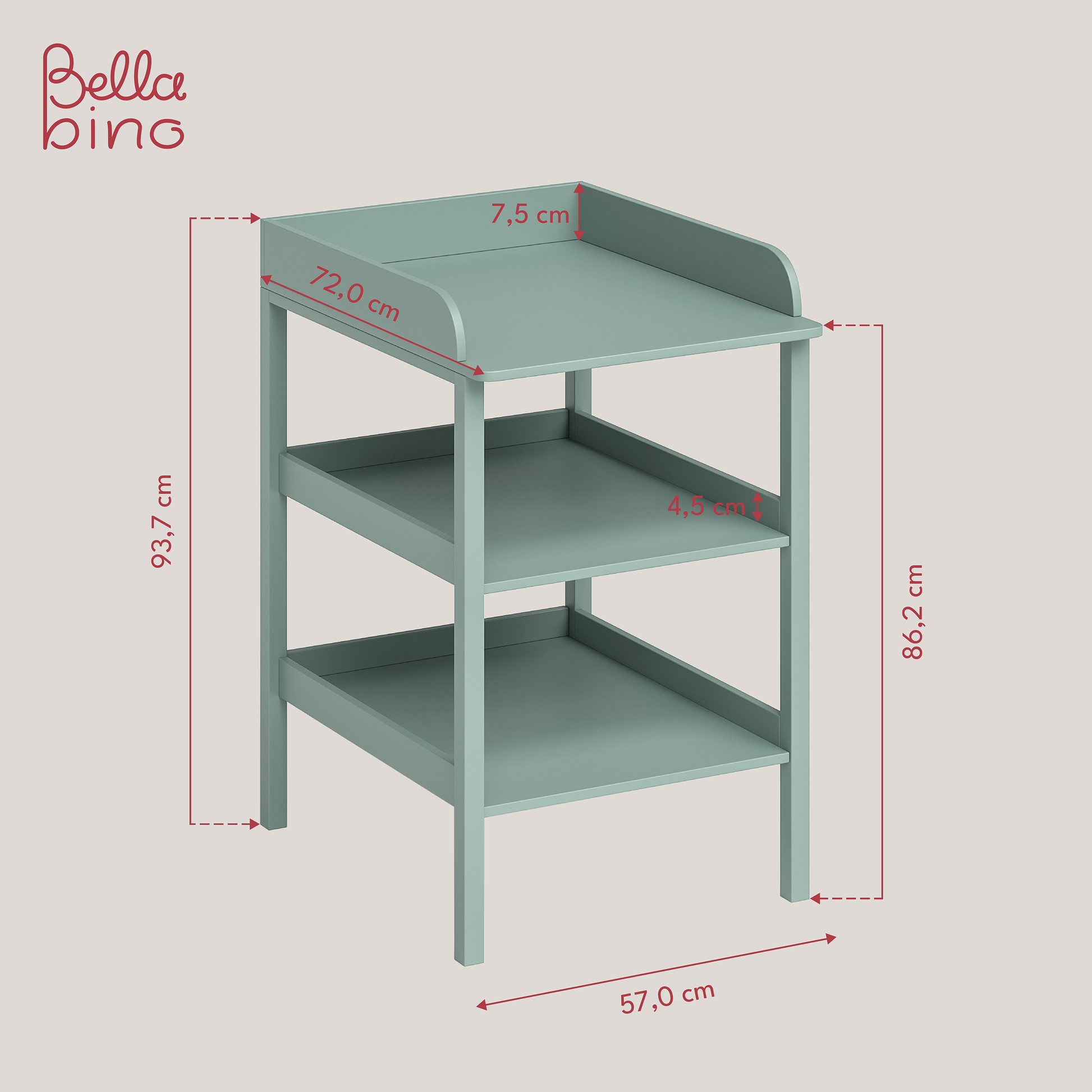 Der Wickeltisch 'Bani' von Bellabino ist die ideale Lösung für alle Eltern, die die Wickelecke im Babyzimmer funktional und praktisch einrichten möchten. Mit seinen großzügigen Maßen von 94 cm (H), 72 cm (T) und 57 cm (B) bietet der Wickeltisch ausreichend Platz zur Pflege des Kindes. Die 70 x 53 cm große Wickelfläche sorgt zudem für einen gemütlichen Wickelbereich, in welchem sich Ihr Baby beim Wickeln und Anziehen geborgen und geschützt fühlen kann.