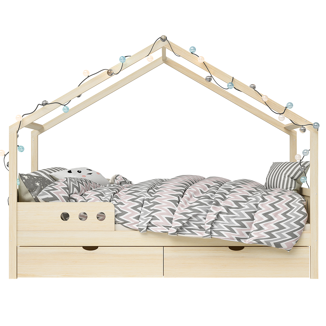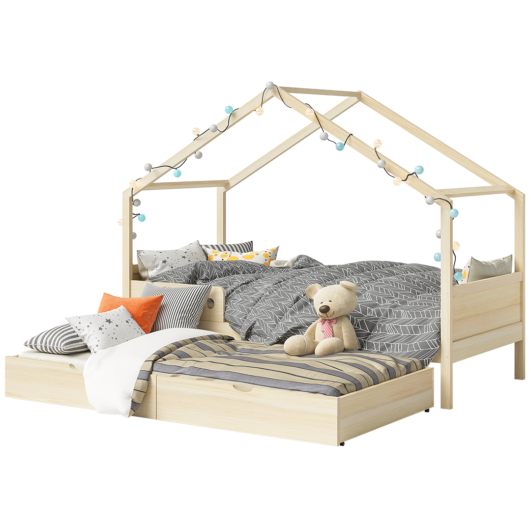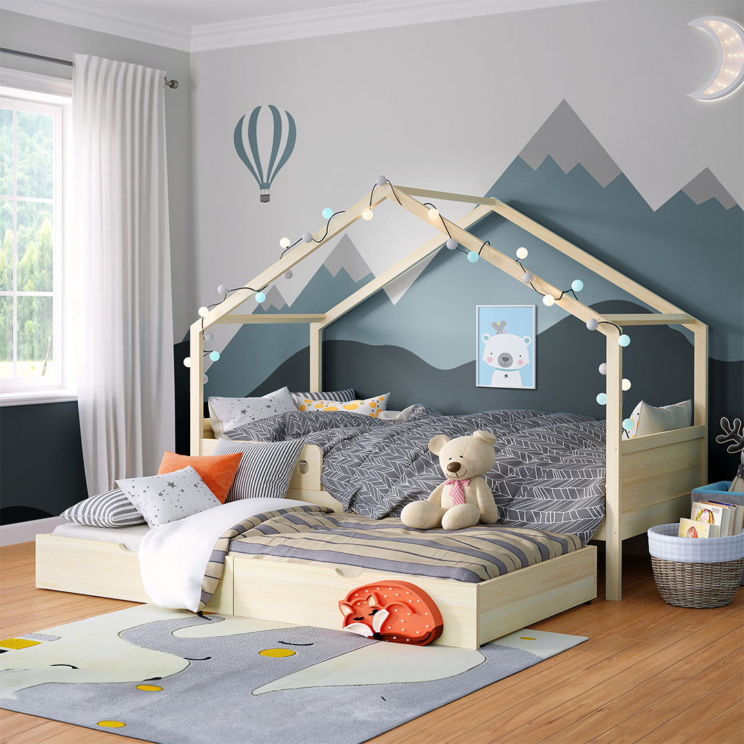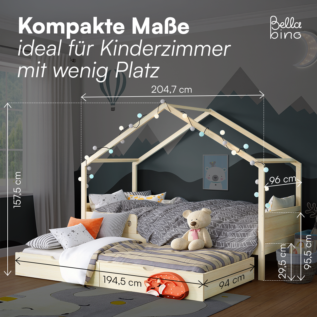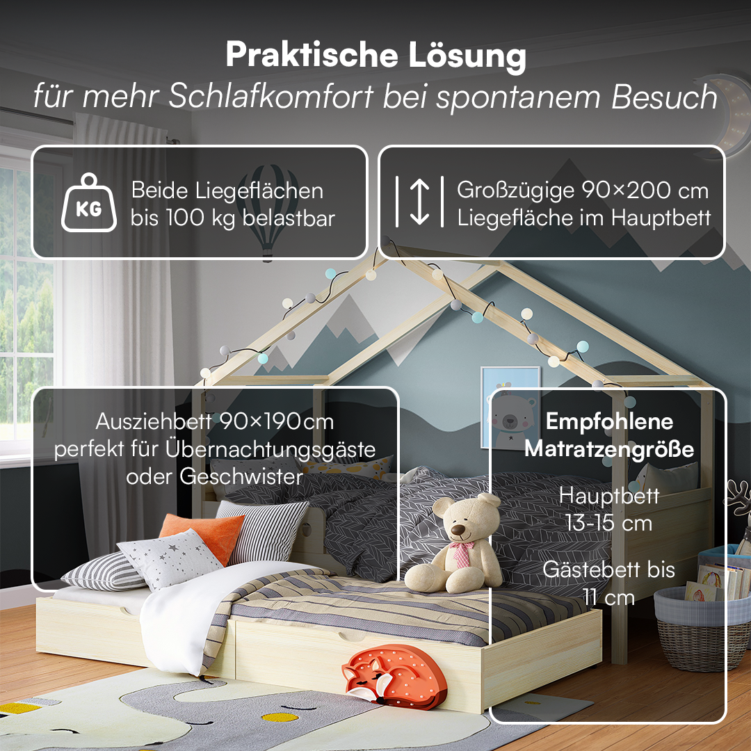 - Lieferumfang: Hausbett inkl. Lattenrost, Gästebett inkl. Lattenrost und 2x Rausfallschutz