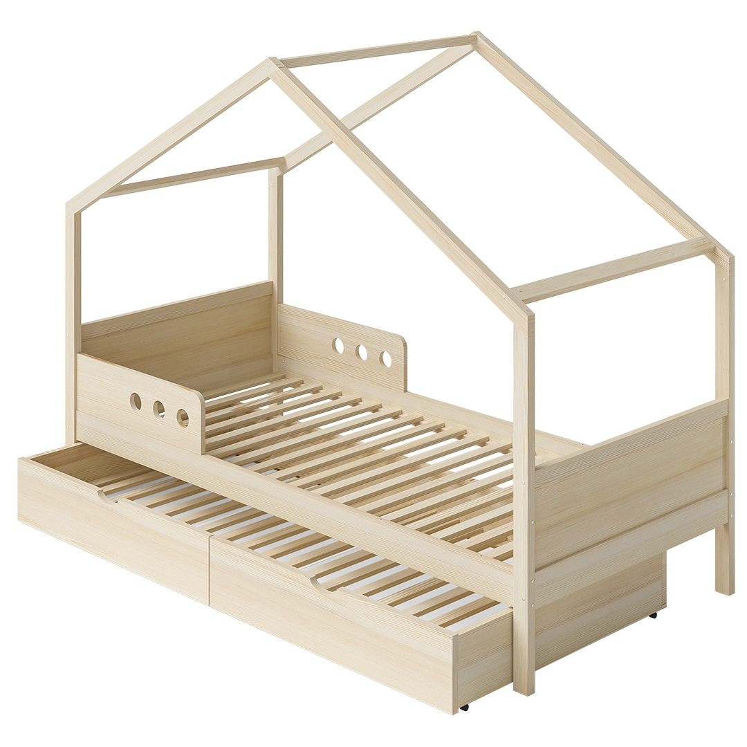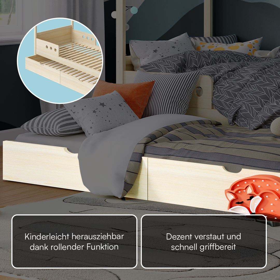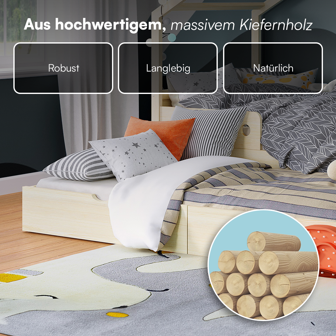 Bela Hausbett 90x200 cm, Kiefer massiv, natur, inkl. Gästebett 90x190 cm und Rausfallschutz