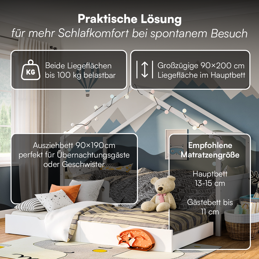 - Lieferumfang: Hausbett inkl. Rausfallschutz, Lattenrost und Gästebett