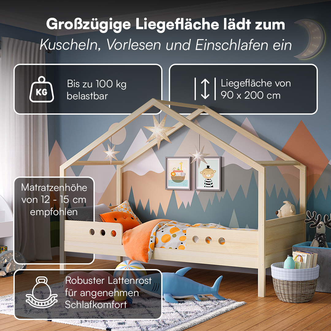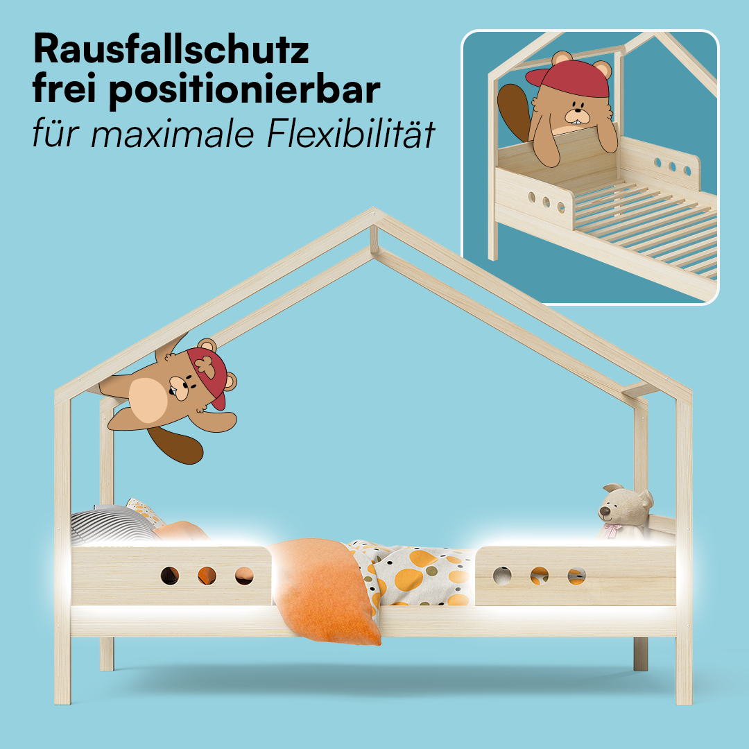 - Lieferumfang: Hausbett inkl. Rausfallschutz und Lattenrost