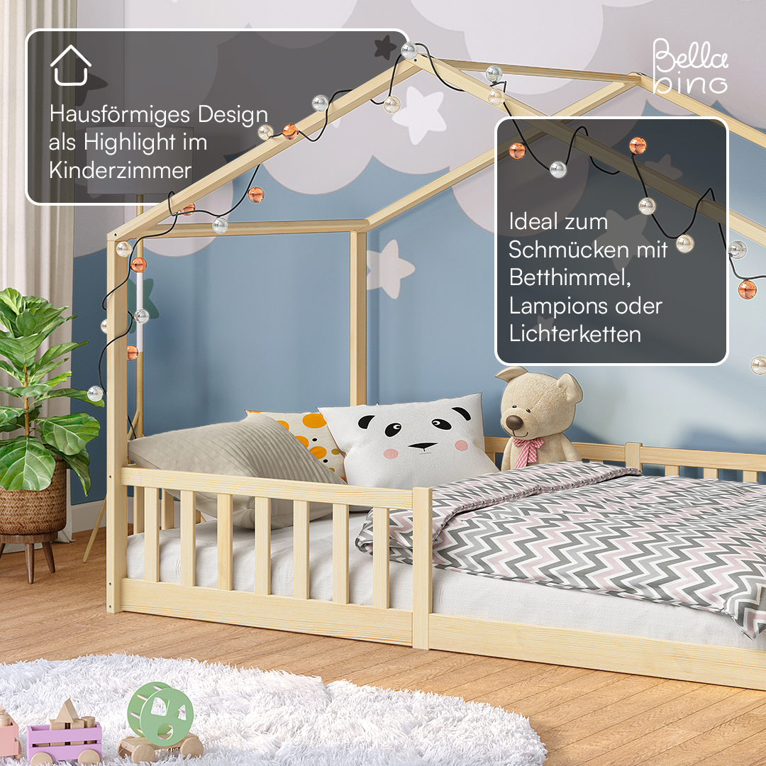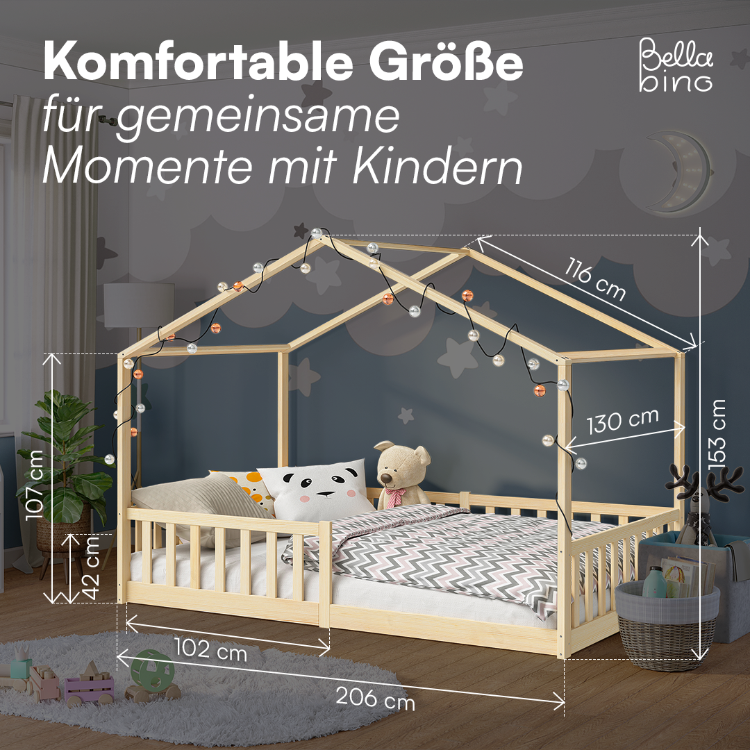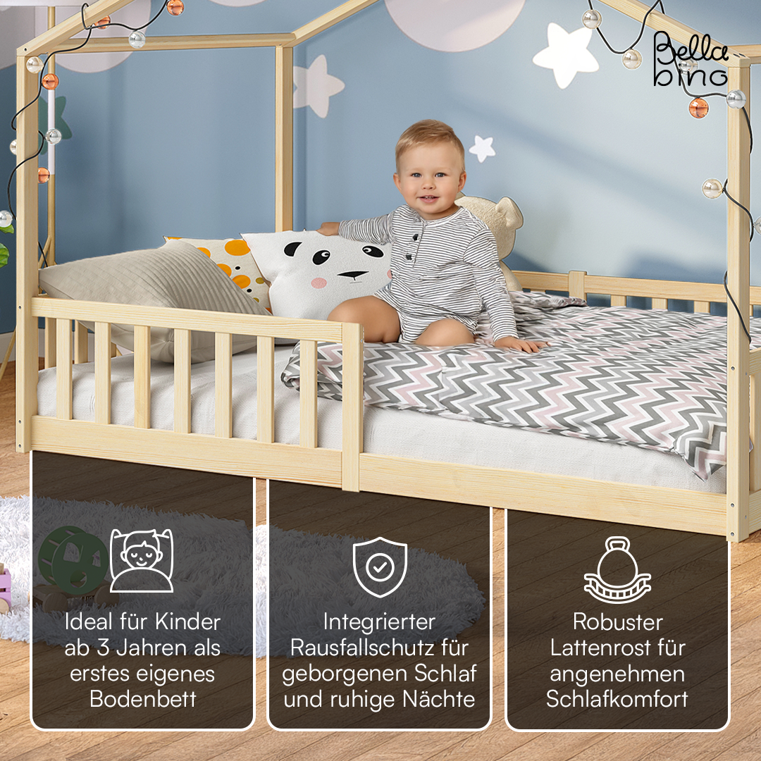 Das Bellabino Hausbett 'Bia' ist die ideale Schlafmöglichkeit für Kinder ab 3 Jahren, die aus ihrem Babybett herausgewachsen sind und in ein richtiges Kinderbett umziehen möchten. Dieses Kinderbett wird direkt auf den Boden gelegt, was eine niedrige Betthöhe ermöglicht und es den Kindern leicht macht, eigenständig einzusteigen, ohne auf die Hilfe der Eltern angewiesen zu sein.