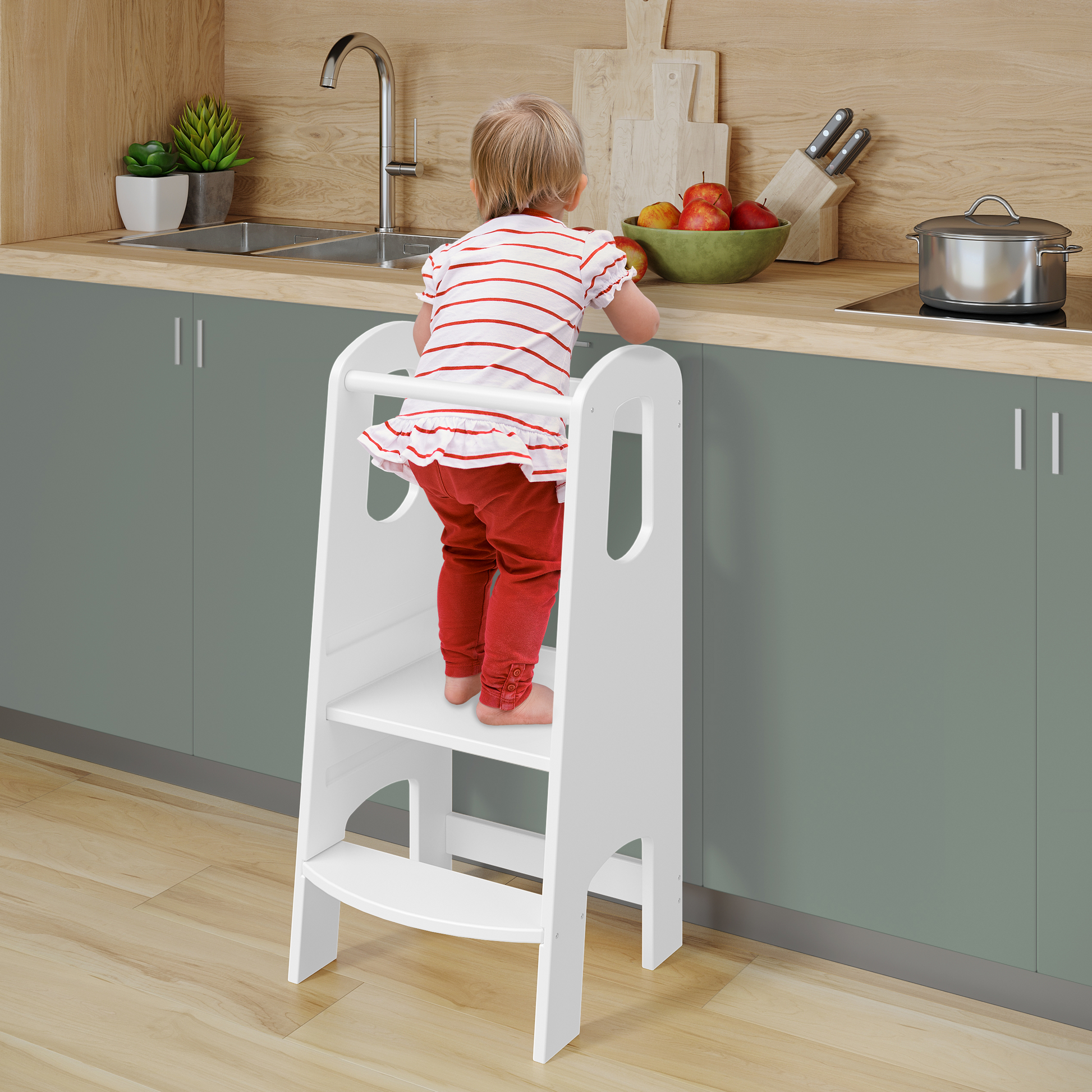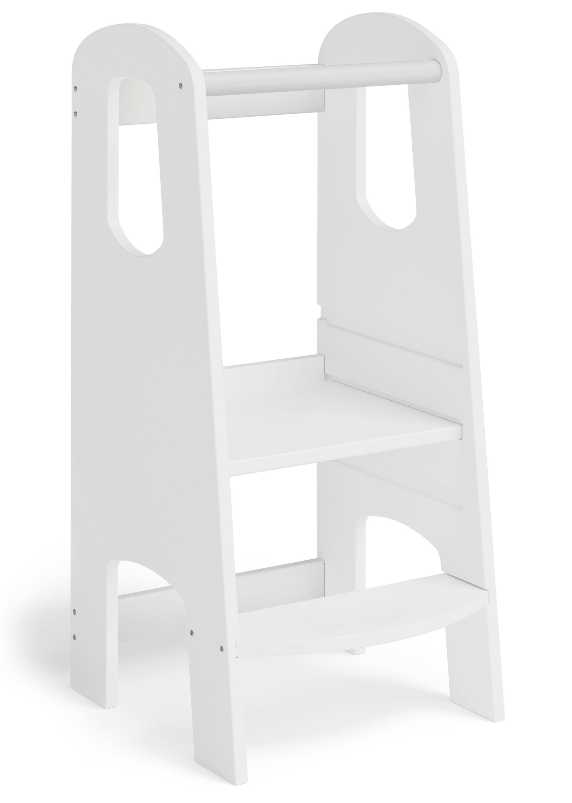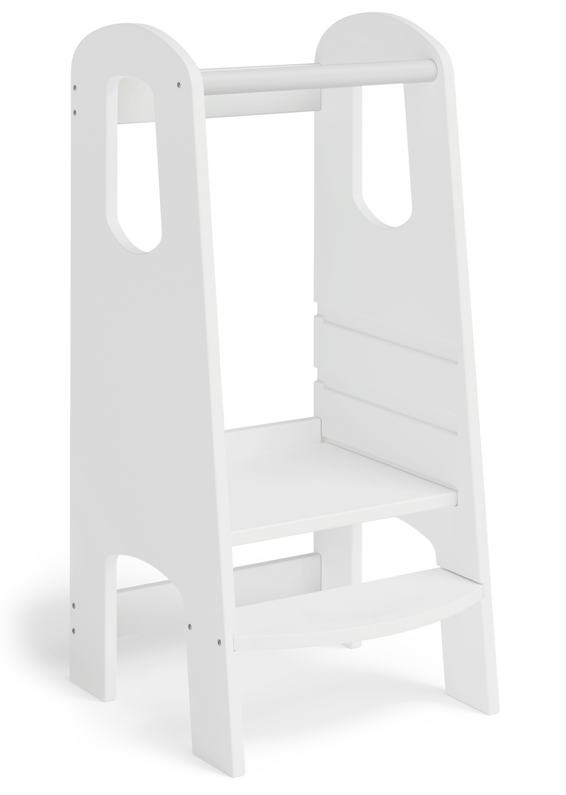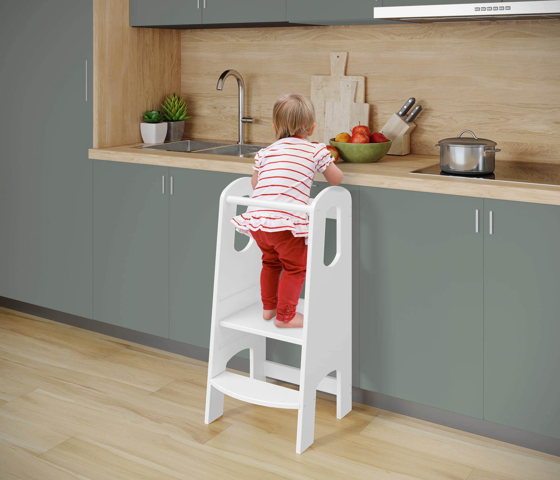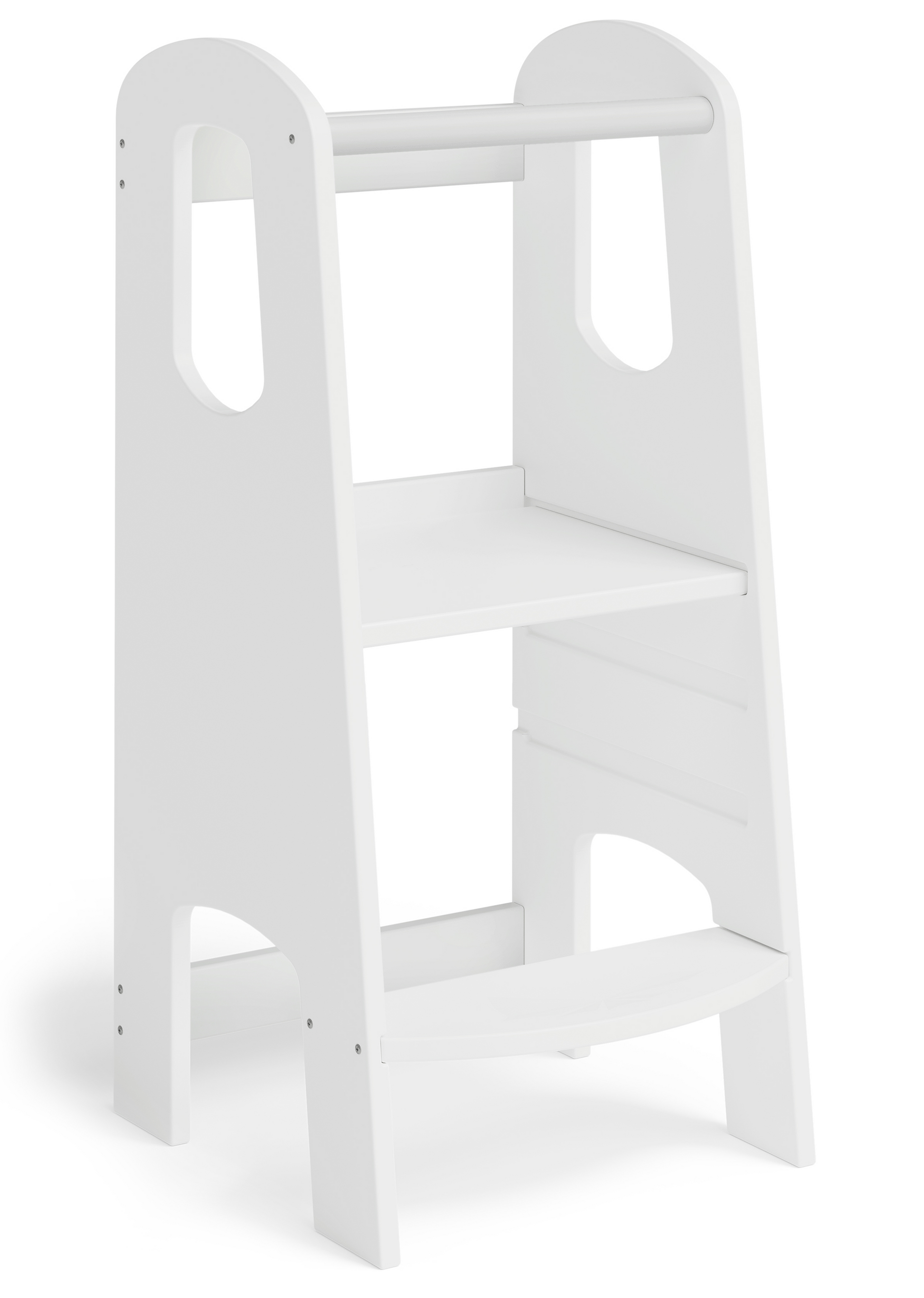 Der Lernturm ist in der Farbe Weiß aus robustem Sperrholz gefertigt, das eine Tragfähigkeit von maximal 60 kg verspricht. Hinzu kommt die hohe Flexibilität: Die Stehfläche ist auf drei Stufen (27, 36 und 45 cm) einstellbar und lässt sich wunderbar an die Größe Ihres Kindes anpassen. Die Verstellung der Stehfläche erfolgt ohne Abschrauben durch das einfache Rausziehen der Trittfläche.