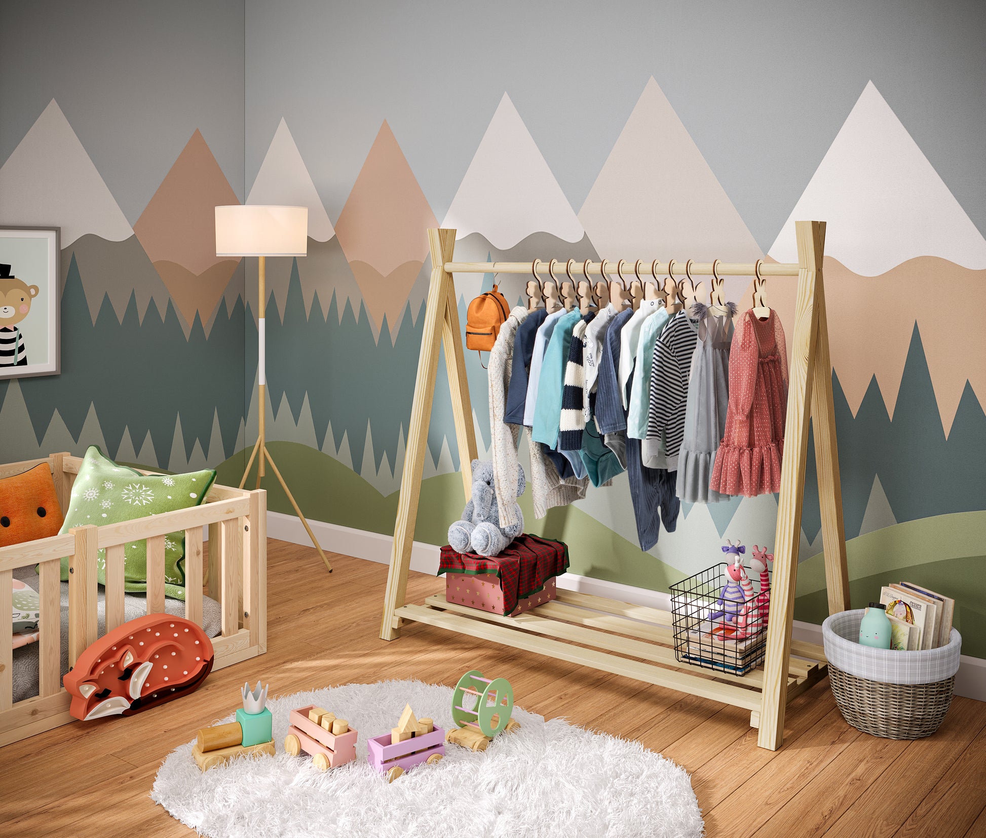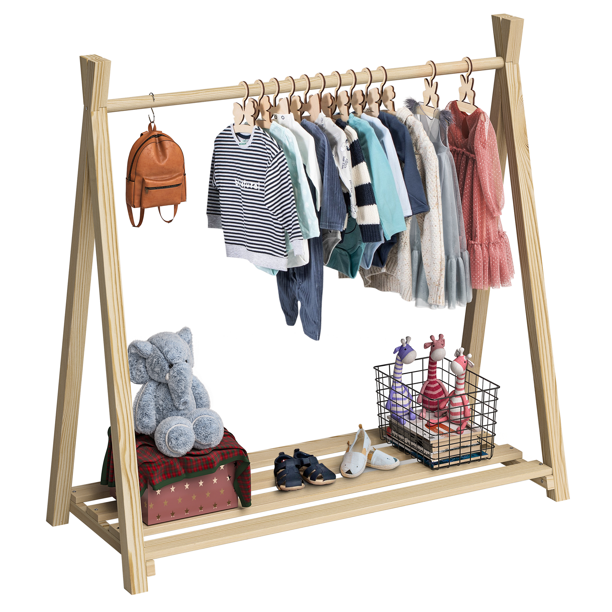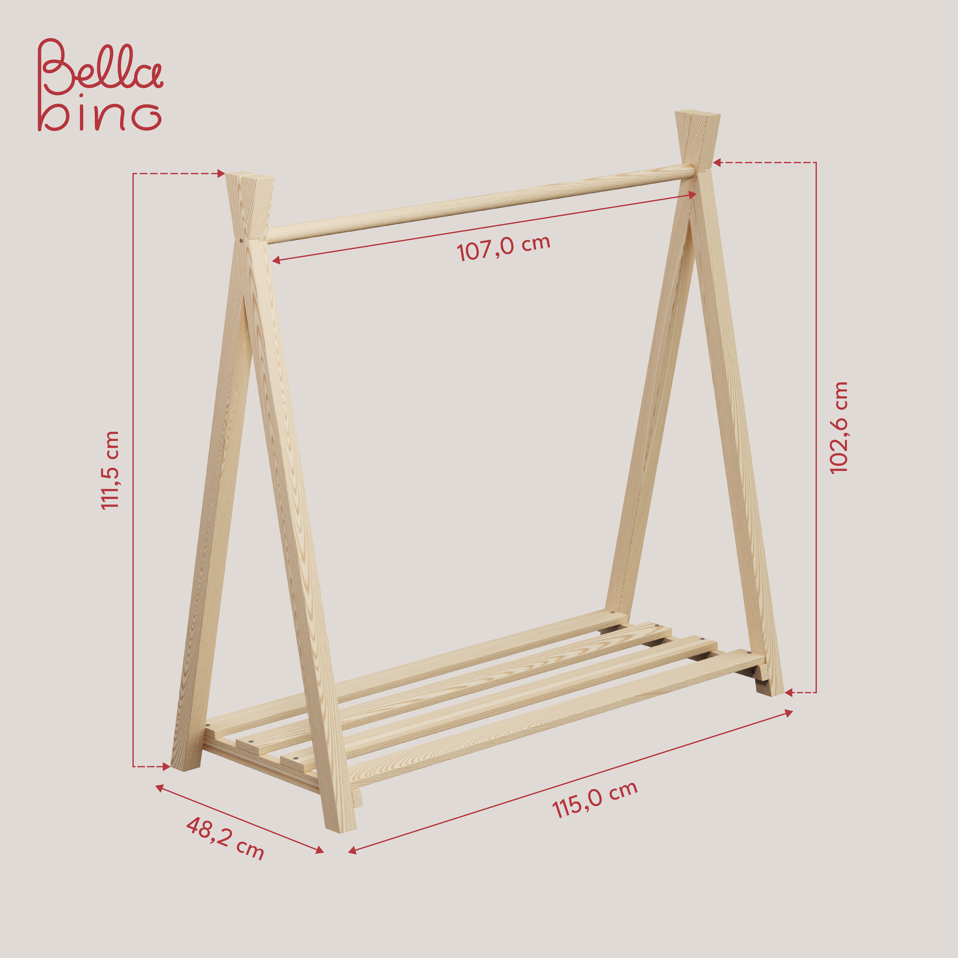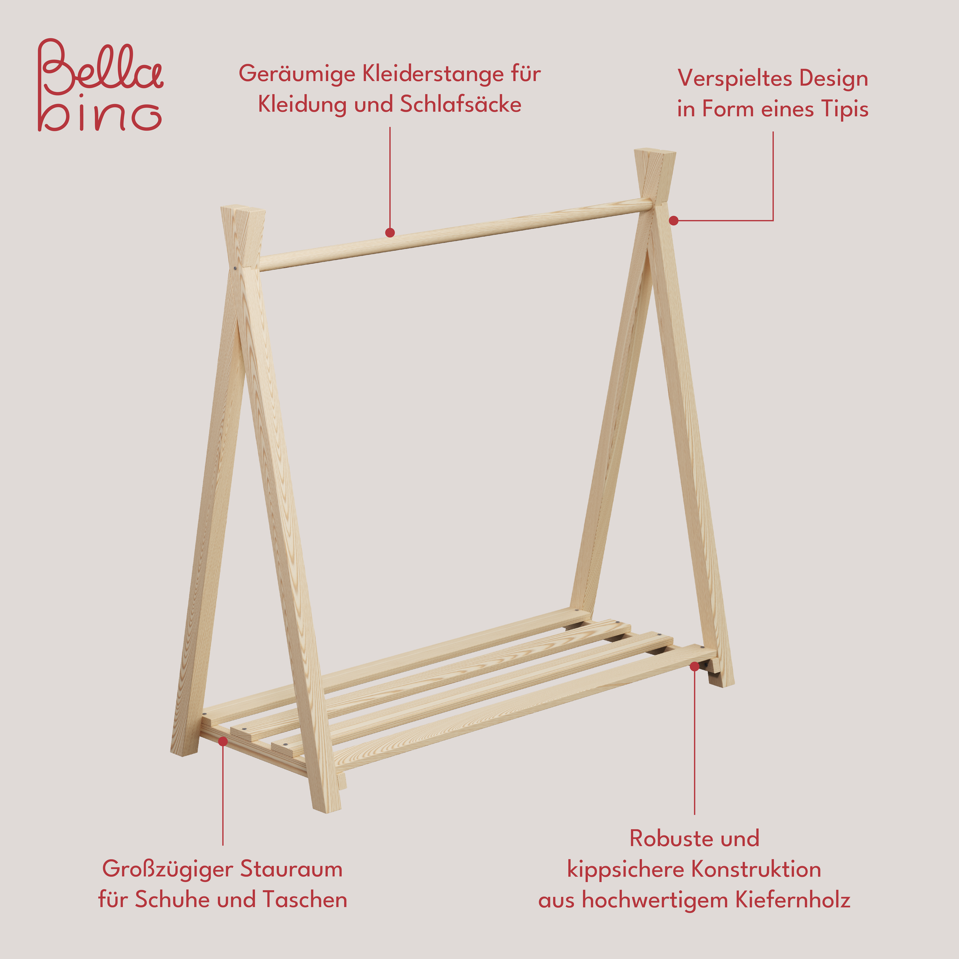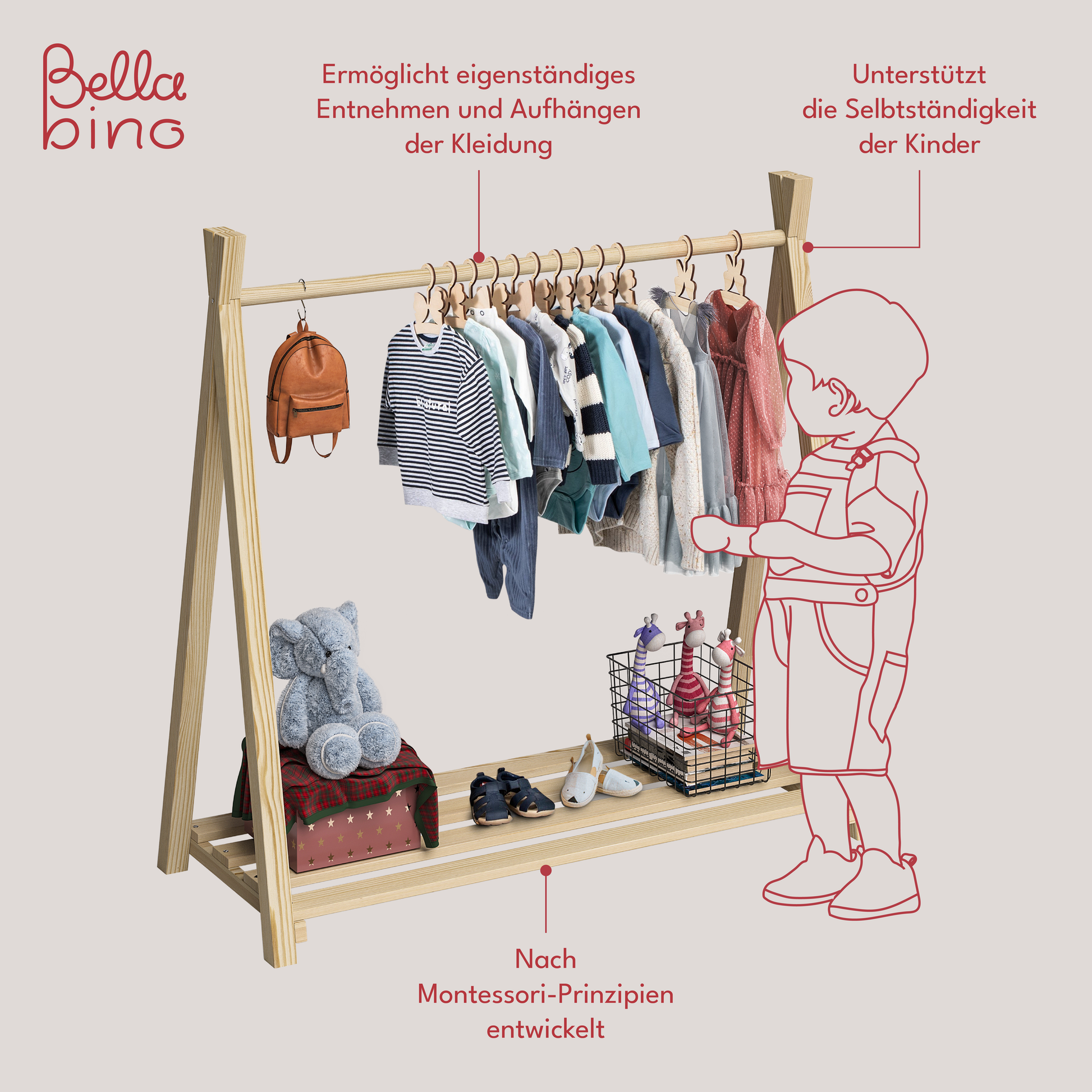 Die Kindergarderobe von Bellabino ist aus robustem Kiefernholz gefertigt und kann bis zu 5 kg belastet werden. Dank seiner funktionalen Konstruktion bietet 'Ryck' ausreichend Platz für diverse Kleidungsstücke: Jacken, Pullover und T-Shirts können an die Stange aufgehängt und ordentlich aufbewahrt werden. Die Kleiderstange ist nach Montessori-Prinzipien konzipiert, sodass die Kinder schnell und flexibel ihr Lieblingsstück von der Stange abnehmen und wieder verstauen können – ganz ohne Hilfe der Eltern.