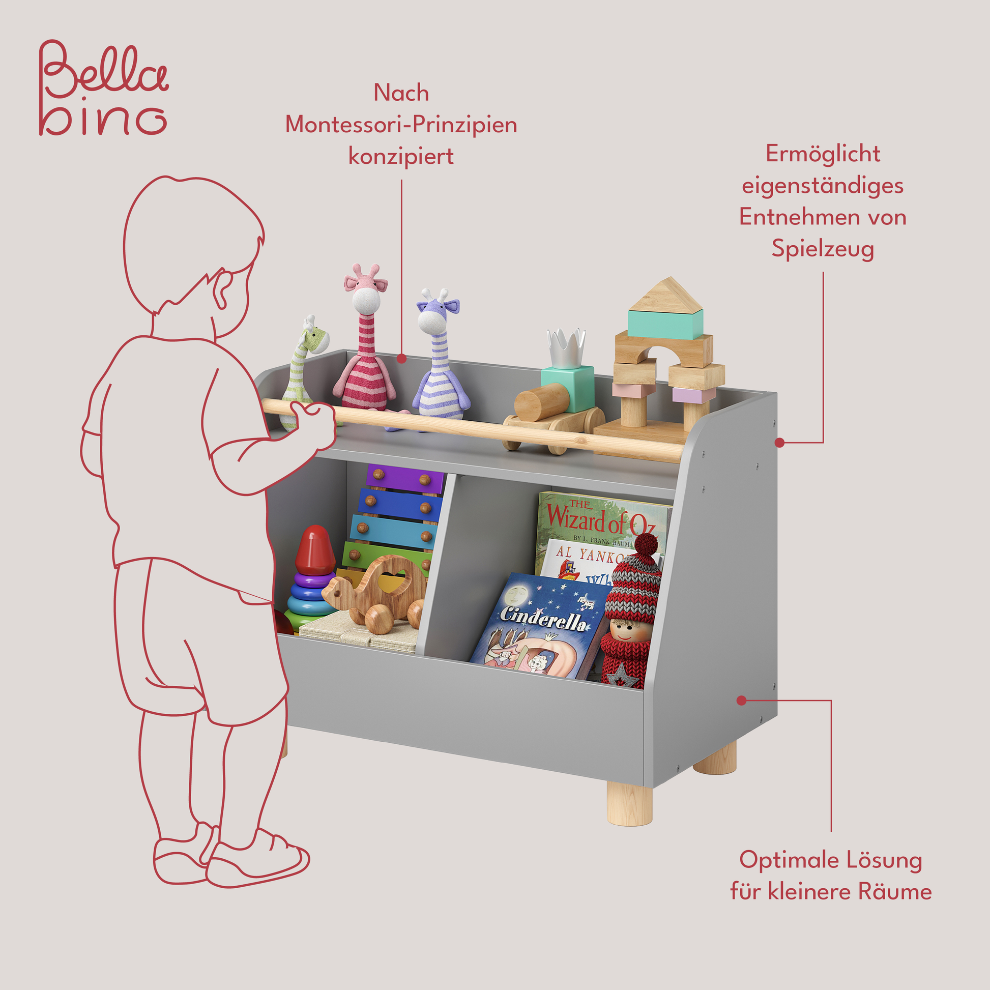 Das Kinderregal von Bellabino besticht außerdem durch sein dezentes Design und schlichte Optik. Mit seiner zeitlosen Kombination aus Grau und Natur fügt es sich harmonisch in jede Einrichtung ein und schafft eine gemütliche Atmosphäre im Kinderzimmer.