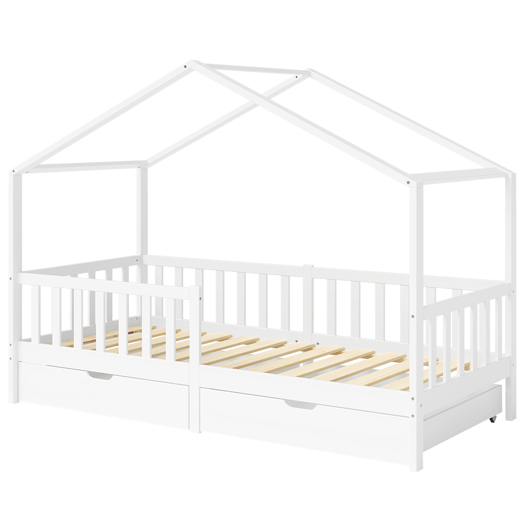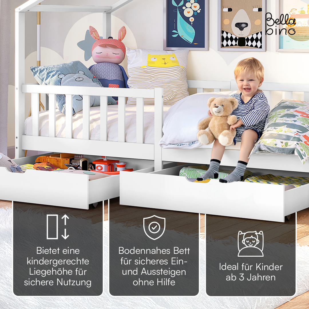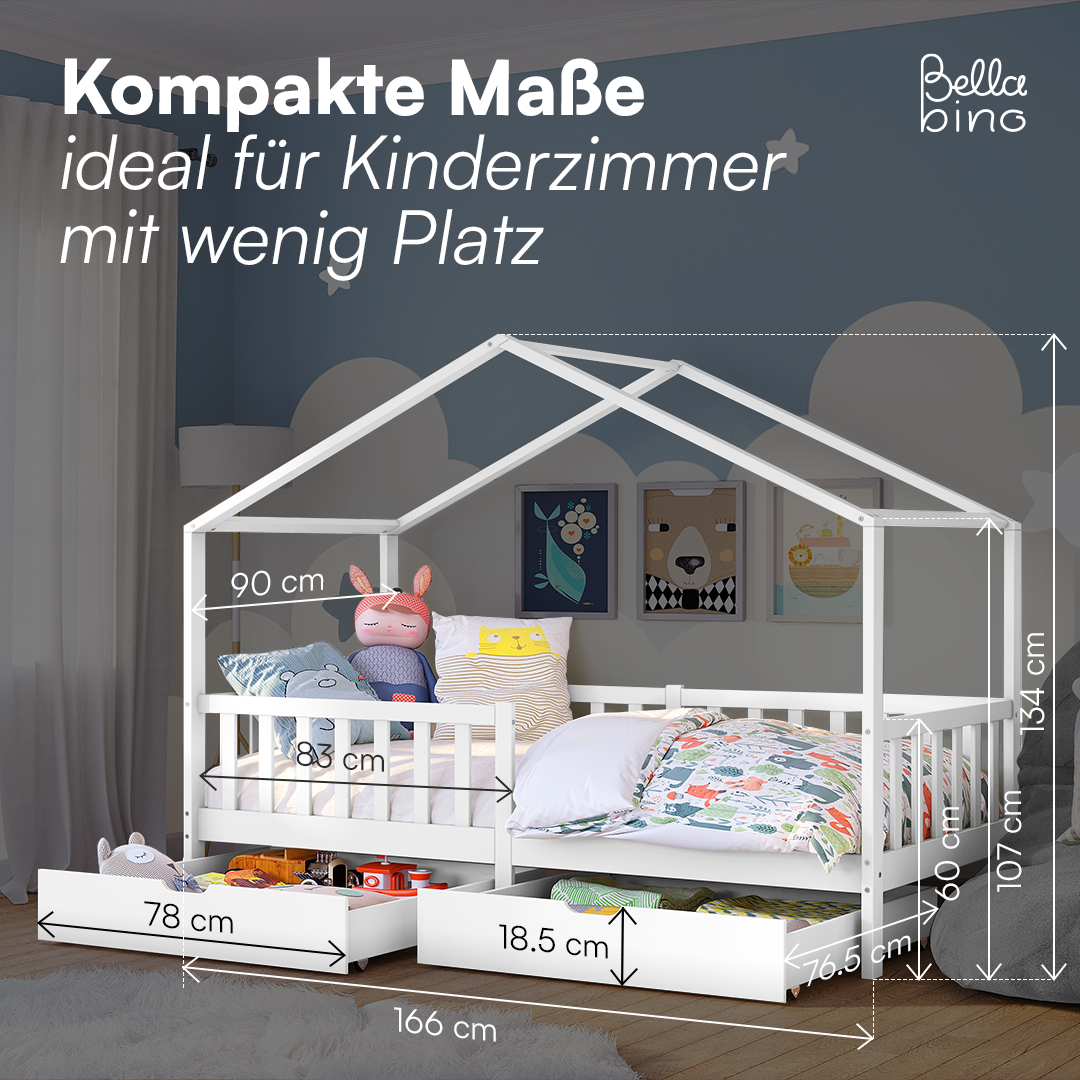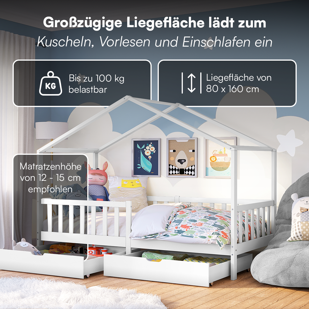 Bia Hausbett 80x160 cm mit Matratze und 2 Schubladen, weiß, Kiefer Massivholz, Montessori Kinderbett mit Stauraum, inkl. Rausfallschutz und Lattenrost