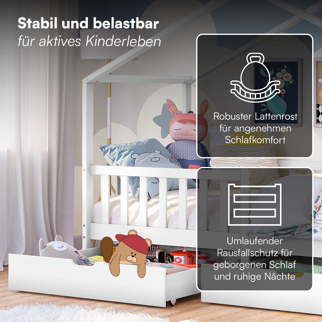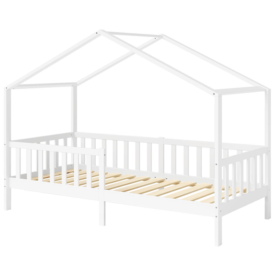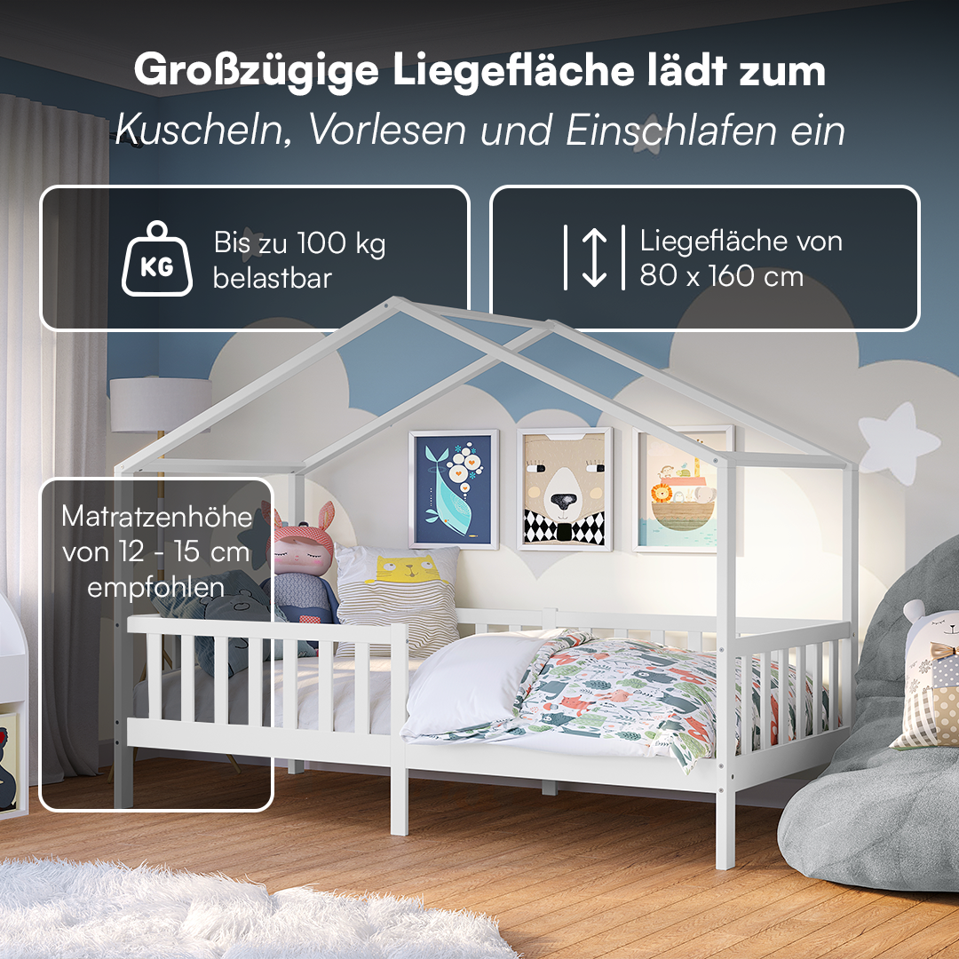 Bia Hausbett 80x160 cm mit Matratze, weiß, Kiefer Massivholz, Montessori Kinderbett mit Rausfallschutz und Lattenrost
