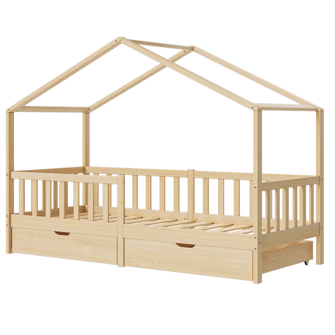 Bia Hausbett 90x200 cm mit Matratze und 2 Schubladen, natur, Kiefer Massivholz, Montessori Kinderbett mit Stauraum, inkl. Rausfallschutz und Lattenrost
