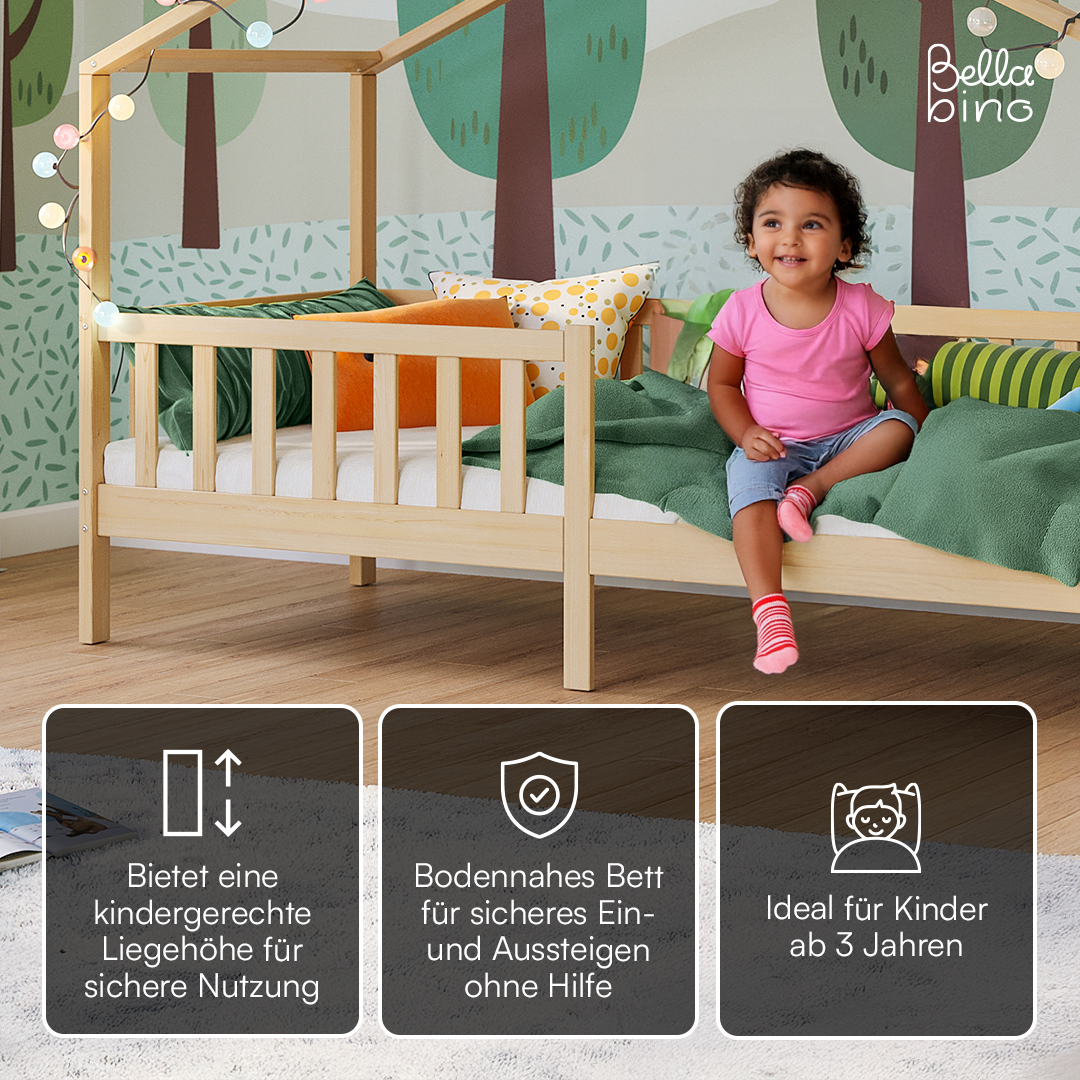 Das Kinderbett „Bia“ von Bellabino bietet durch seine niedrige Bauweise Kleinkindern einen sicheren und selbstständigen Zugang zur Liegefläche. Die Hausform macht es zu einem gemütlichen Mittelpunkt im Kinderzimmer – für Jungen und Mädchen gleichermaßen. Mit einer großzügigen Liegefläche von 90x200 cm, Lattenrost und umlaufendem Rausfallschutz sorgt es für erholsamen Schlaf und ein Gefühl von Geborgenheit. Aus massivem Kiefernholz gefertigt und weiß lackiert, ist es bis 100 kg belastbar und bestens für den Kinderalltag geeignet. Das zeitlose Design passt in jede Einrichtung und begleitet dein Kind zuverlässig über viele Jahre.