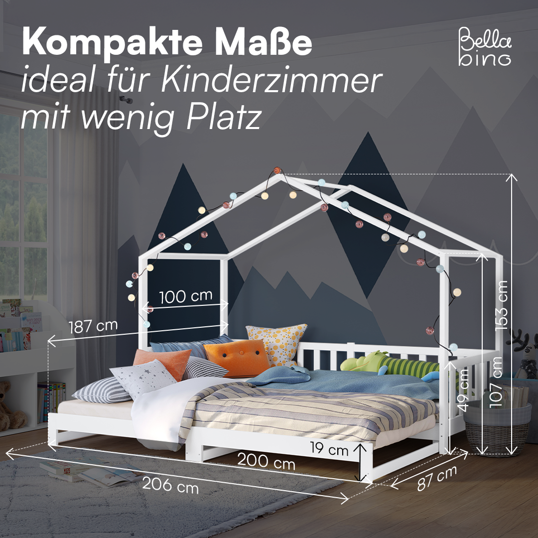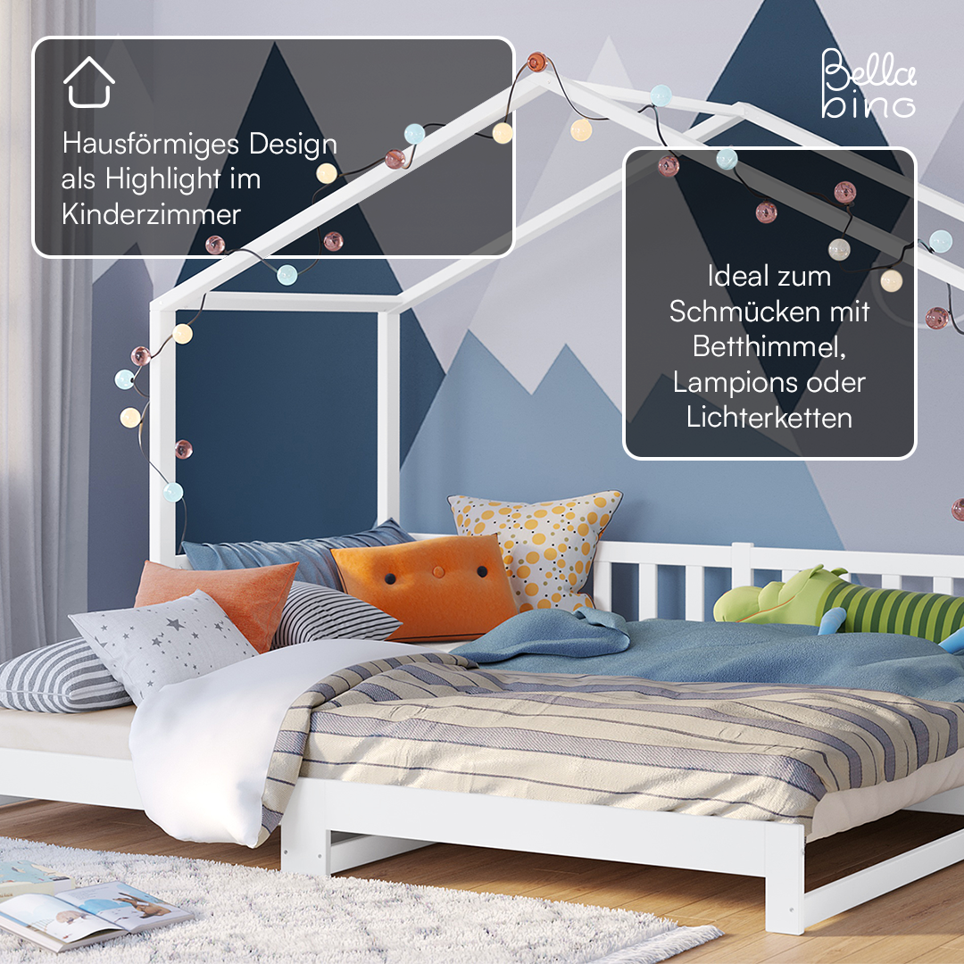 Entdecken Sie das neue Hausbett 'Bia' von Bellabino – die ideale Schlaflösung für Kinder, die Wert auf Unabhängigkeit und Komfort legen. Das durchdachte Design bietet eine beeindruckende Funktion: ein ausziehbares Bett, das von 90x200 cm auf 180x200 cm erweitert werden kann. Geeignet für Geschwister oder Übernachtungsgäste!