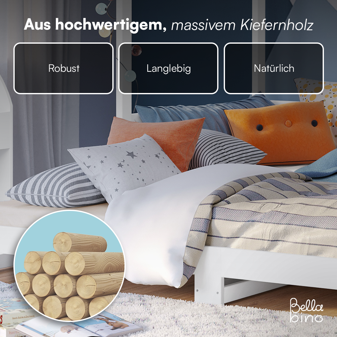 Das Bellabino Hausbett wird direkt auf dem Boden platziert, wodurch eine niedrige Betthöhe entsteht. Dies ermöglicht es Kindern, mühelos ins Bett zu gelangen und wieder herauszukommen, ohne die Hilfe der Eltern. Mit seiner charmanten Hausform und eleganten Optik wird das Bett schnell zum Highlight in jedem Kinderzimmer und fügt sich harmonisch in jeden Einrichtungsstil ein.