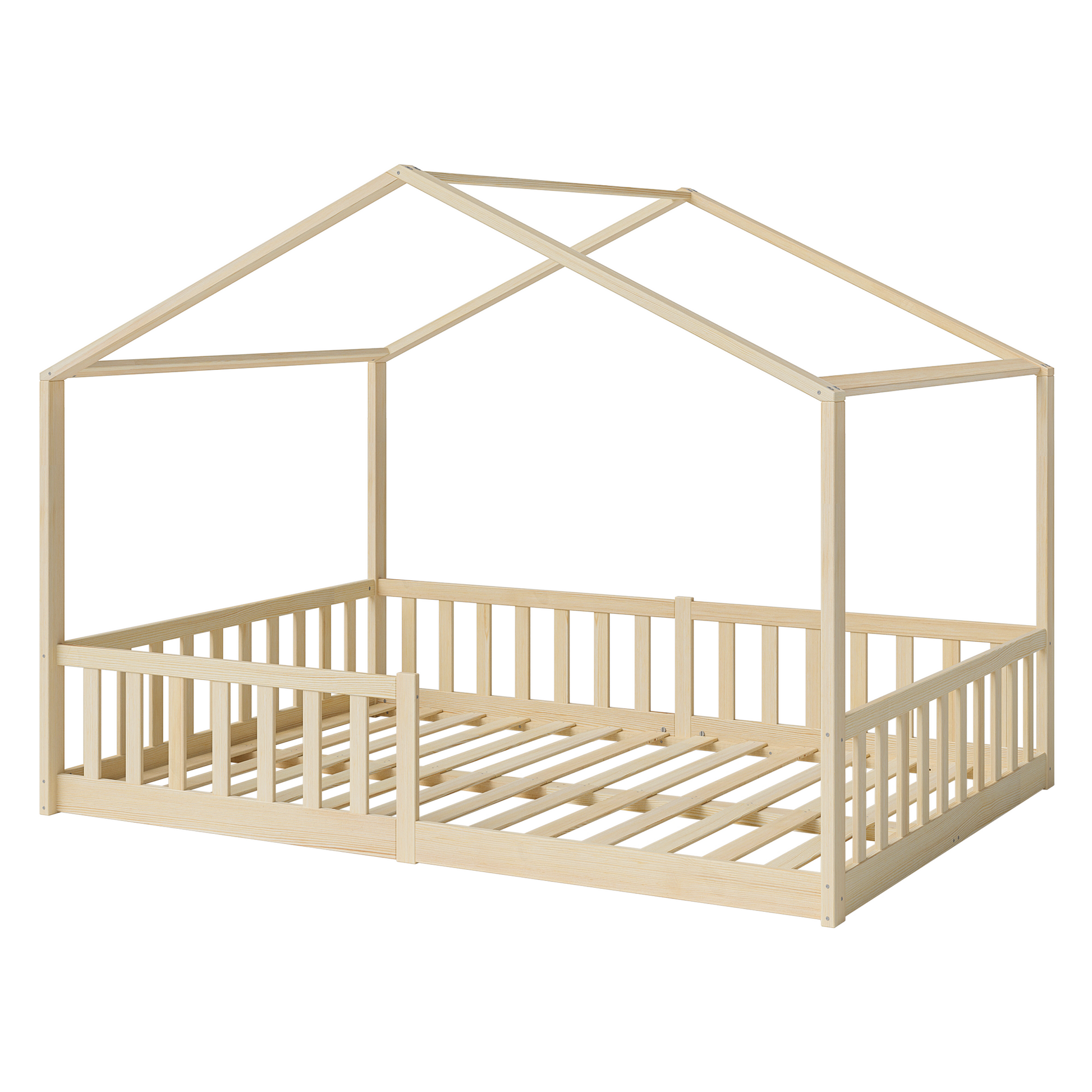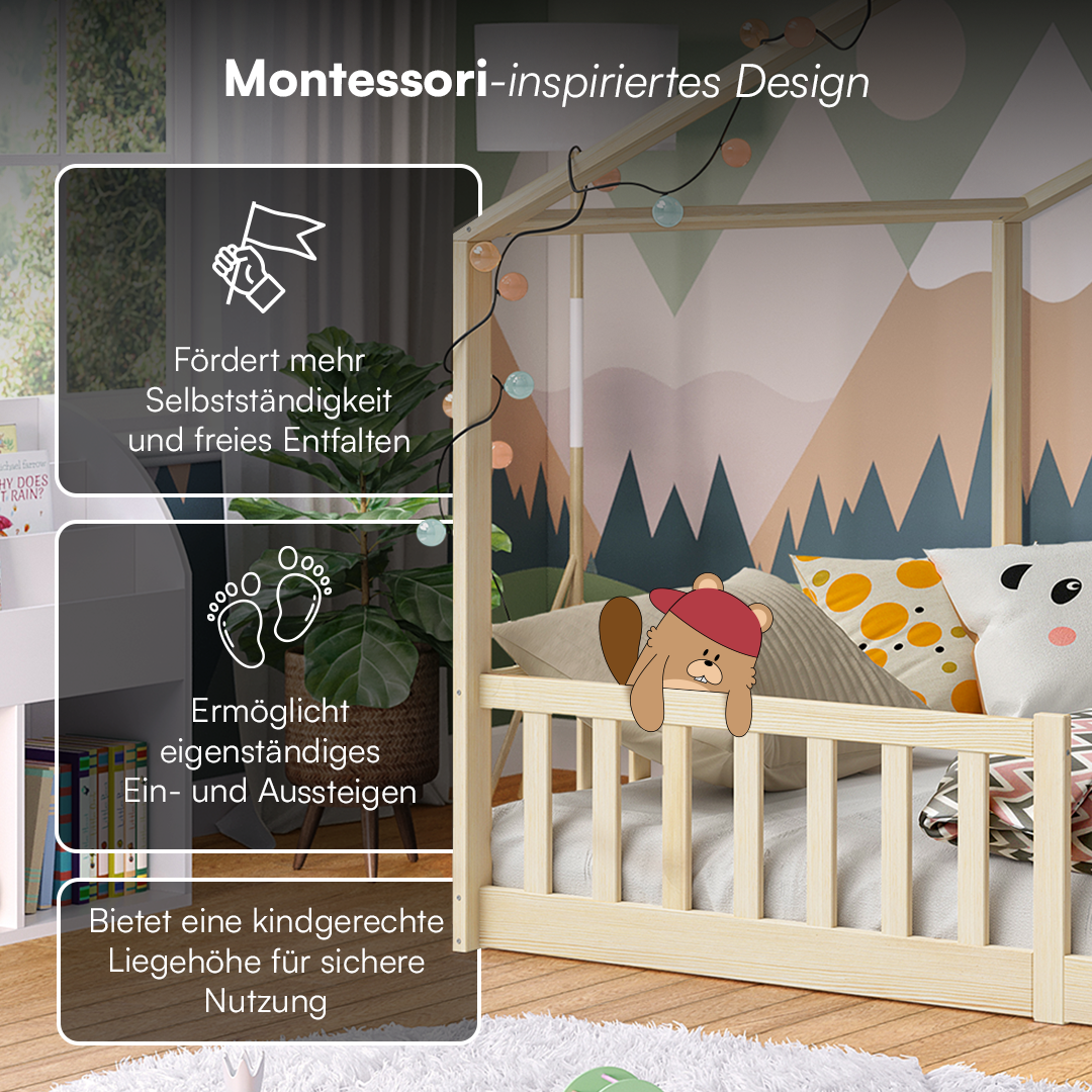 Bia Hausbett inkl. Lattenrost und Rausfallschutz, 140x200 cm, natur lackiert, mit Matratze