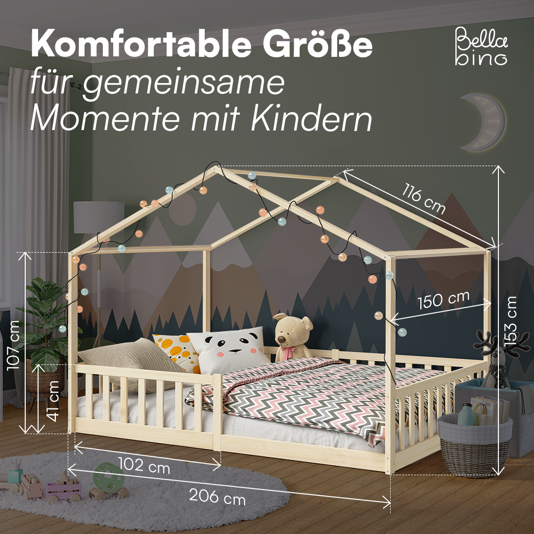 Das Hausbett Bia von Bellabino ist die ideale Schlaflösung für Kinder, die selbstständig in ihr Bett gehen möchten. Durch die niedrige Bauweise direkt auf dem Boden können Kinder problemlos ins Bett steigen und wieder herauskommen, ganz ohne Hilfe. Mit seiner eleganten Hausform wird es schnell zum Highlight in jedem Kinderzimmer und passt sich jedem Einrichtungsstil an.