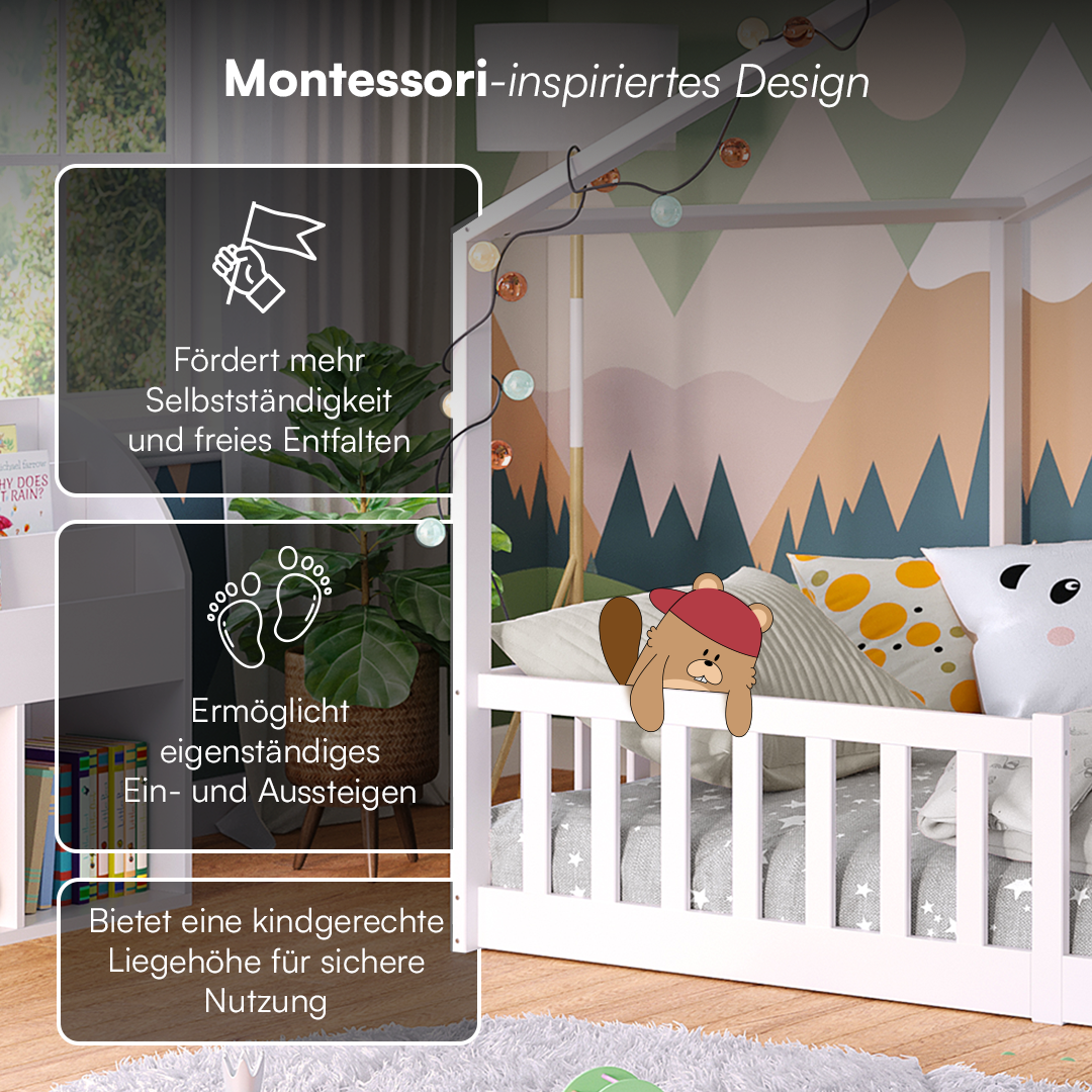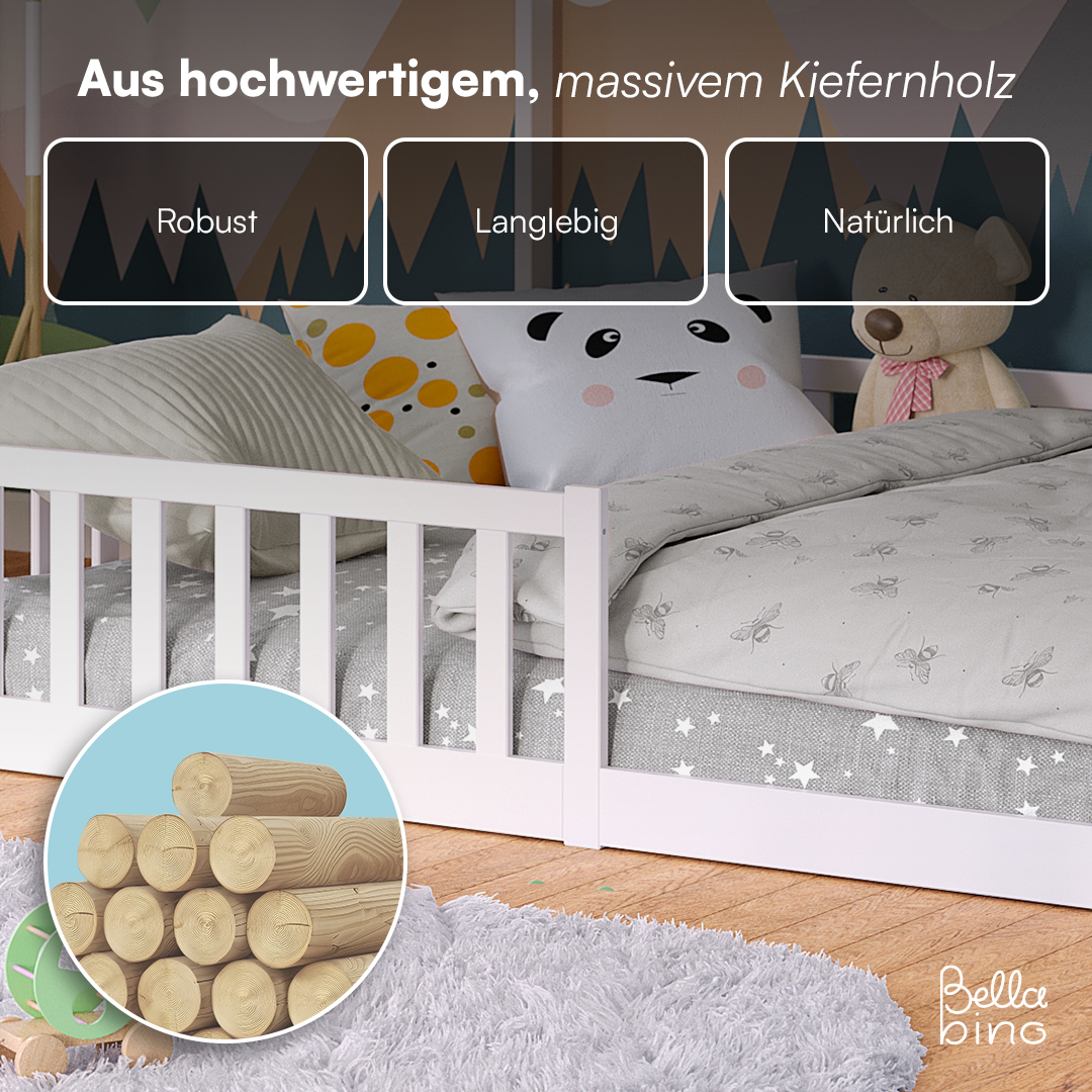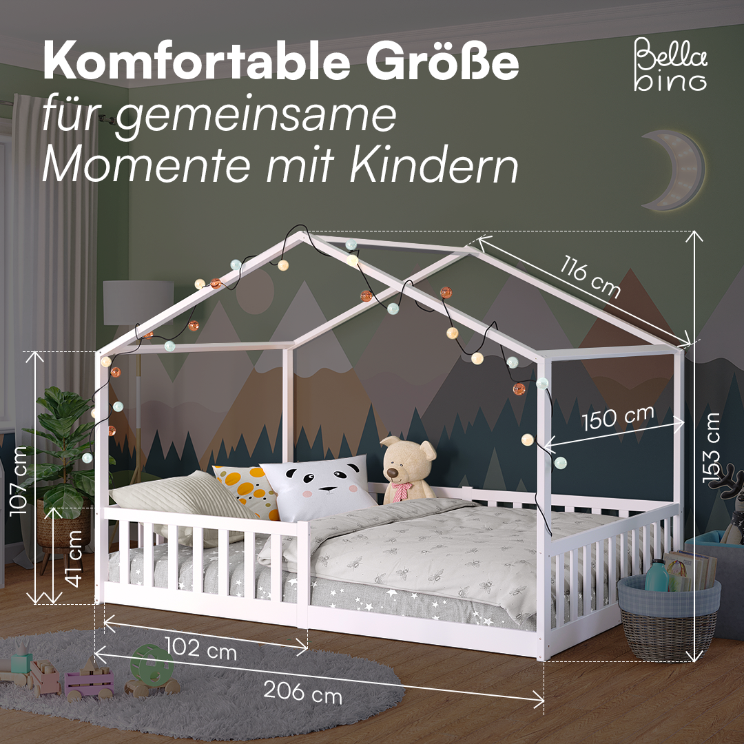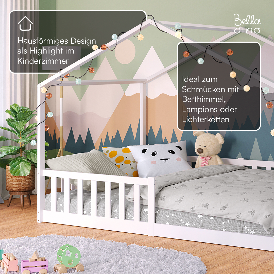 Das Bellabino Hausbett 'Bia' ist die ideale Schlafmöglichkeit für Kinder ab 3 Jahren, die aus ihrem Babybett herausgewachsen sind und in ein richtiges Kinderbett umziehen möchten. Dieses Kinderbett wird direkt auf den Boden gelegt, was eine niedrige Betthöhe ermöglicht und es den Kindern leicht macht, eigenständig einzusteigen, ohne auf die Hilfe der Eltern angewiesen zu sein.