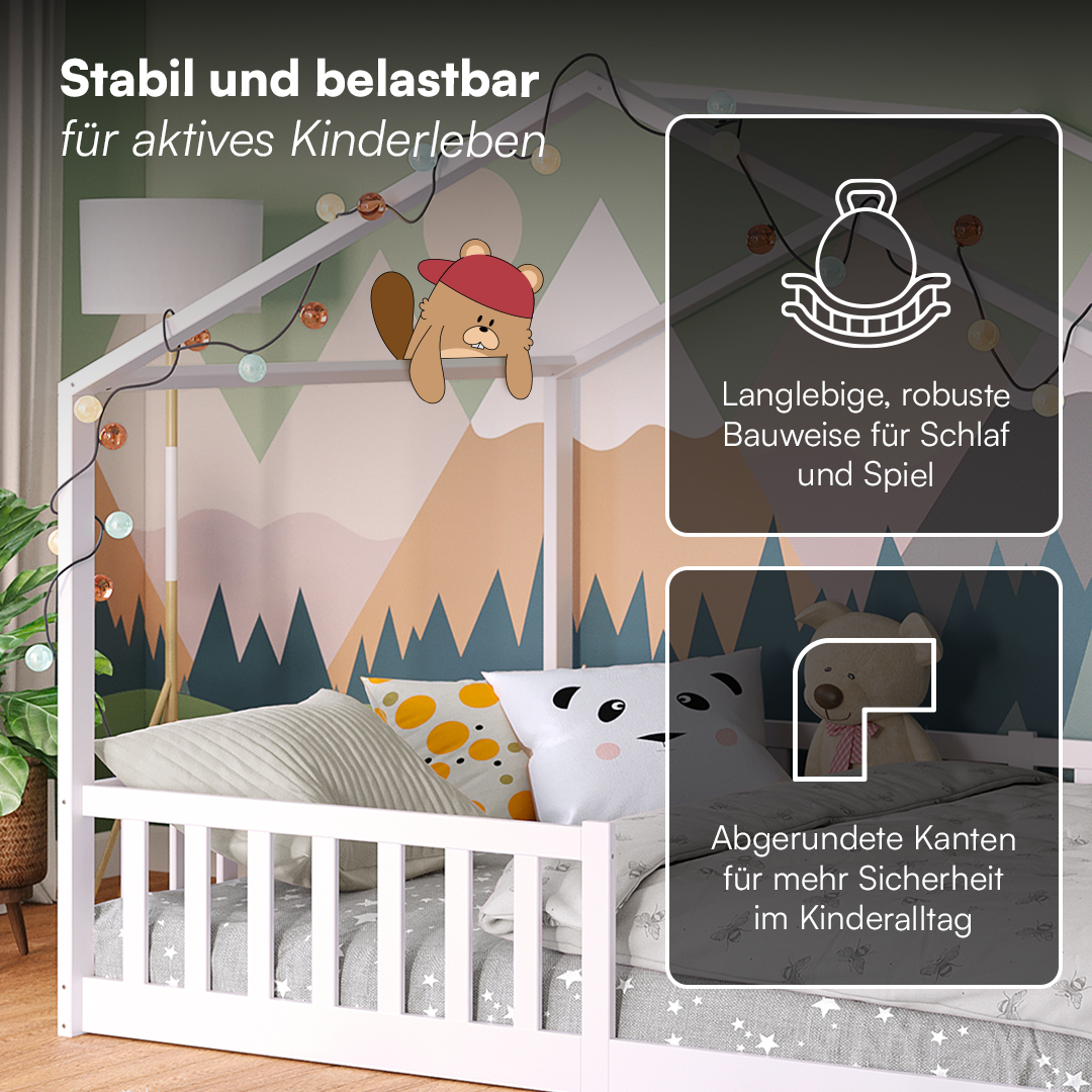 Das Bett besteht aus hochwertigem Massivholz und Holzwerkstoff in Weiß und garantiert so eine robuste und langlebige Konstruktion. Es ist für eine maximale Belastung von 100 kg ausgelegt und bietet maximale Stabilität für Ihr heranwachsendes Kind. Das besondere Hausdesign verleiht dem Bett eine einzigartige Optik, die das Kinderzimmer in eine fantasievolle Spielumgebung verwandelt und eine angenehme Atmosphäre schafft.