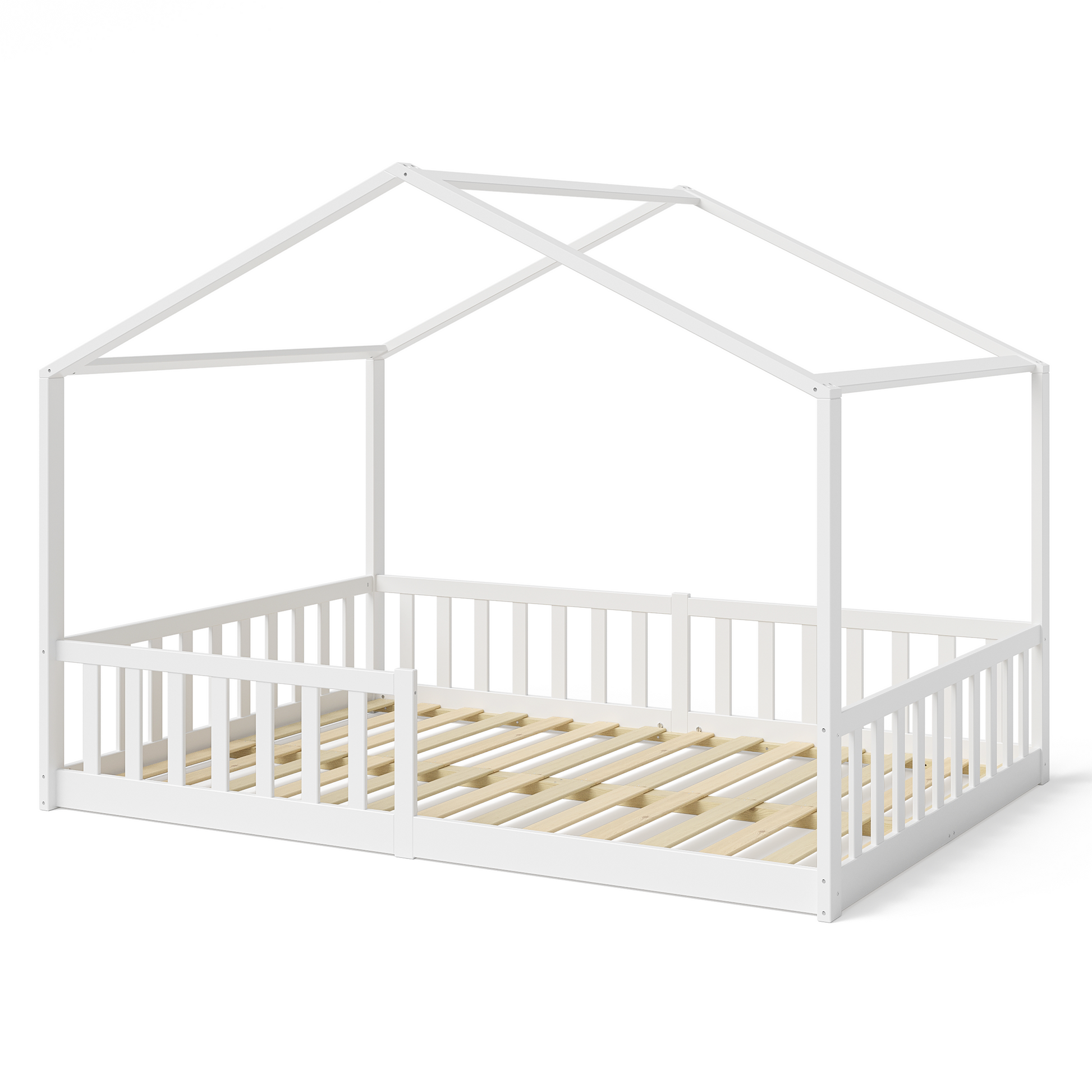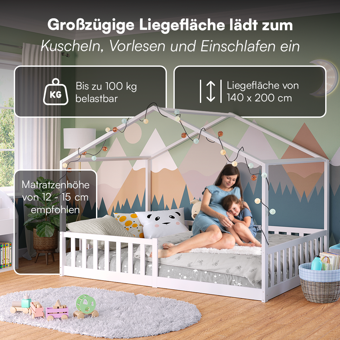 Bia Hausbett inkl. Lattenrost und Rausfallschutz, 140x200 cm, weiß lackiert, mit Matratze