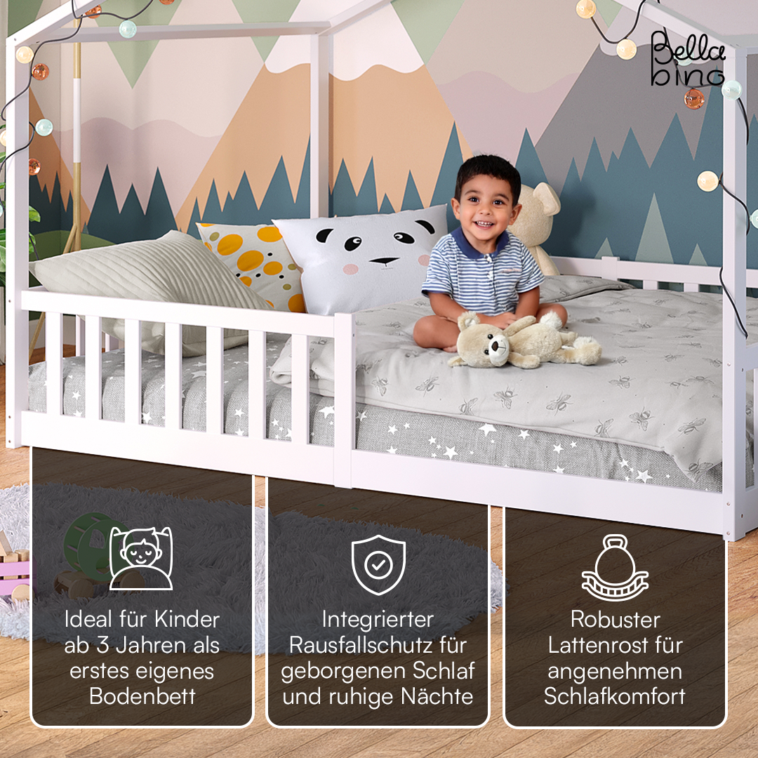 Das Hausbett Bia von Bellabino ist die perfekte Schlaflösung für Kinder, die eigenständig ins Bett gehen möchten. Die niedrige Betthöhe ermöglicht ein sicheres Ein- und Aussteigen, während die charmante Hausform das Bett zu einem Blickfang in jedem Kinderzimmer macht.