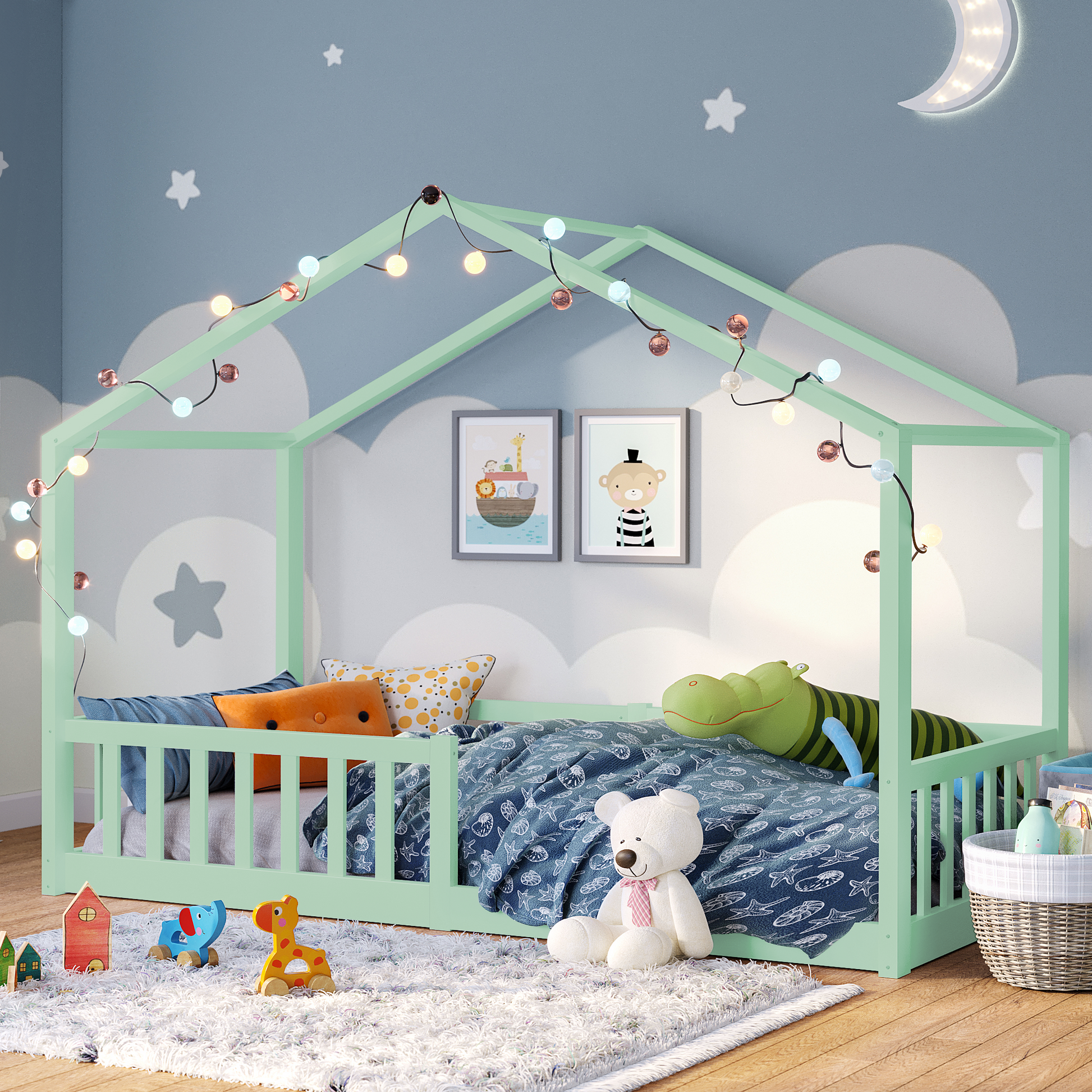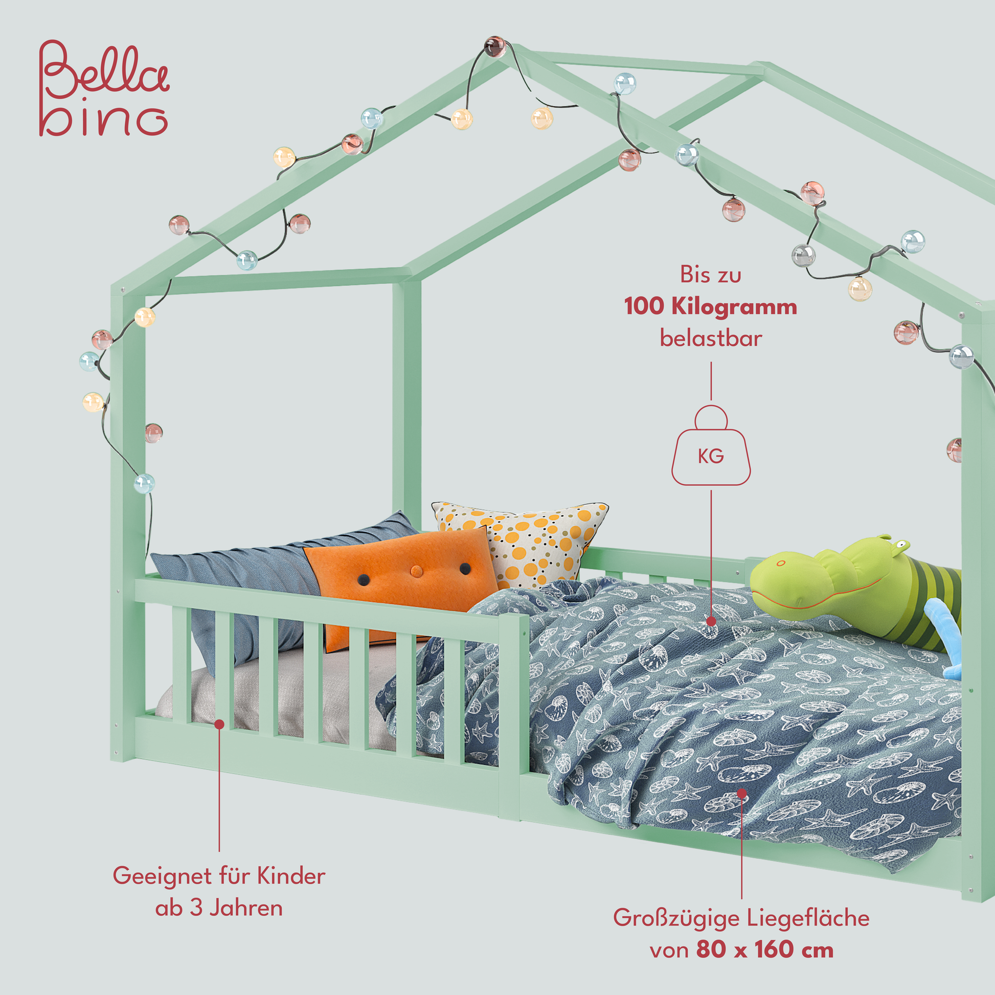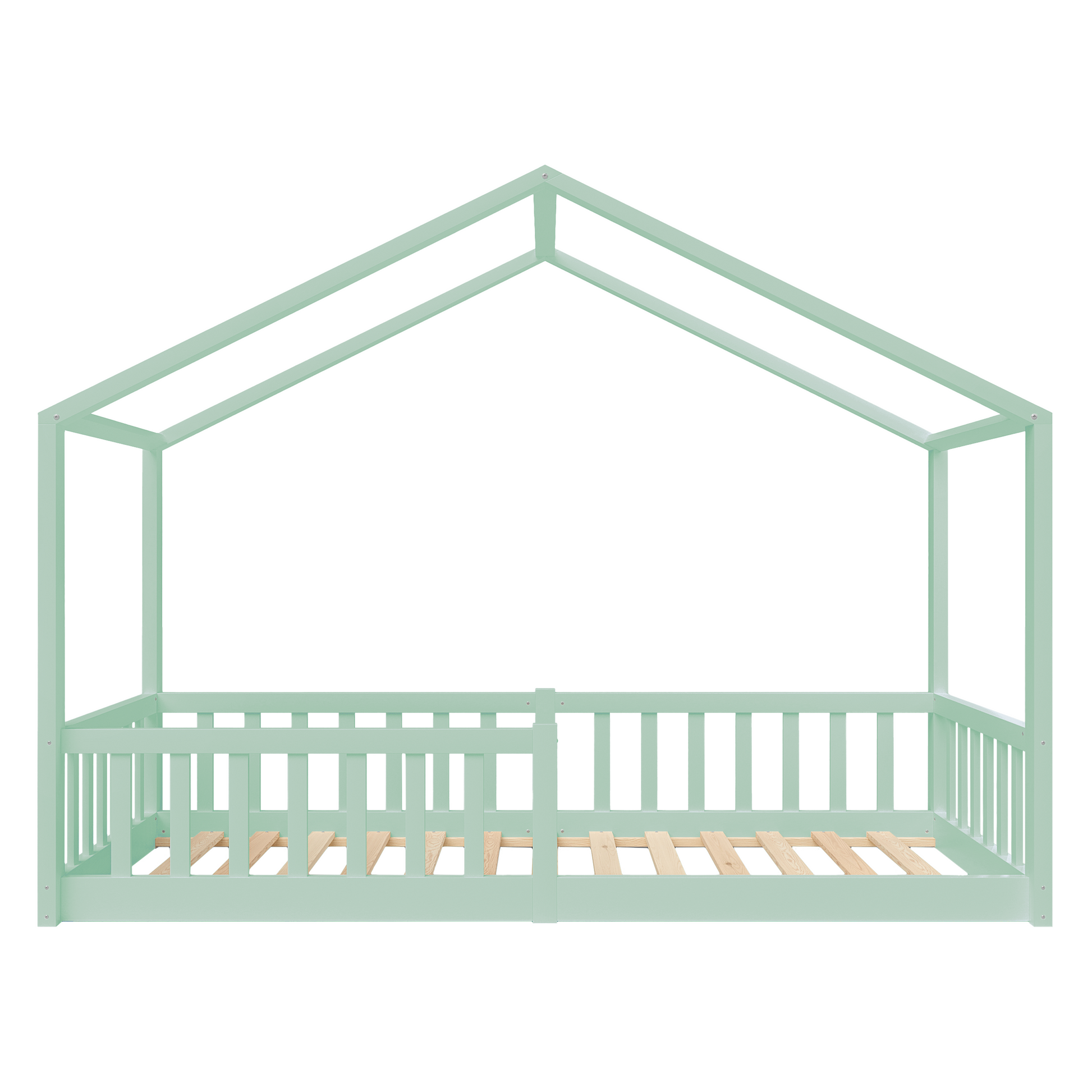 Bia Hausbett inkl. Lattenrost und Rausfallschutz, 80x160 cm, mintgrün lackiert
