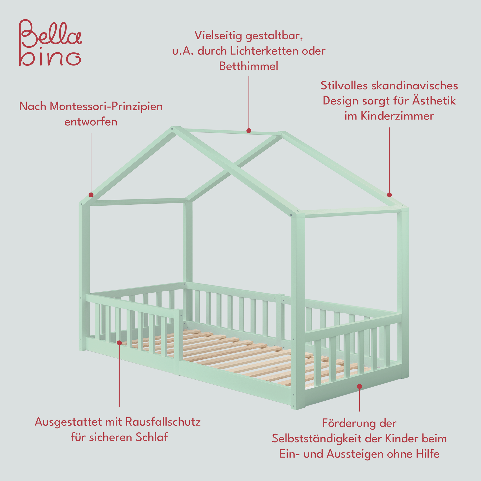Das Bellabino Hausbett 'Bia' ist die ideale Schlafmöglichkeit für Kinder ab 3 Jahren, die aus ihrem Babybett herausgewachsen sind und in ein richtiges Kinderbett umziehen möchten. Dieses Kinderbett wird direkt auf den Boden gelegt, was eine niedrige Betthöhe ermöglicht und es den Kindern leicht macht, eigenständig einzusteigen, ohne auf die Hilfe der Eltern angewiesen zu sein.