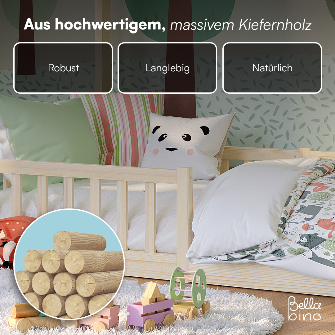 Das Bellabino Hausbett 'Bia' ist die ideale Schlafmöglichkeit für Kinder ab 3 Jahren, die aus ihrem Babybett herausgewachsen sind und in ein richtiges Kinderbett umziehen möchten. Dieses Kinderbett wird direkt auf den Boden gelegt, was eine niedrige Betthöhe ermöglicht und es den Kindern leicht macht, eigenständig einzusteigen, ohne auf die Hilfe der Eltern angewiesen zu sein.