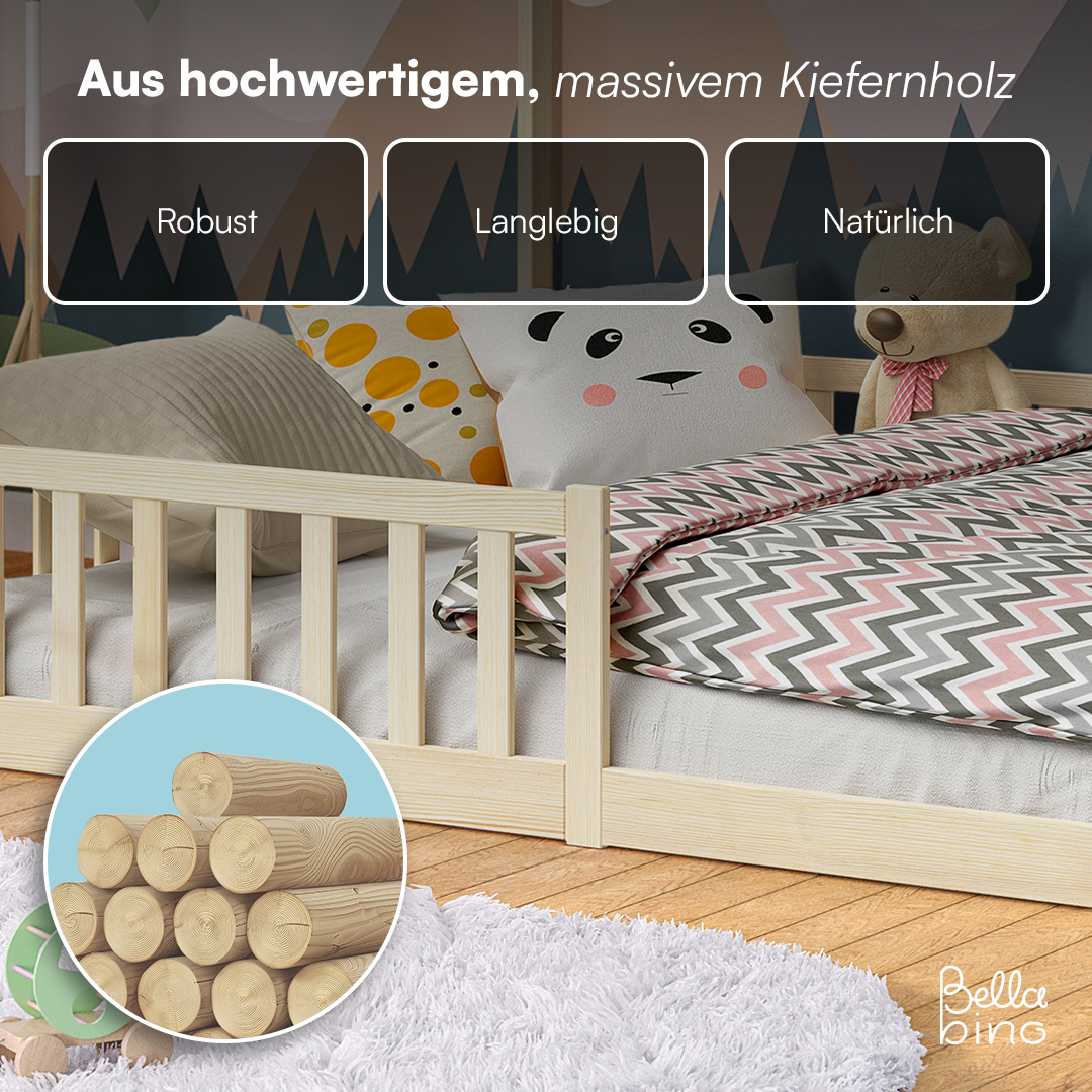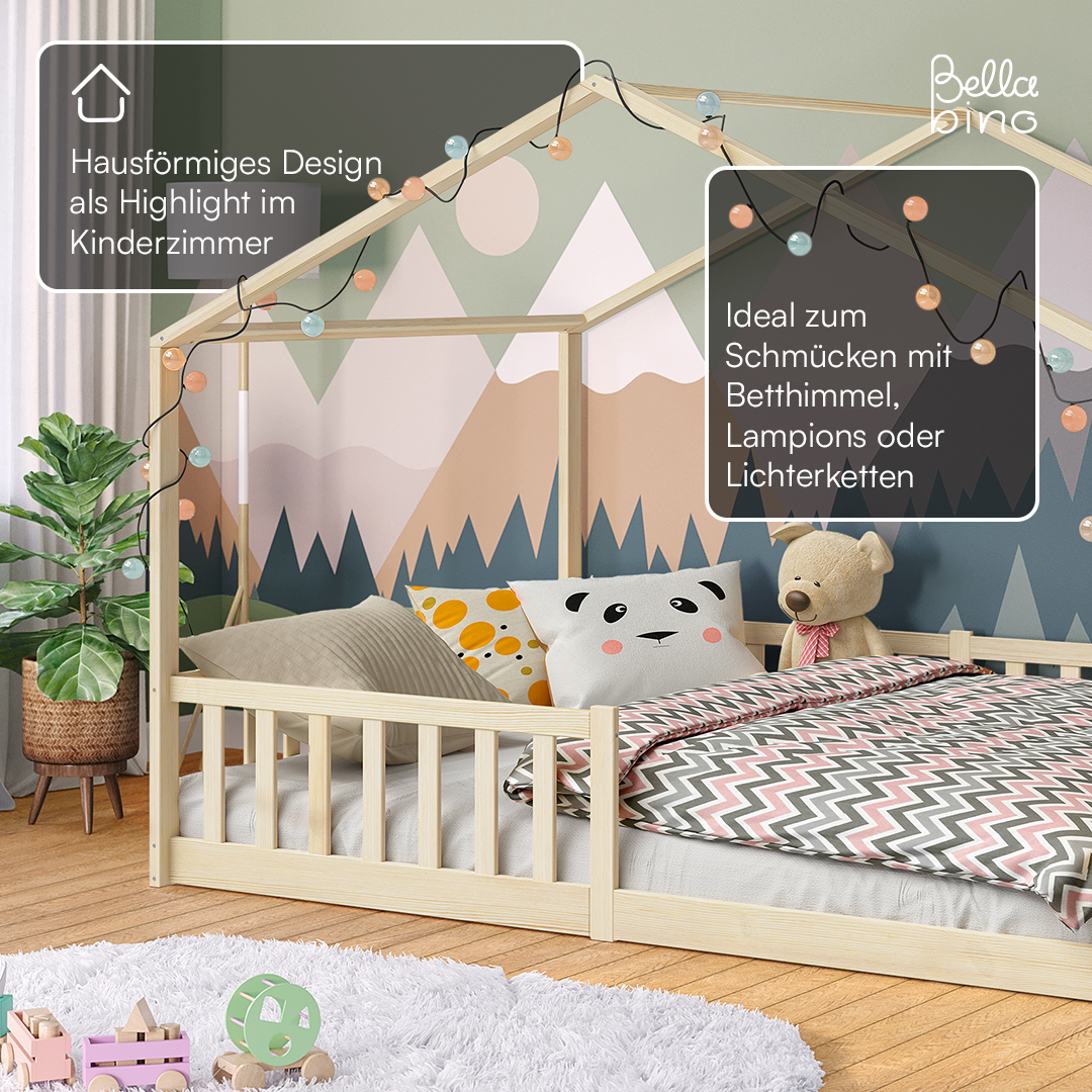 Das Bellabino Hausbett 'Bia' ist die ideale Schlafmöglichkeit für Kinder ab 3 Jahren, die aus ihrem Babybett herausgewachsen sind und in ein richtiges Kinderbett umziehen möchten. Dieses Kinderbett wird direkt auf den Boden gelegt, was eine niedrige Betthöhe ermöglicht und es den Kindern leicht macht, eigenständig einzusteigen, ohne auf die Hilfe der Eltern angewiesen zu sein.