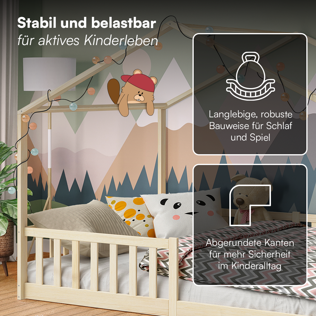 Das Bett besteht aus hochwertigem Massivholz und Holzwerkstoff in Natur und garantiert so eine robuste und langlebige Konstruktion. Es ist für eine maximale Belastung von 100 kg ausgelegt und bietet maximale Stabilität für Ihr heranwachsendes Kind. Das besondere Hausdesign verleiht dem Bett eine einzigartige Optik, die das Kinderzimmer in eine fantasievolle Spielumgebung verwandelt und eine angenehme Atmosphäre schafft.