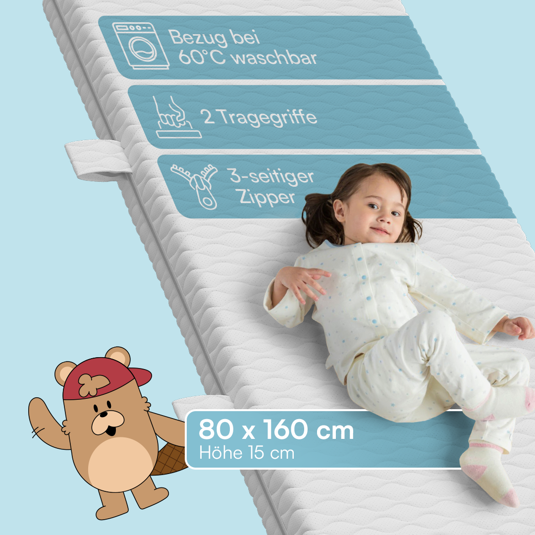 - Kinderseite mit 7-Zonen-Schnitt: Ab 2,5 Jahren sorgt die ergonomische Zonierung für optimale Anpassung und Unterstützung der Wirbelsäule bis ins Teenageralter.