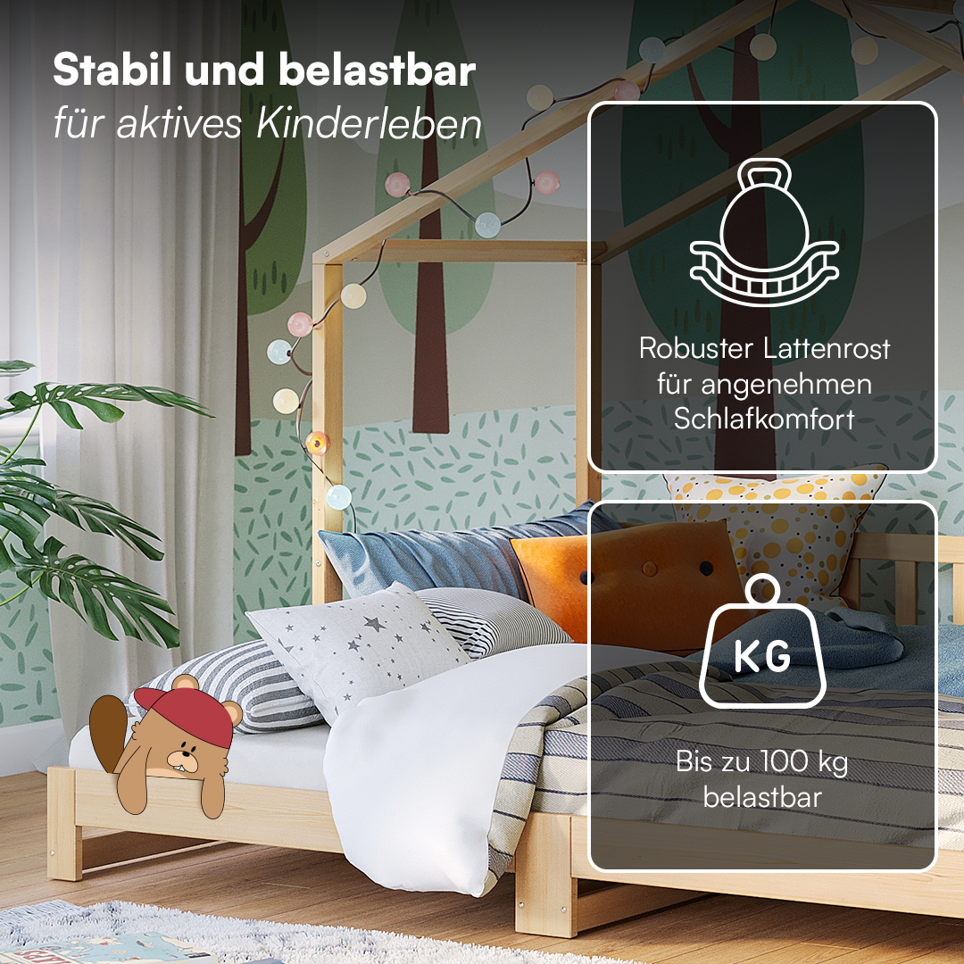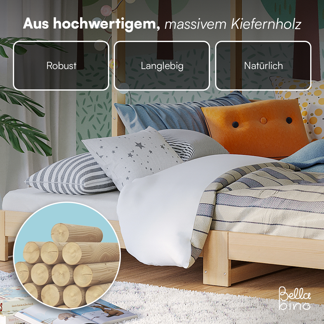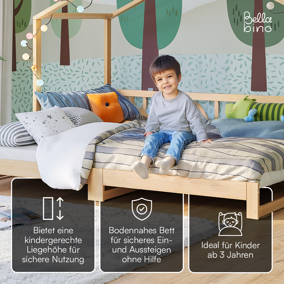 Das Hausbett „Bia“ von Bellabino wächst mit und lässt sich von 90x200 cm auf 180x200 cm erweitern – ideal für Geschwister, Gäste oder einfach mehr Platz zum Kuscheln. Die niedrige Bauweise ermöglicht Kleinkindern einen sicheren, selbstständigen Einstieg und fördert ihre Unabhängigkeit. Die Hausform schafft eine gemütliche Rückzugsecke zum Schlafen, Spielen oder Träumen. Gefertigt aus massivem Kiefernholz, ist das Bett bis 100 kg belastbar und überzeugt durch stabile, langlebige Verarbeitung. Mit seinem zeitlosen Design passt „Bia“ in jedes Kinderzimmer – für Mädchen und Jungen gleichermaßen.