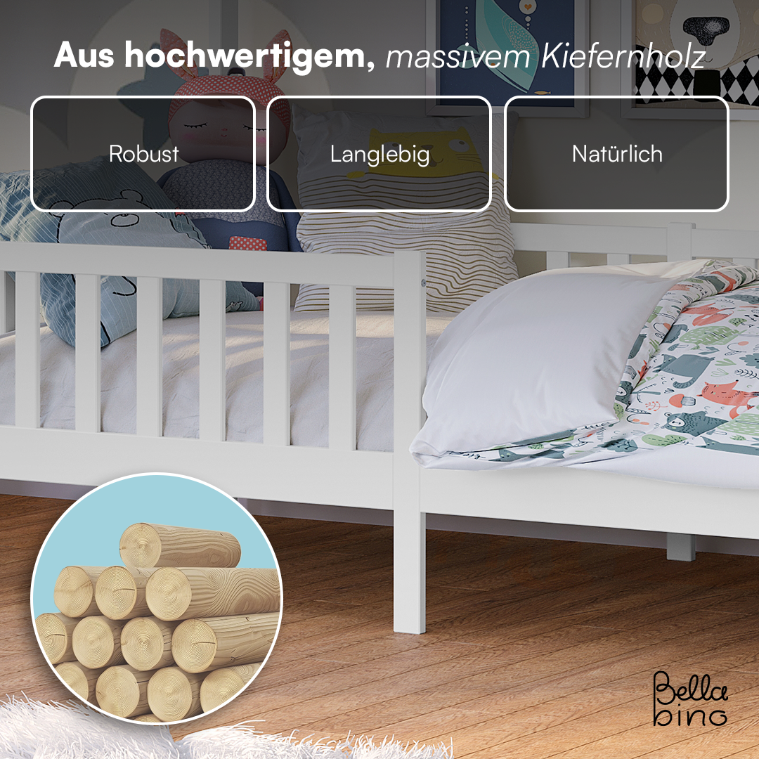Aus hochwertigen Materialien gefertigt, ist das Bett mit weißem Lack versehen und für eine Belastung von bis zu 100 kg ausgelegt – ideal auch für das Spielen.