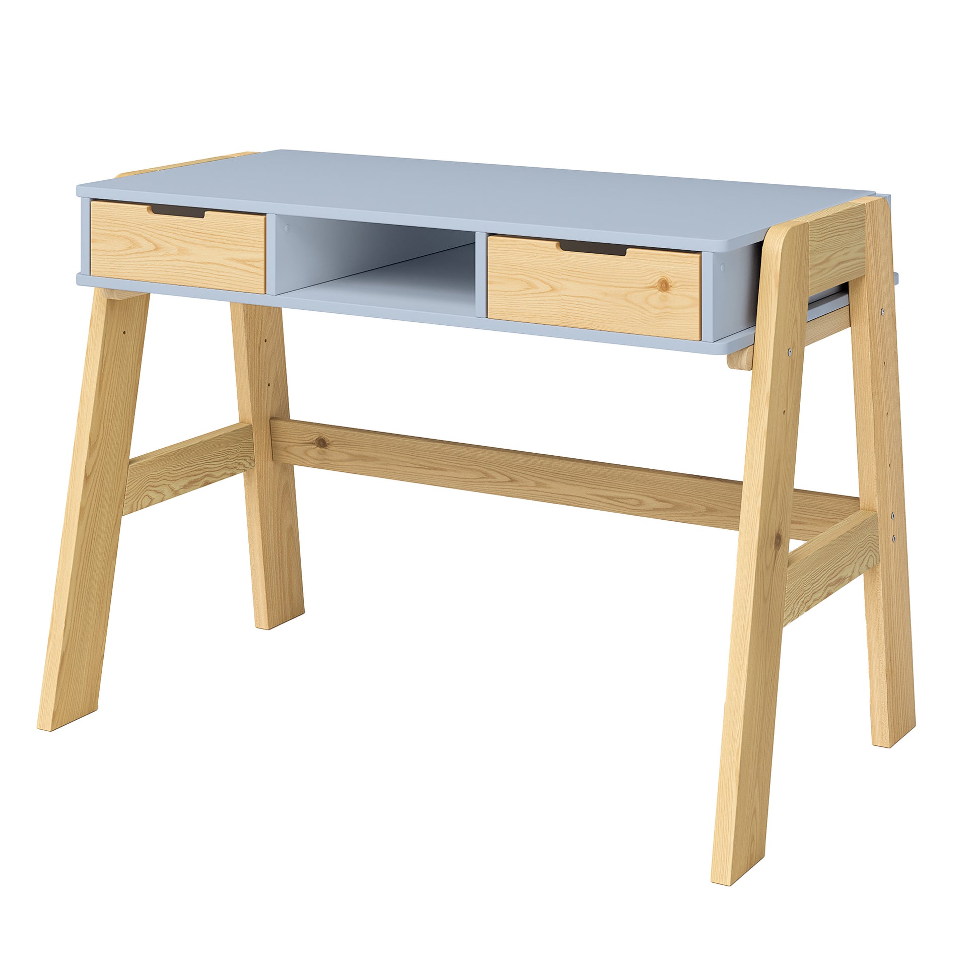 Der Kinderschreibtisch präsentiert sich in hochwertigem blauen Holzwerkstoff, was ihm Stabilität und Robustheit verleiht. Die Füße sind aus massivem Kiefernholz in Naturfarbe gefertigt, was 'Campo' eine moderne und dezente Optik verleiht.