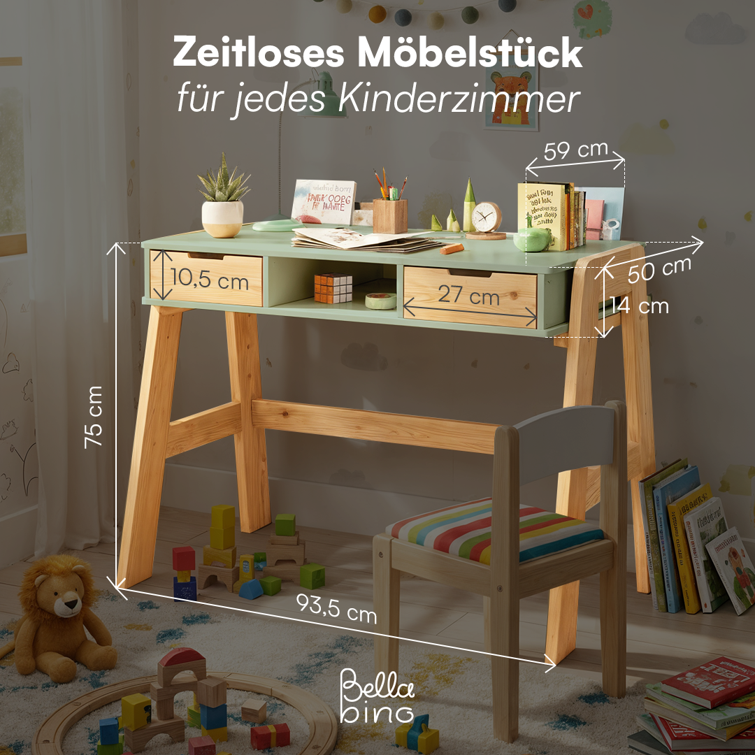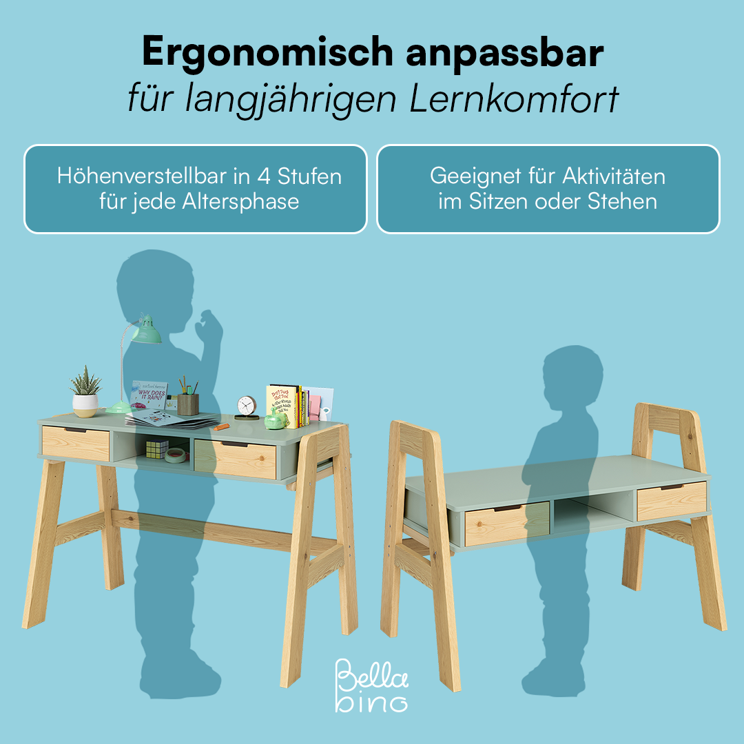 Campo Kinderschreibtisch, mintgrün/natur, 4-fach höhenverstellbar, mit 2 Schubladen, 1 Ablagefach und 3 Aufbewahrungsfächern, 75 x 63 x 93 cm
