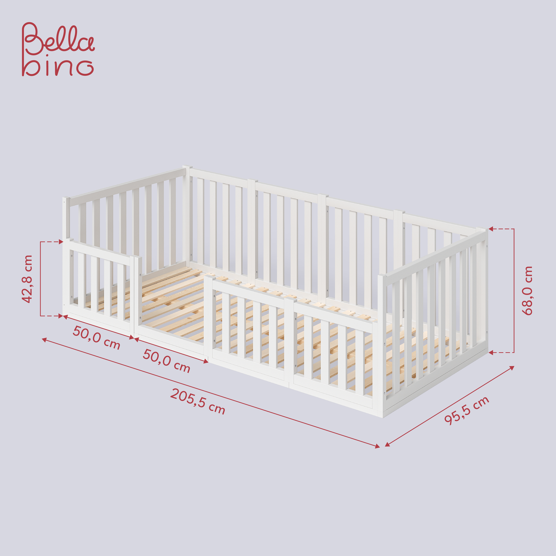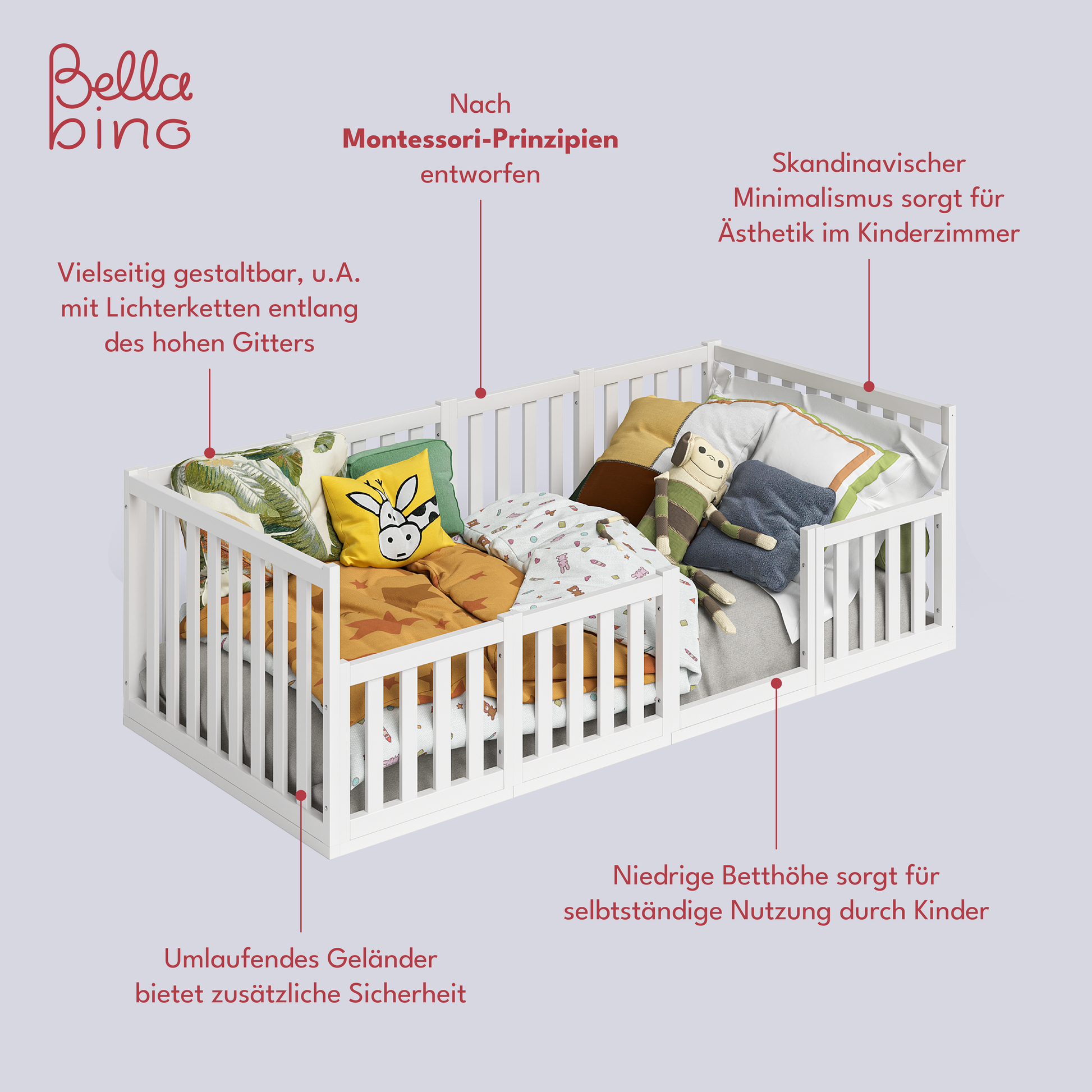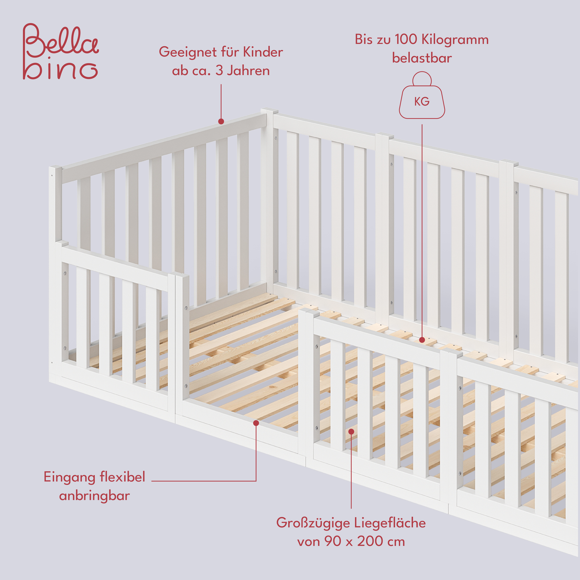 Die stabilen Streben des Bellabino-Bettes sind so konzipiert, dass sie maximale Sicherheit gewährleisten, und der Rausfallschutz entlang des Bettes sorgt für einen sorgenfreien Schlaf. Das Bett kann mit bis zu 100 kg belastet werden, was es Eltern ermöglicht, sich ohne Bedenken zu ihren Kindern zu legen, um gemeinsam eine Gute-Nacht-Geschichte zu lesen oder kostbare Momente zu teilen.
