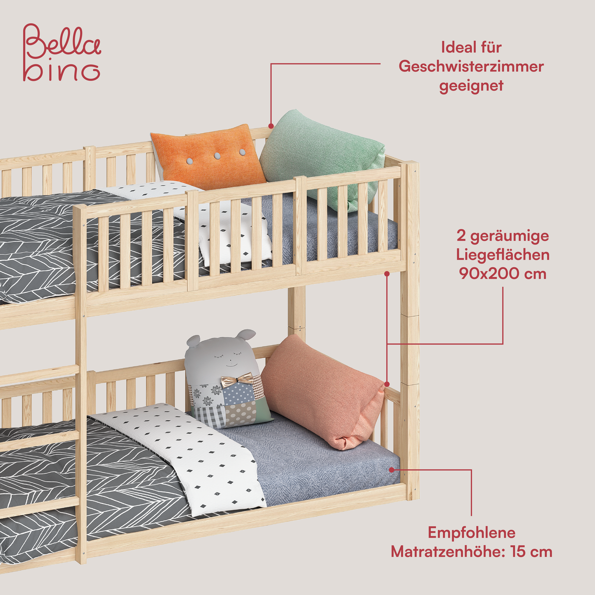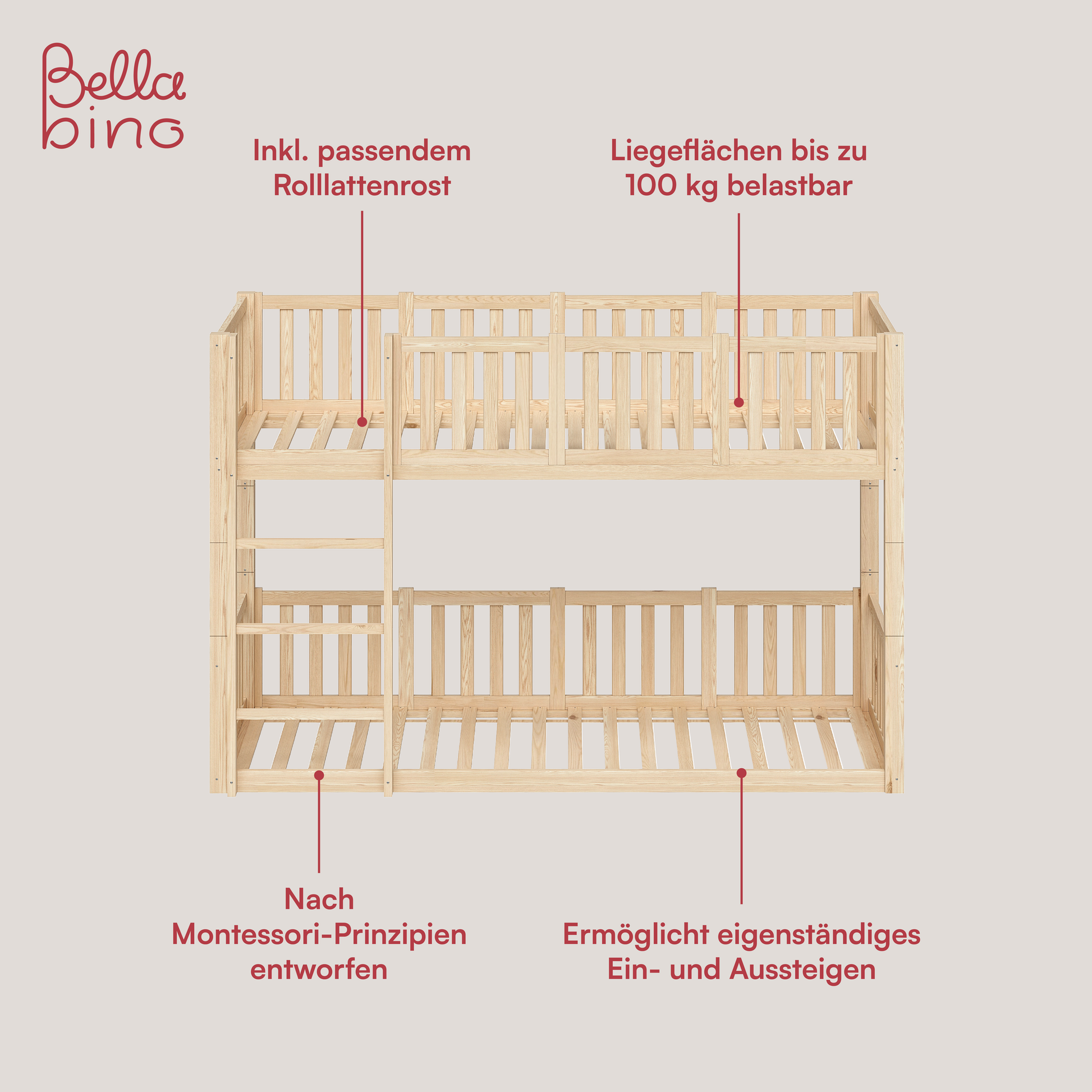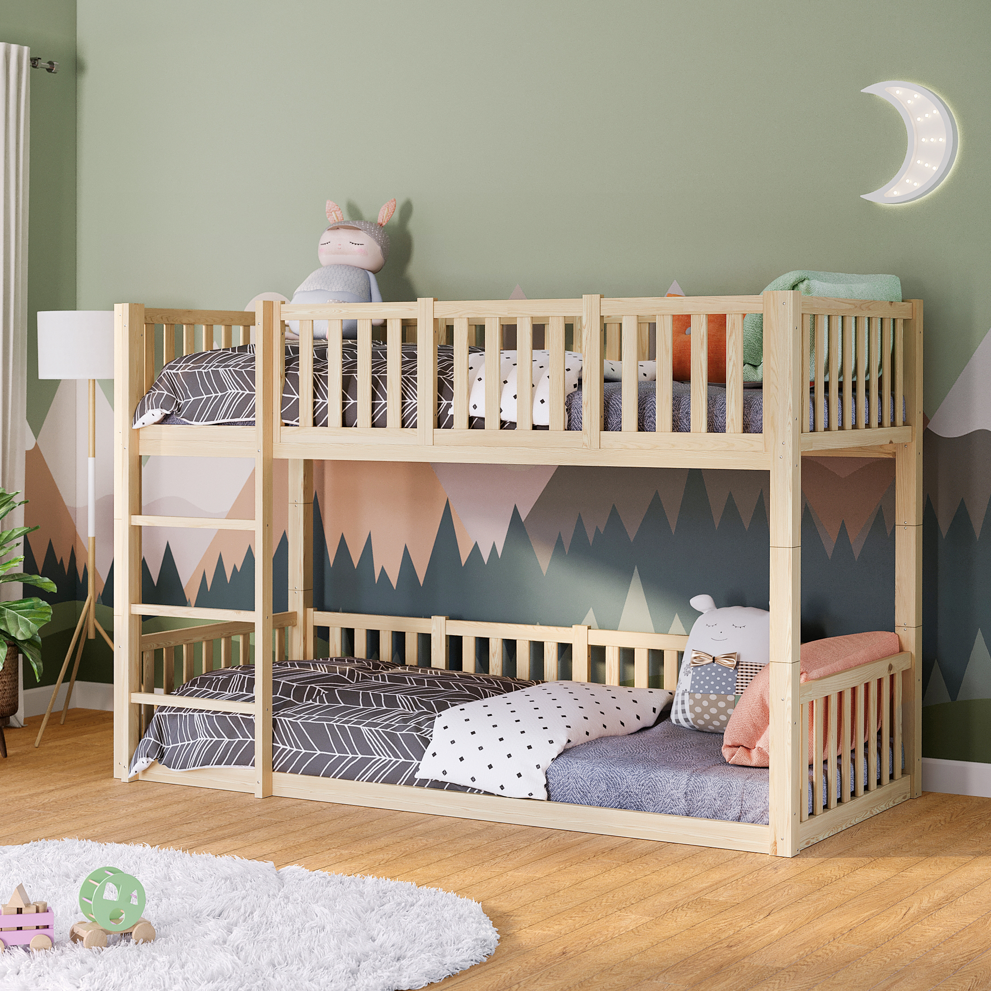 Gefertigt aus massivem Kiefernholz, überzeugt „Erie“ durch Stabilität, Sicherheit und Langlebigkeit. Die hohe Belastbarkeit von bis zu 100 kg pro Liegefläche sowie die Sicherheitsgitter schaffen eine geschützte Schlafumgebung. Das Bodenbett unterstützt durch seinen niedrigen Einstieg die Selbstständigkeit kleiner Kinder nach Montessori-Prinzipien.