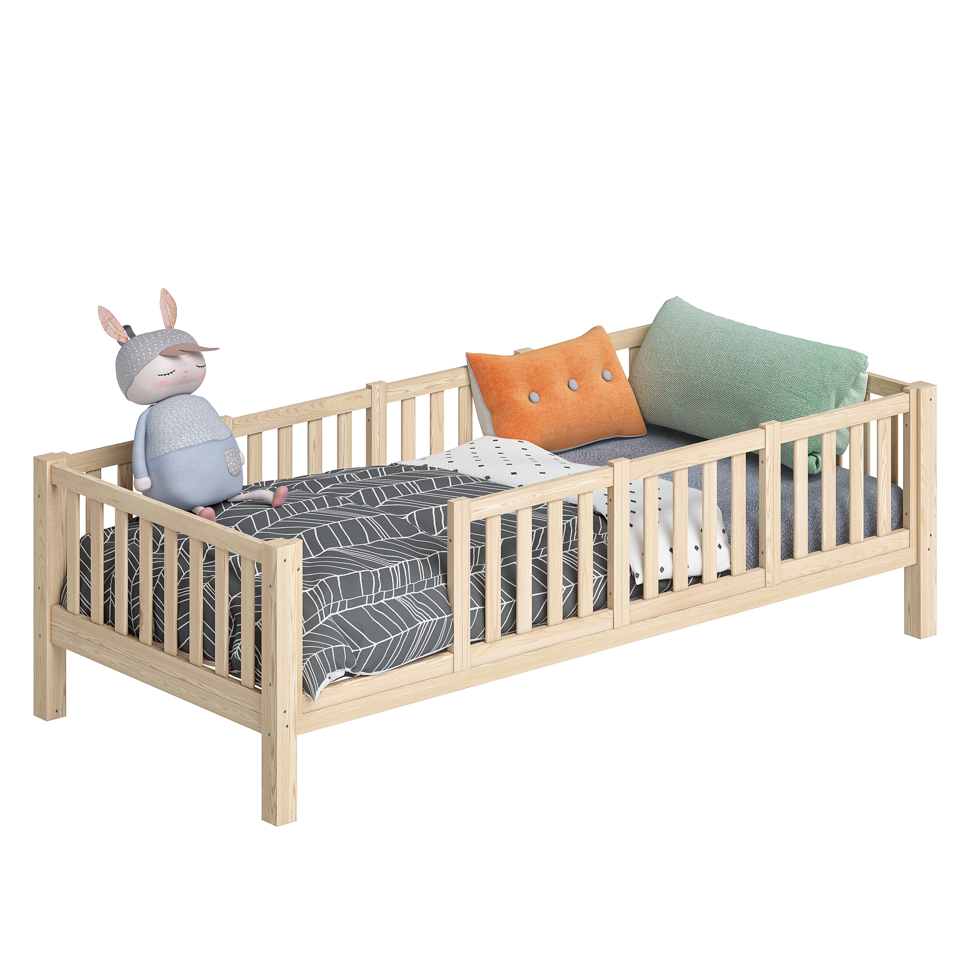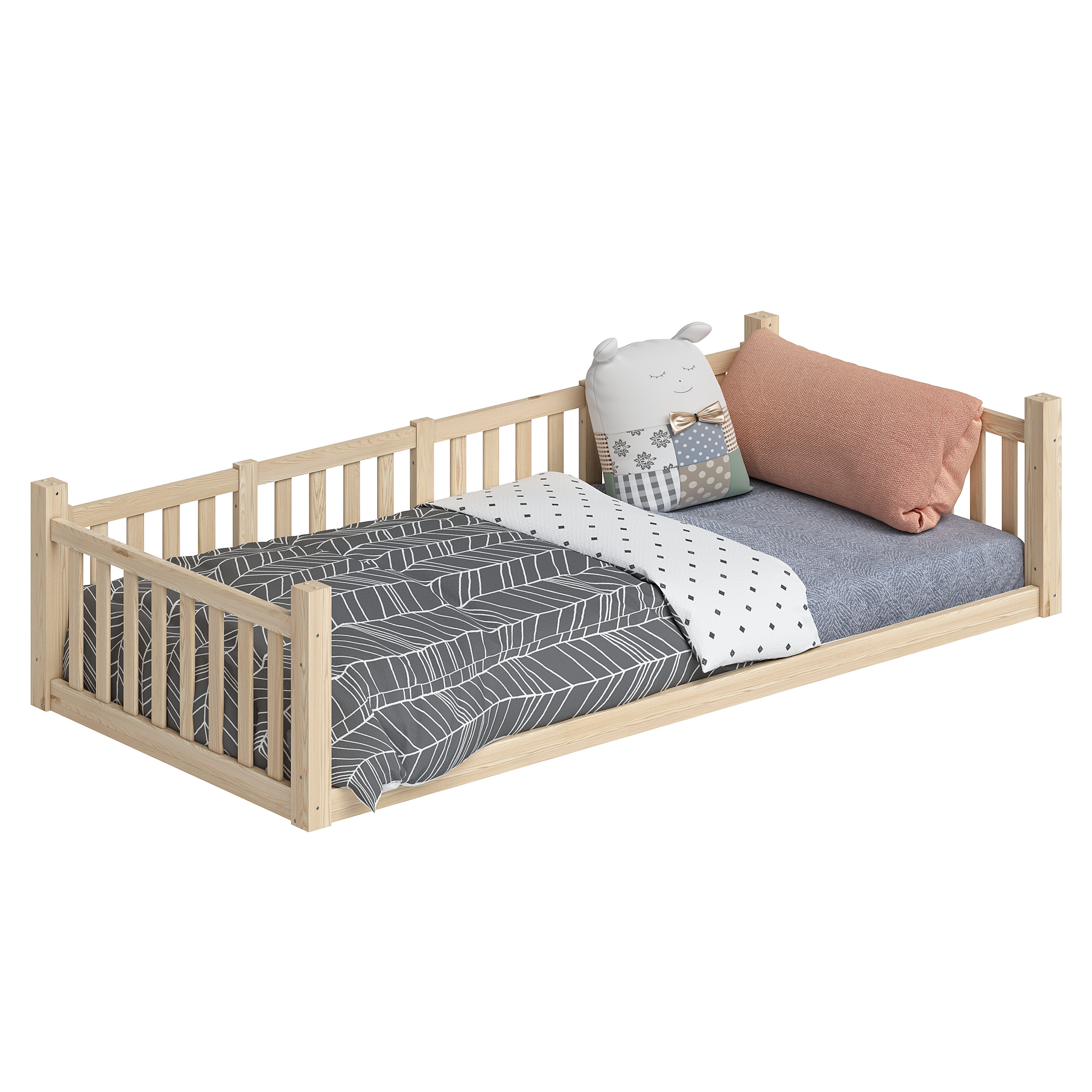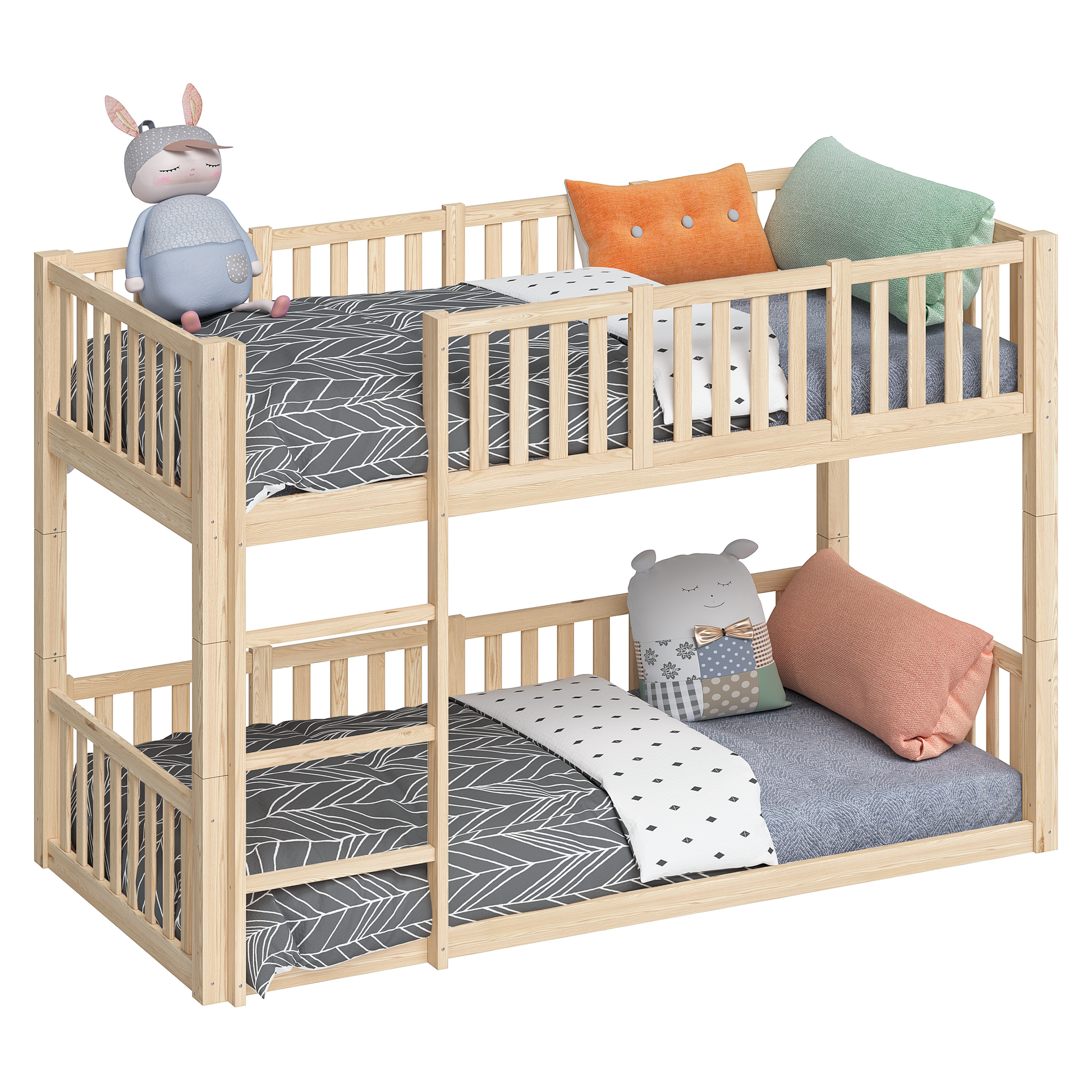 Gefertigt aus massivem Kiefernholz, überzeugt „Erie“ durch Stabilität, Sicherheit und Langlebigkeit. Die hohe Belastbarkeit von bis zu 100 kg pro Liegefläche sowie die Sicherheitsgitter schaffen eine geschützte Schlafumgebung. Das Bodenbett unterstützt durch seinen niedrigen Einstieg die Selbstständigkeit kleiner Kinder nach Montessori-Prinzipien.