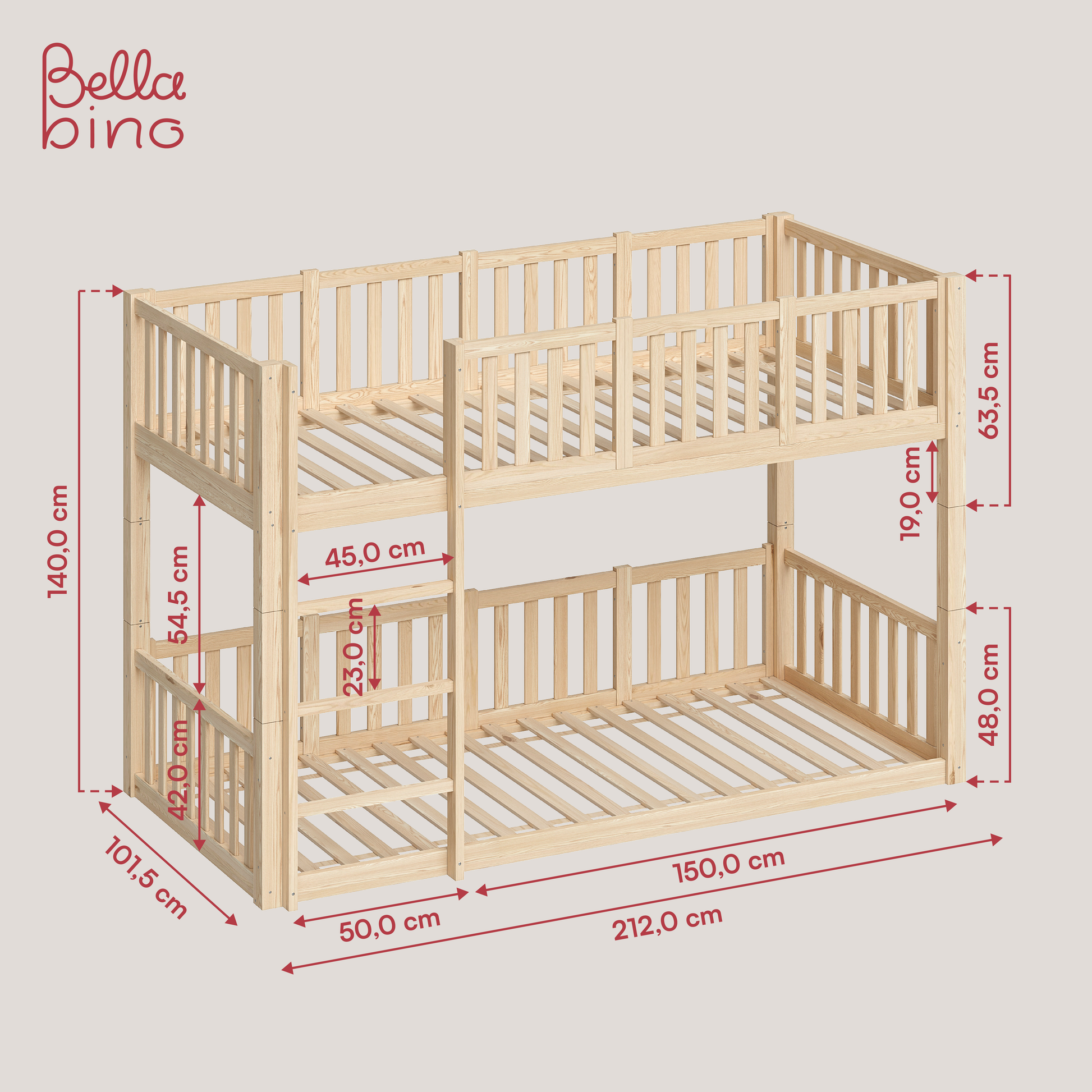 - Maße Etagenbett: H 140 x T 101 x B 212 cm