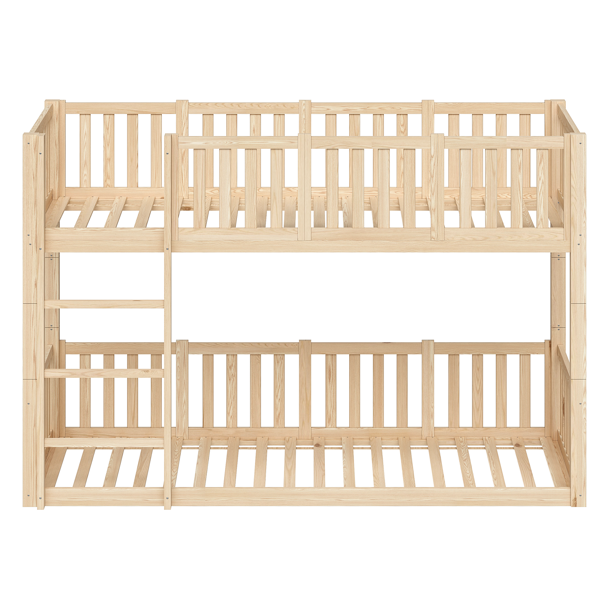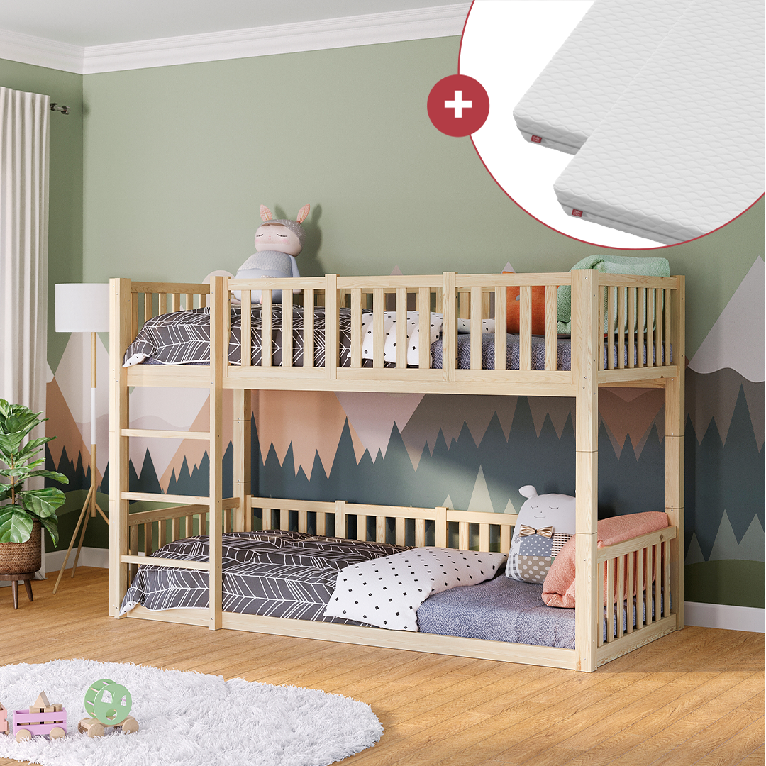 Erie Etagenbett inkl. Rausfallschutz und Lattenrost, 90x200 cm, natur lackiert, Kiefer Massivholz, umbaubar, mit 2 Matratzen