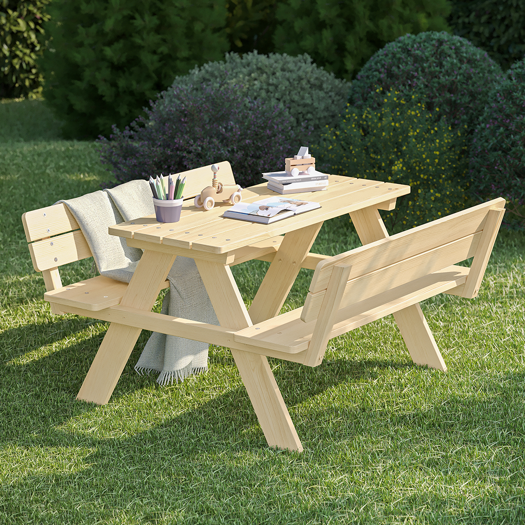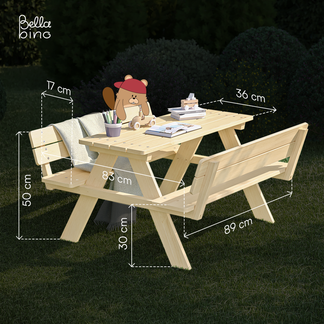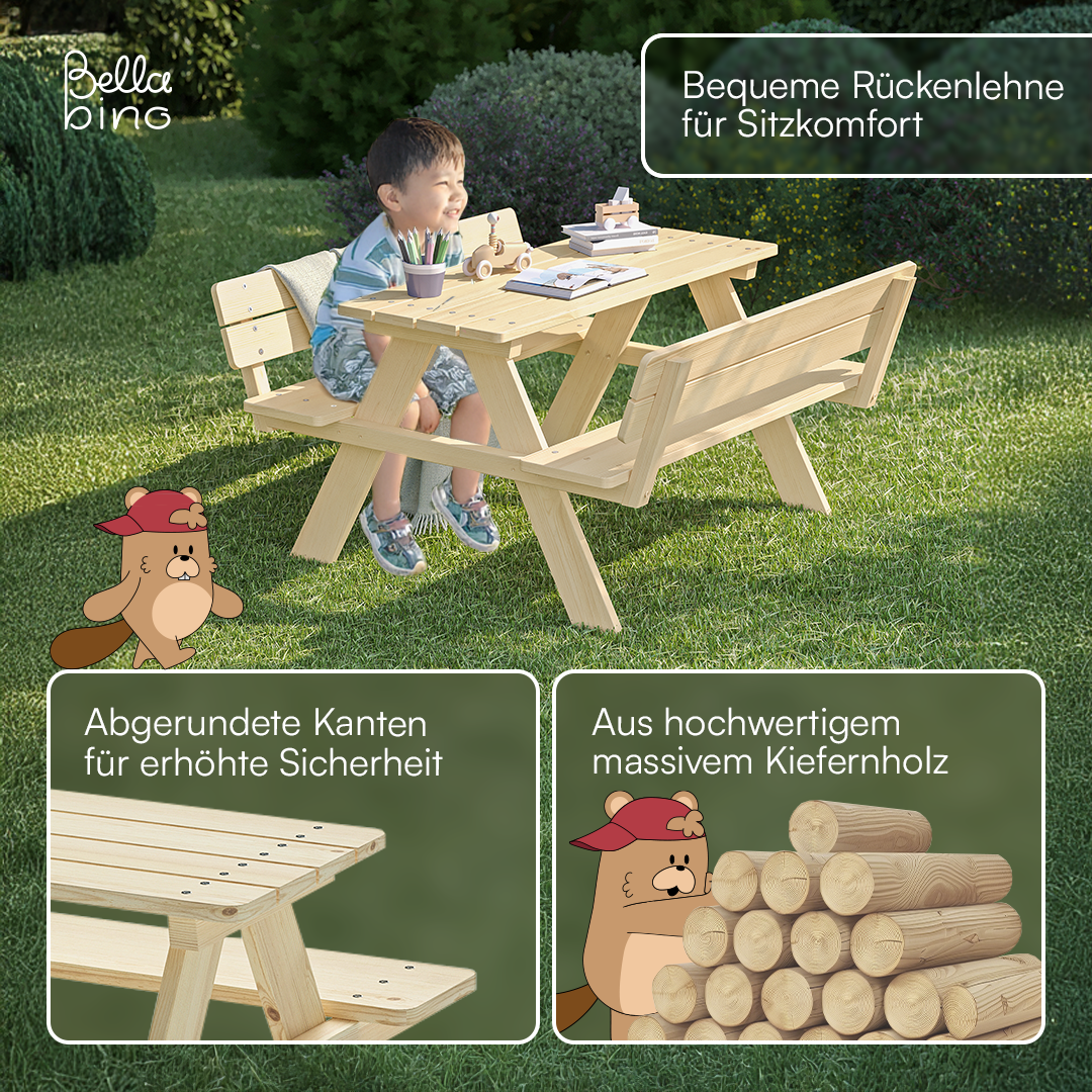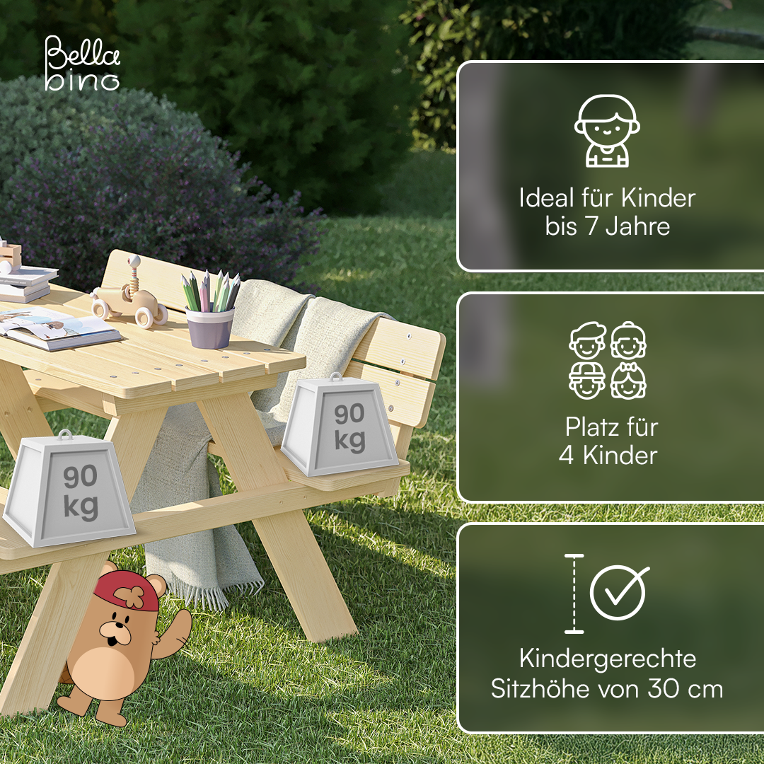 Die 'Inny' Kindersitzgruppe von Bellabino ist eine gemütliche und ansprechende Lösung für Ihre Kleinen im Freien. Sie besteht aus einem Tisch und zwei bequemen Bänken mit Rückenlehne, so haben die Kleinen Platz für Spielzeug, Bastelutensilien oder Snacks. Die kindgerechte Bauweise ermöglicht außerdem unabhängige Nutzung.