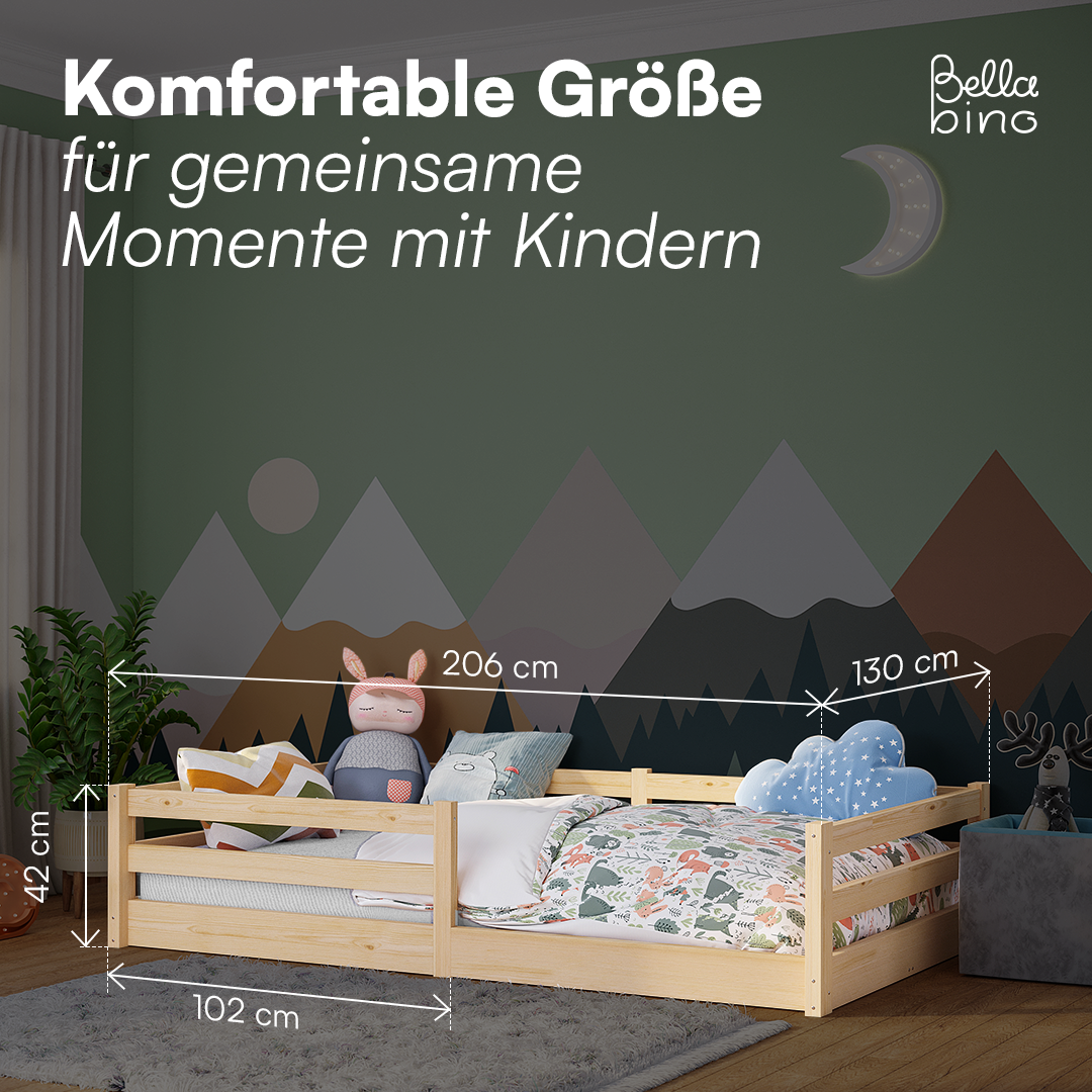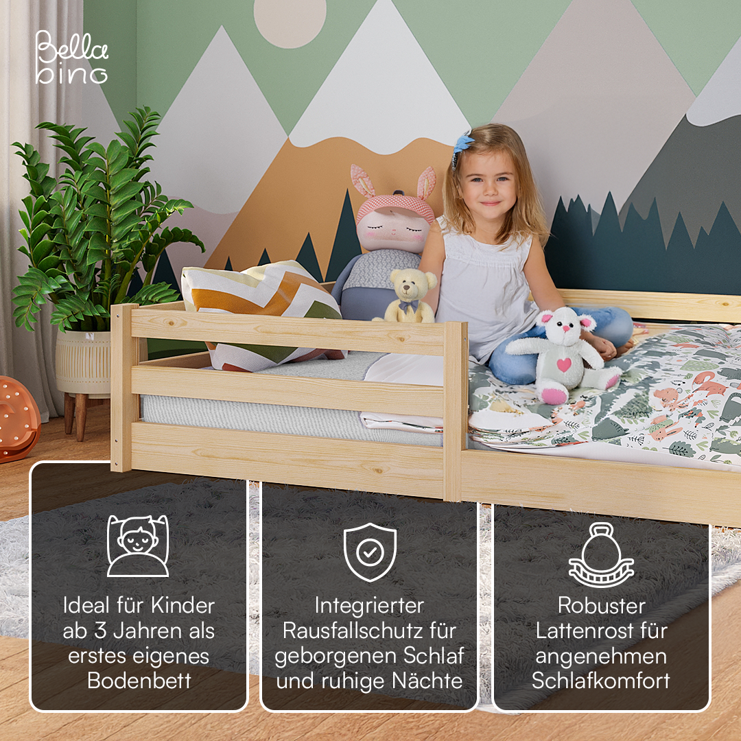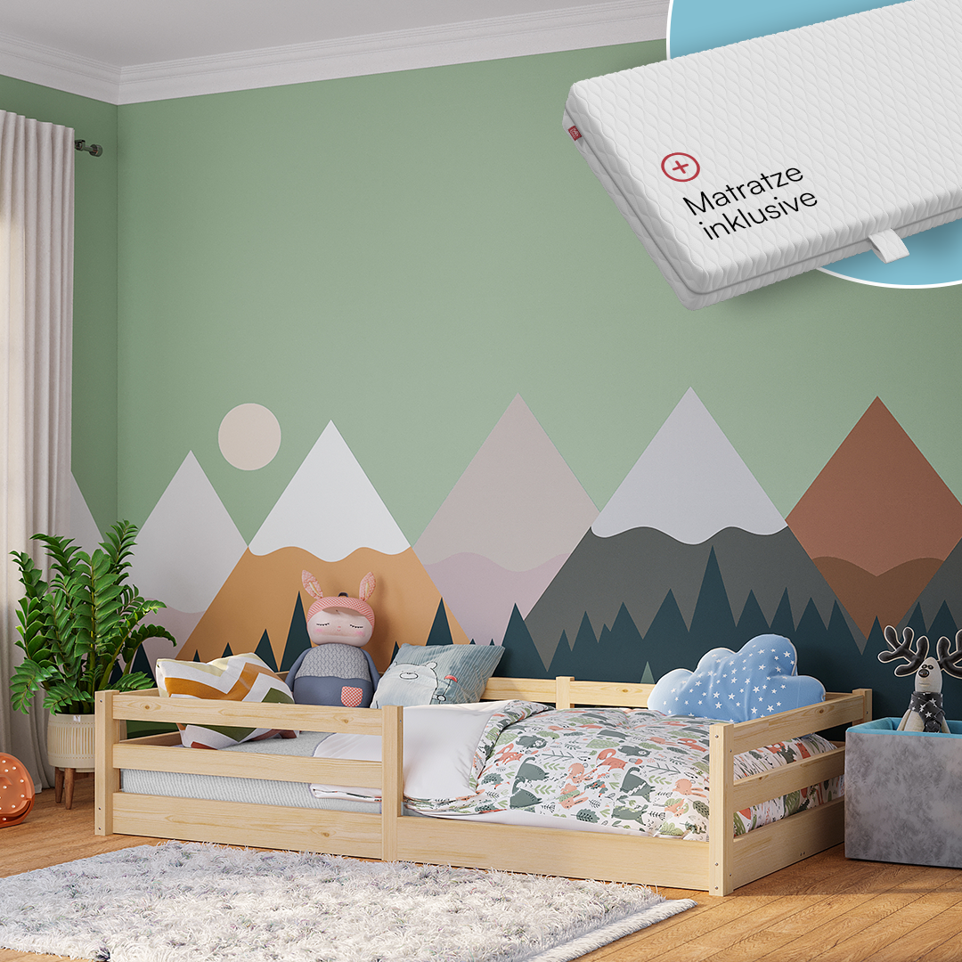 - Lieferumfang: Bodenbett inkl. Rausfallschutz, Lattenrost und Matratze