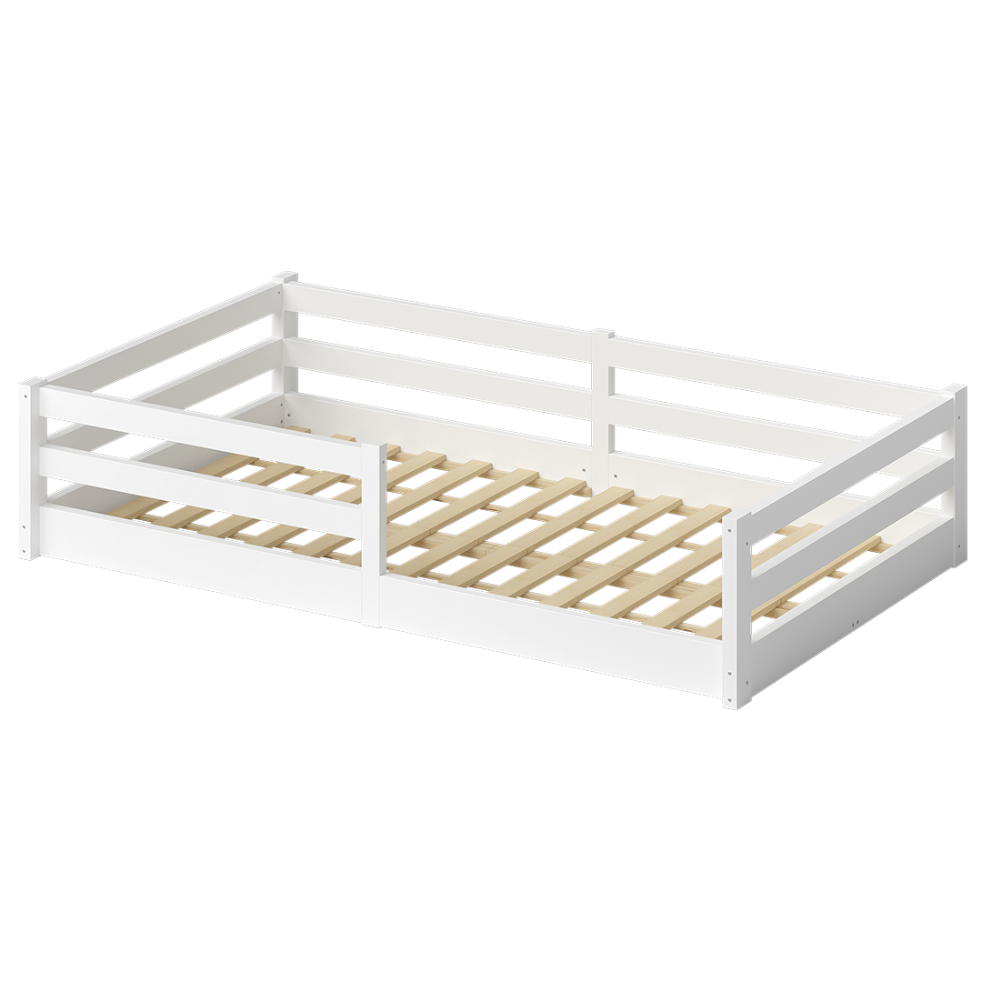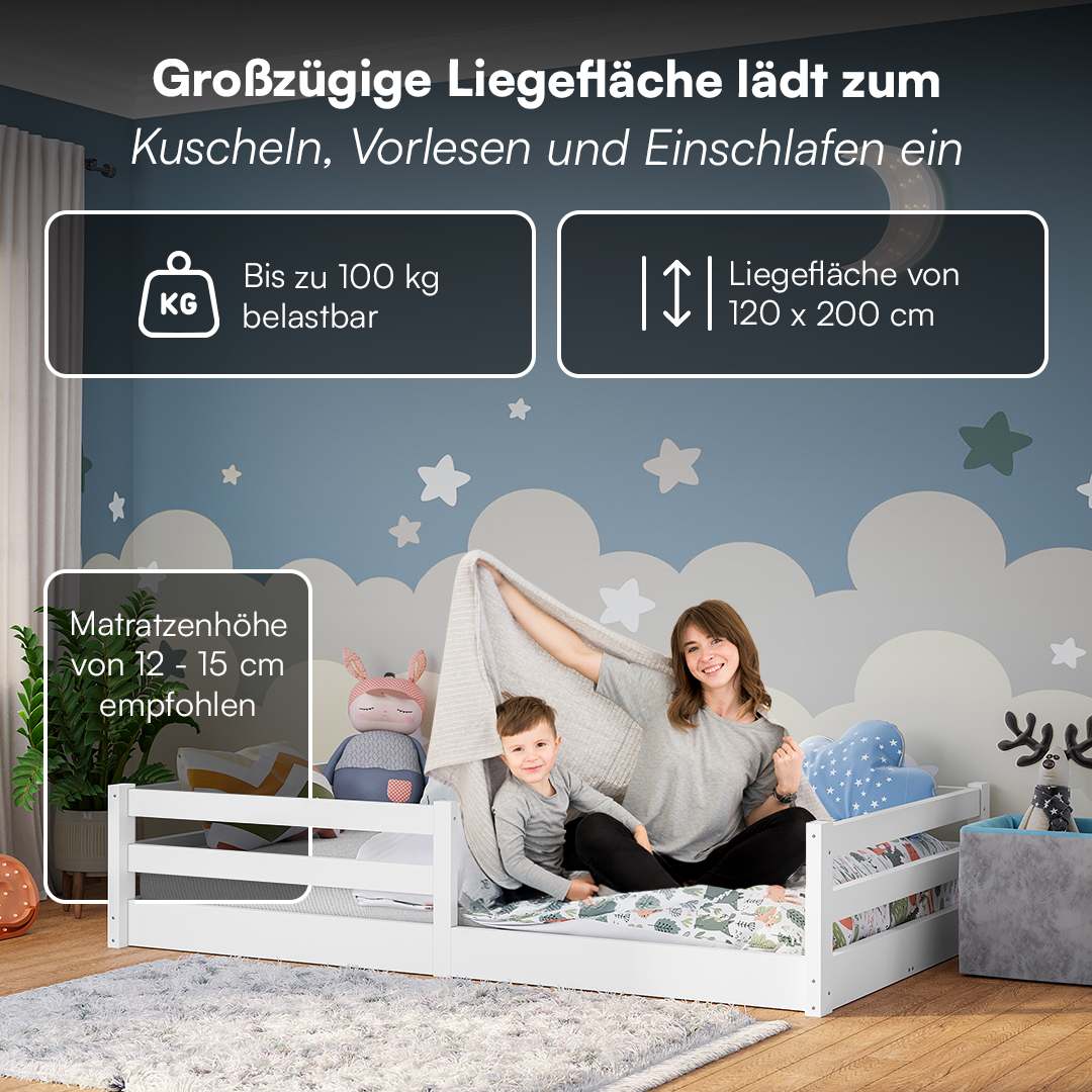 Iskri Bodenbett 120x200 cm mit Matratze, weiß, Massivholz Kiefer, Montessori Kinderbett mit Rausfallschutz und Lattenrost